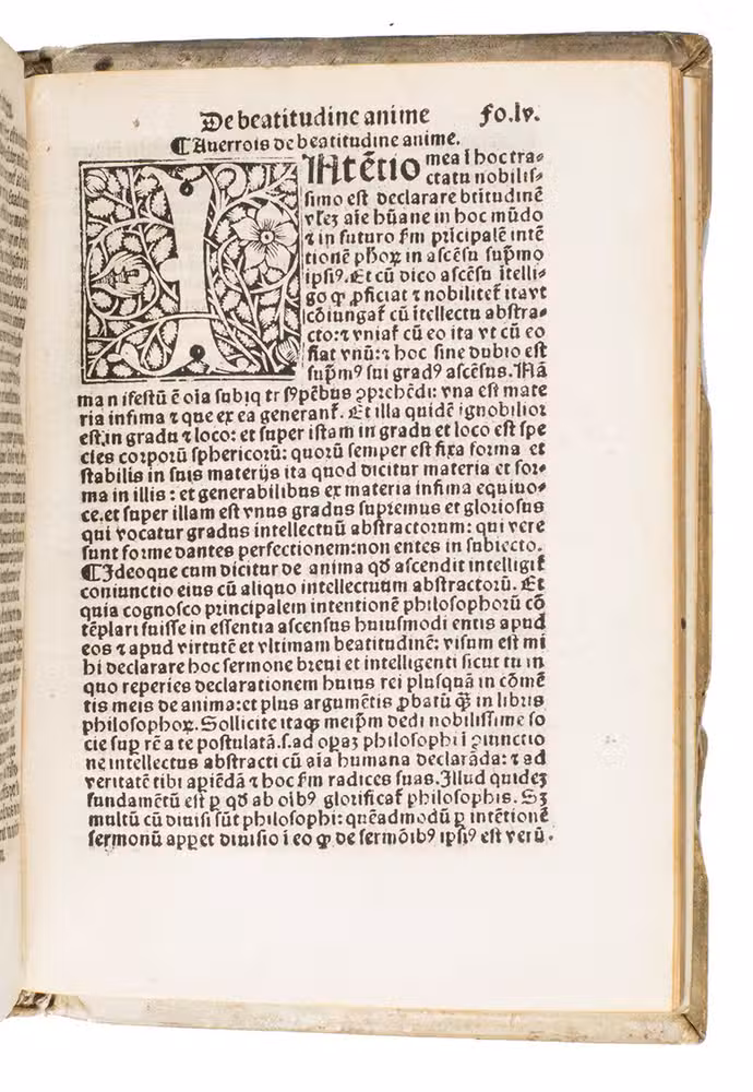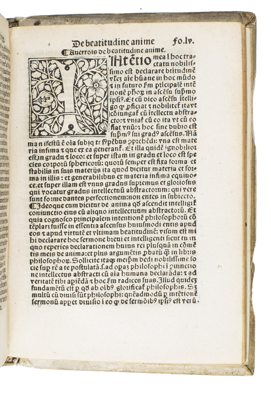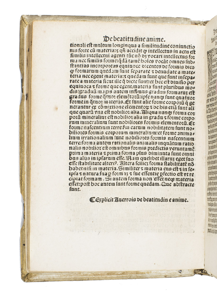 The three remaining treatises in the present work consist of a work by Alexander of Aphrodisias on the intellect, another by Averroes on the beauty of the soul, and a work by Achillini himself on universals. Vervliet, Vine leaf ornaments 54, cites the present edition as the first use of its ornament.