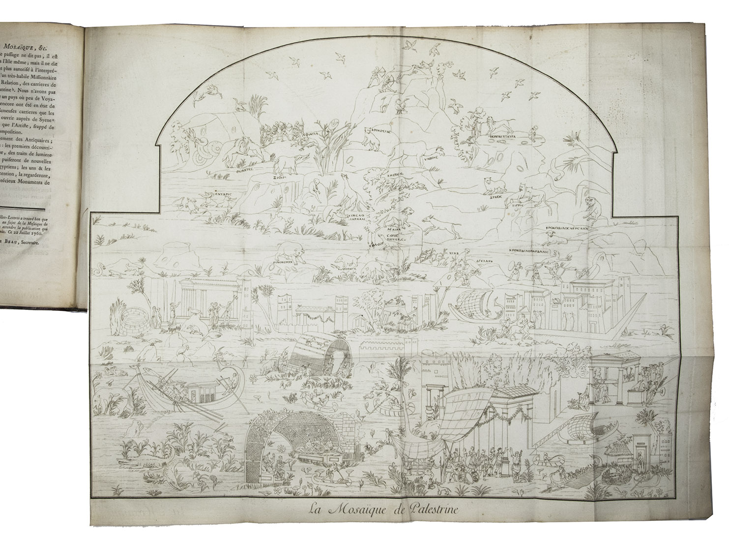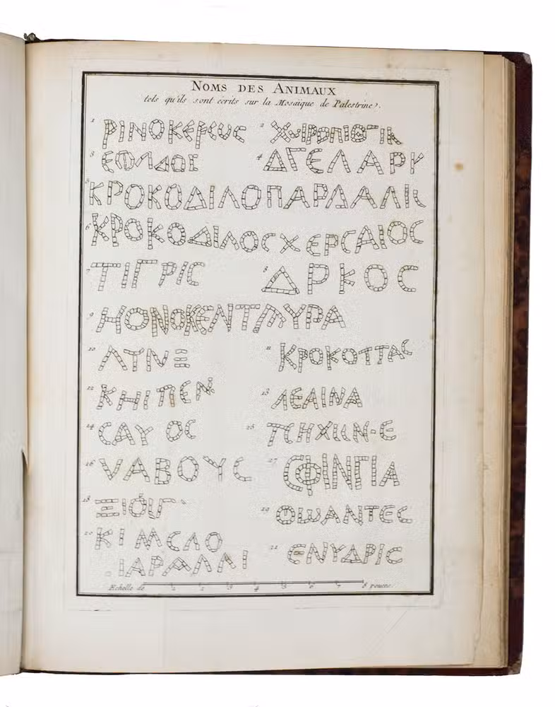 With 1 large folding engraved plate of the mosaic, 1 plate showing the names of animals written in the mosaic. Bound with it is an unrelated engraved plate on a 4to leaf, showing Samaritan medals (drawn and engraved by Poisson in 1790) that accompanied another one of Barthélemys publications.