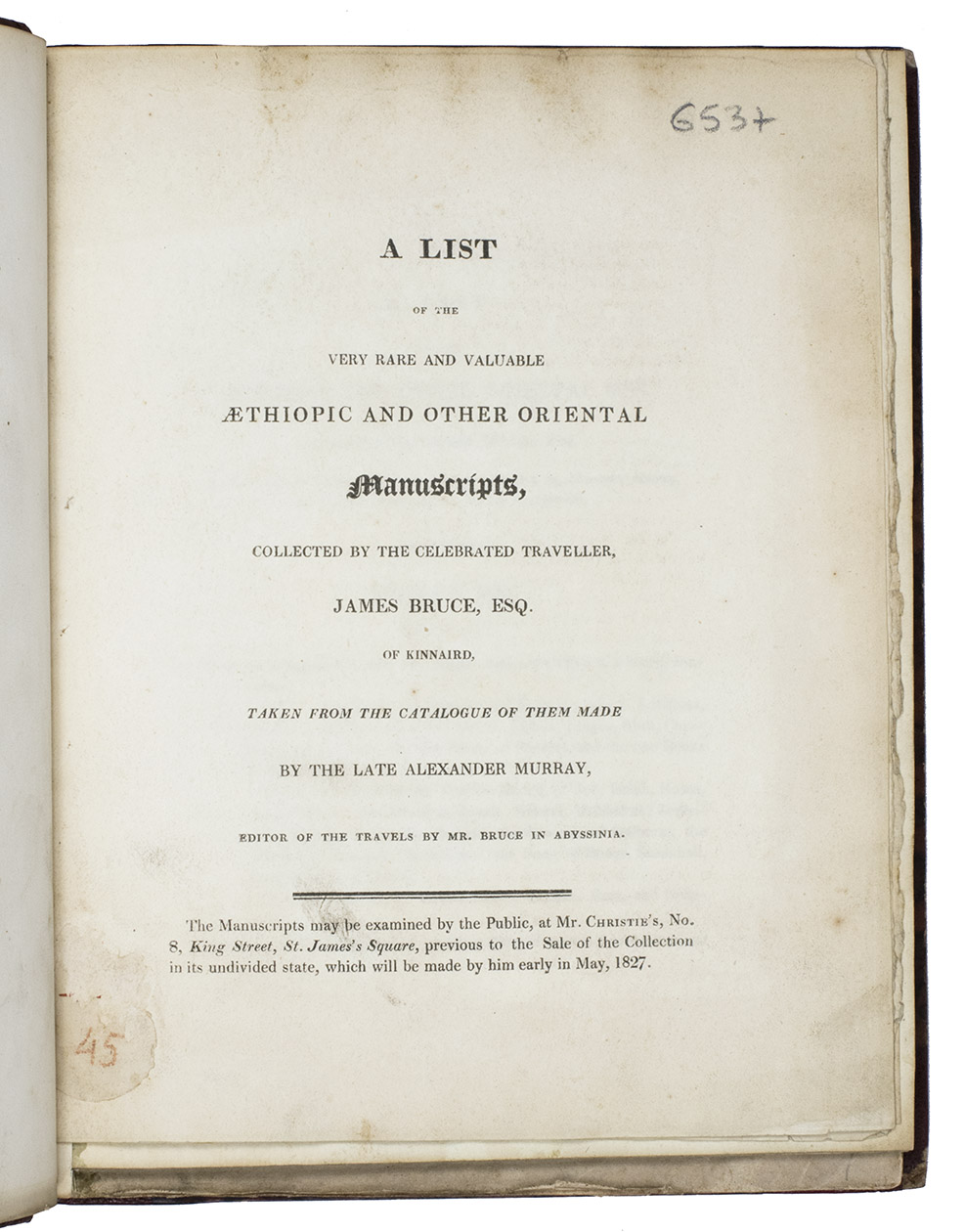 (1) [CHRISTIE'S - LONDON]. A list of the very rare and valuable Aethiopic and other oriental manuscripts, collected by the celebrated traveller, James Bruce, esq. of Kinnaird, taken from the catalogue of them made by the late Alexander Murray, editor of the travels by Mr. Bruce in Abyssinia.