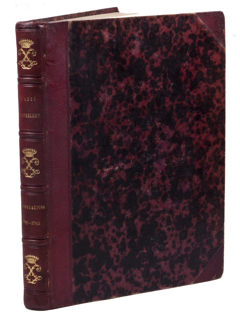 Mid-19th-century half red goatskin morocco, sewn on 4 supports, gold-tooled spine (blind-tooled fillets) with the cypher monogram of a French count in compartments 1, 3 & 5 and "labbé|Barthelemy" and "Dissertations|1760-1792" in mid-19th-century roman capitals across compartments 2 & 4, "agathe" chemical-marbled sides, Spanish-marbled endpapers, red sprinkled edges, green ribbon marker. 16; 43, [1 blank]; 24; 28, XIV; [2], 44; 12; 8; 12; [1], [1 blank], 45, [1 blank]; 9, [1 blank] pp.