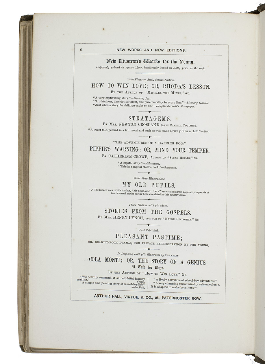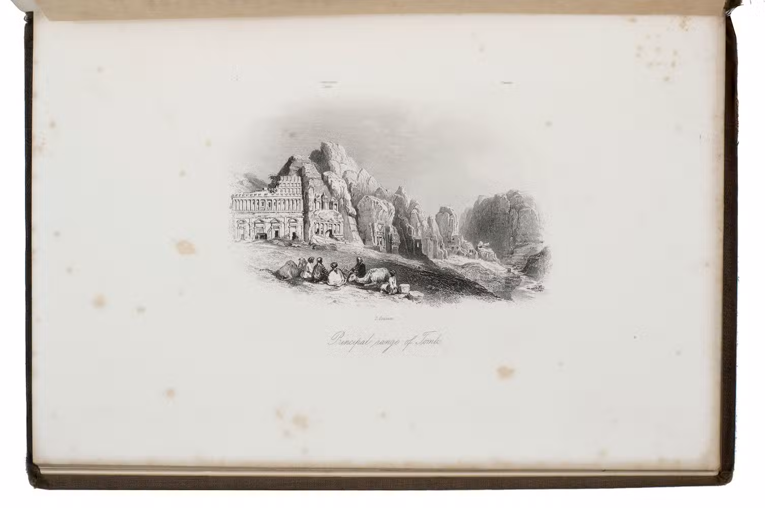 London, Arthur Hall & Co., [ca. 1862?]. 4to. With a steel engraved frontispiece: a view of Cairo and the valley of the Nile, and an engraved title-page with view on the Approach to Petra, typographic title-page, a folding map (228 x 264 mm) of "Arabia Petraea", embracing the Peninsula of Mount Sinai with the route taken by W. Hughes with a view of Suez in the lower left corner, 25 full page steel engraved plates with protective tissue paper by E. Brandard, J.C. Bently, J. Cousen, and A. Willmore, and 18 illustrations in the text by J. Cooper and others. Original dark purple gold-tooled buckram. vi, 204 pp.