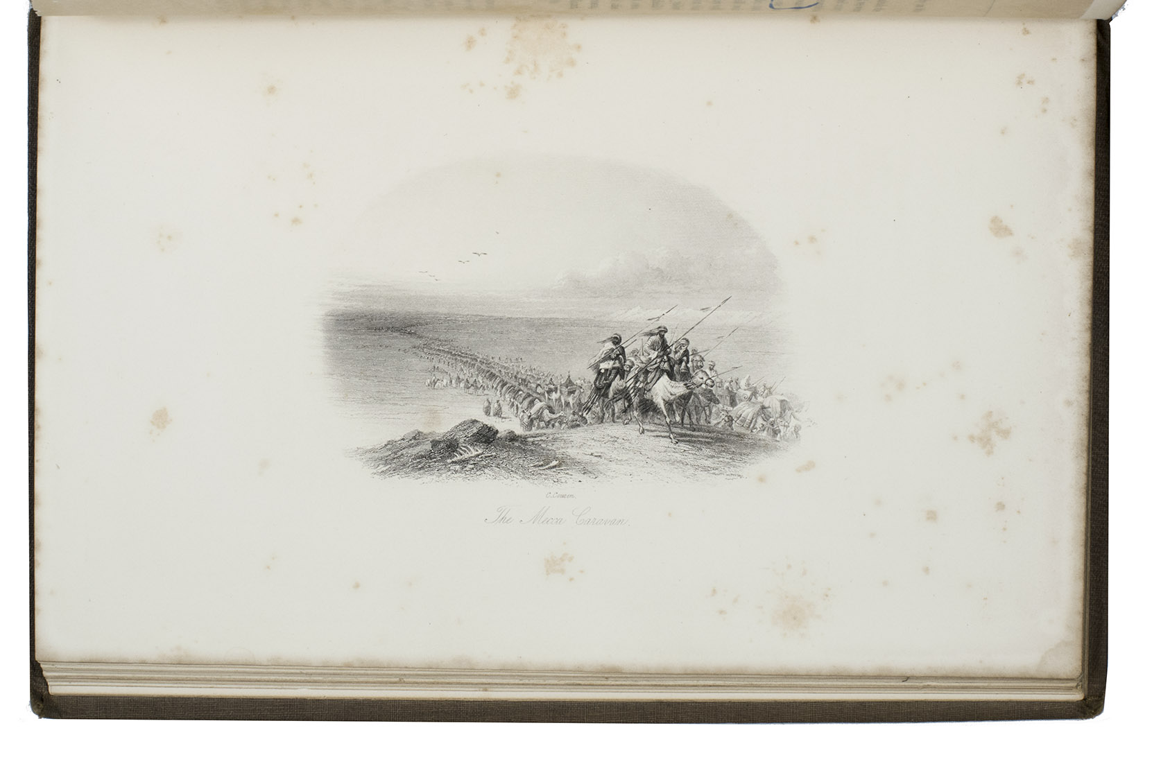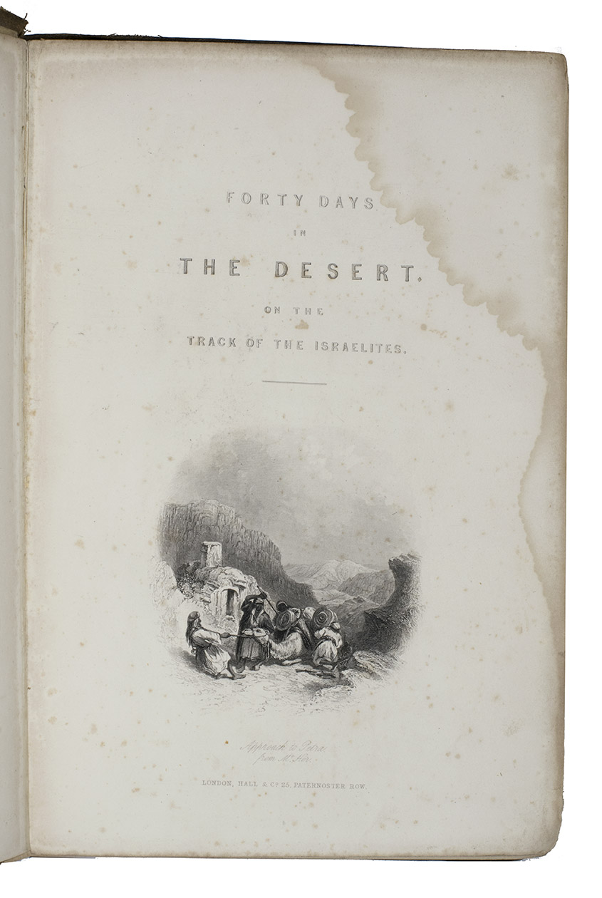 A fascinating account by William Henry Bartlett (1809-1854) of his forty-day journey in October-December 1845 through the Egyptian desert. He followed in the footsteps of the Israelites, who were led out of Egypt by Moses, from Cairo, along the east side of the Gulf of Suez to Mount Serbal, then east to the Gulf of Aqaba, and north to Petra. The book was published in a number of similar editions, most of them by Arthur Hall in London.