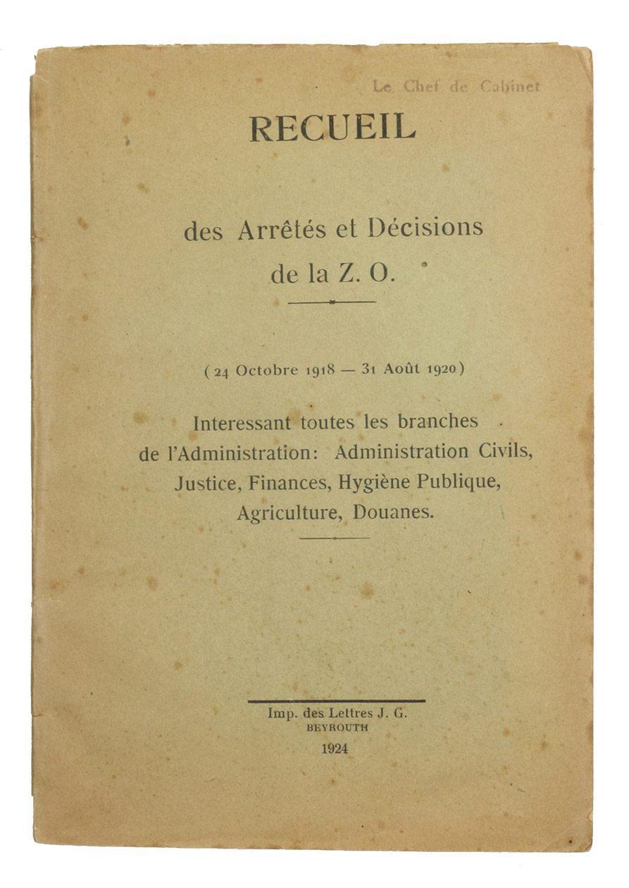 First edition of ac ollection of laws and regulations for Lebanon (Zone Ouest) passed by the French under their mandate for Syria and the Lebanon from October 1918 until the end of August 1920, two days prior to the declaration of independence of Greater Lebanon. A compact primary source on French administration in the Middle East, this rare manual contains decrees for administrative issues such as the division of Lebanon into three zones, sanitary measures against the plague, but also detailed regulations concerning everything from travel permits and the organisation and surveillance of prisons to the application of the metric system, the trade in carrier pigeons, the prices for ice (2 piastres for 400 grams wholesale, 3 piastres retail), alcoholic drinks (16 piastres for a litre of table wine) and tramway fares, and the circulation of vehicles.
