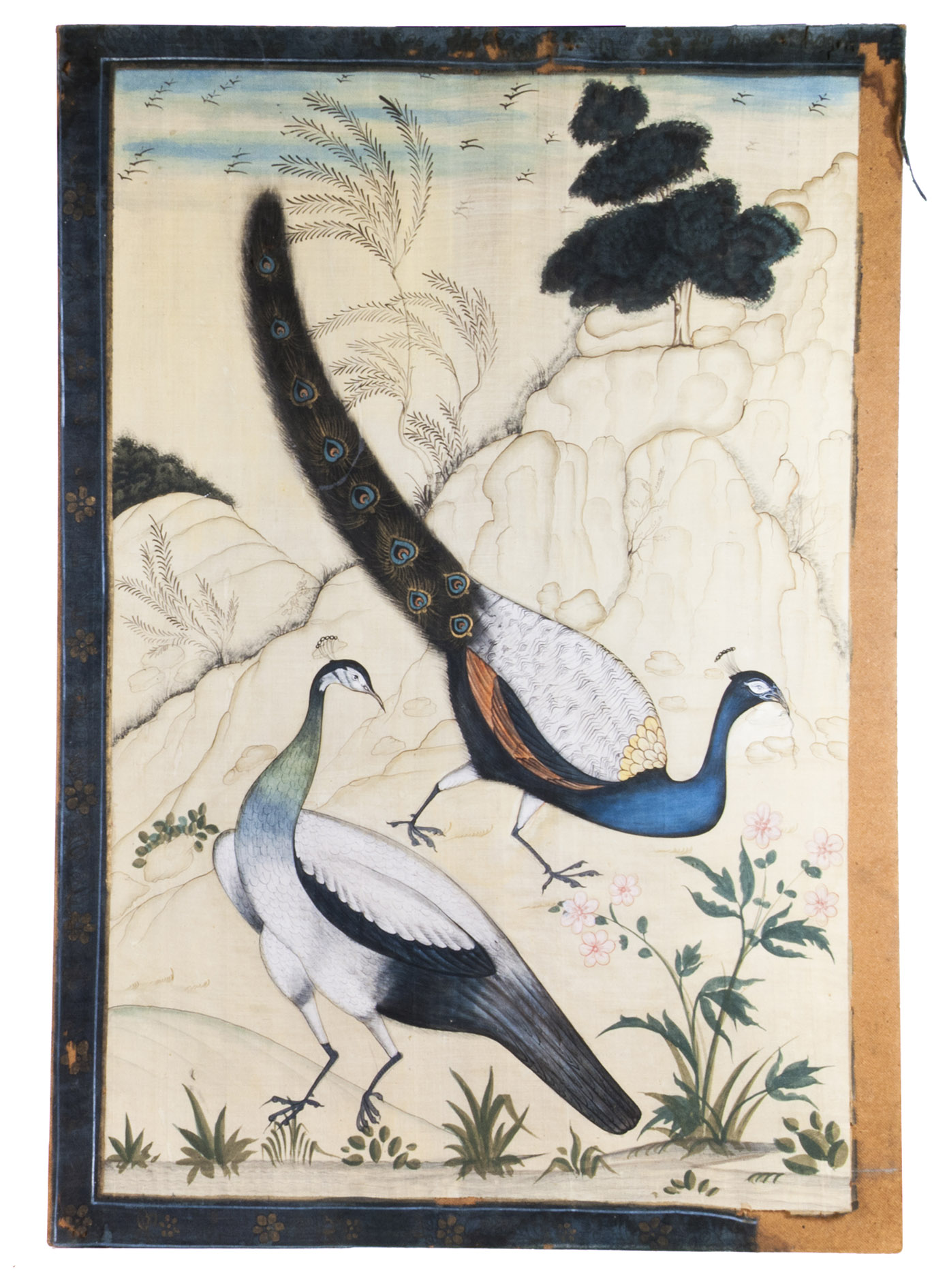 Beautiful, large, and vibrantly coloured silk painting of a pair of peafowls, painted after a watercolour attributed to the Mughal court painter Ustad Mansur (master Mansur, ca. 1590-1624). The intriguing work depicts a pair of peafowls in a rocky landscape. The peacock is captured in a natural pose, running with a prey in its beak, which draws the peahen's attention. The scene was most likely drawn from life. The peafowls themselves are painted in a Mughal fashion, while the stylised background and floral border are reminiscent of Persian art. Unlike Mansur's watercolour, which was painted on paper, the present painted is painted on silk. It is also three times the size of Mansur's work.