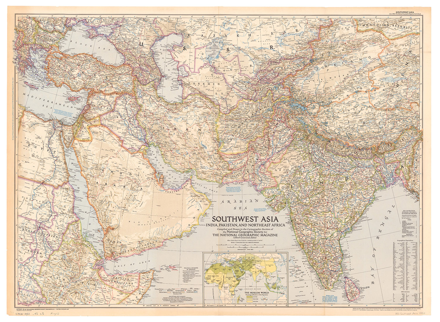 Washington, DC, National Geographic Society, 1952. Colour printed map, 68.5 x 95 cm. Scale 1:7,5000,000. With an inset map of "the Moslem World; percentage of Moslems in total population".