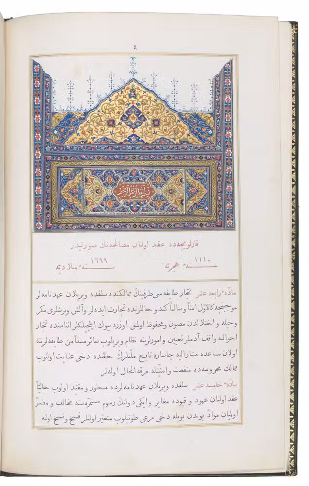 The full text of 19 trade treaties, in Ottoman Turkish throughout, closed between the Austrian and the Ottoman Empire between 1110/1699 (Peace of Karlovac) and 1259/1844. Bound in the same volume is the 1844 Italianlanguage edition, containing the texts of the various treaties in their respective original European language, with an Italian translation on the opposite pages.