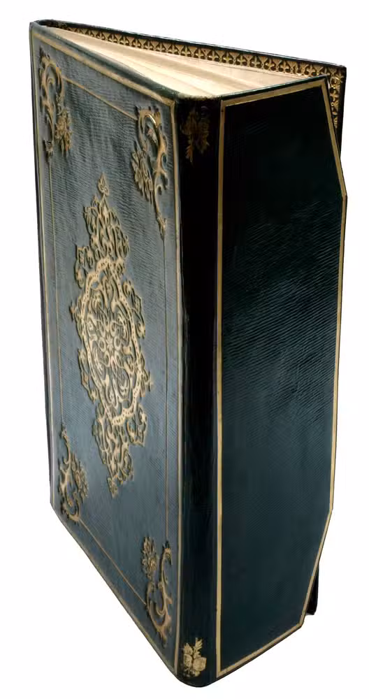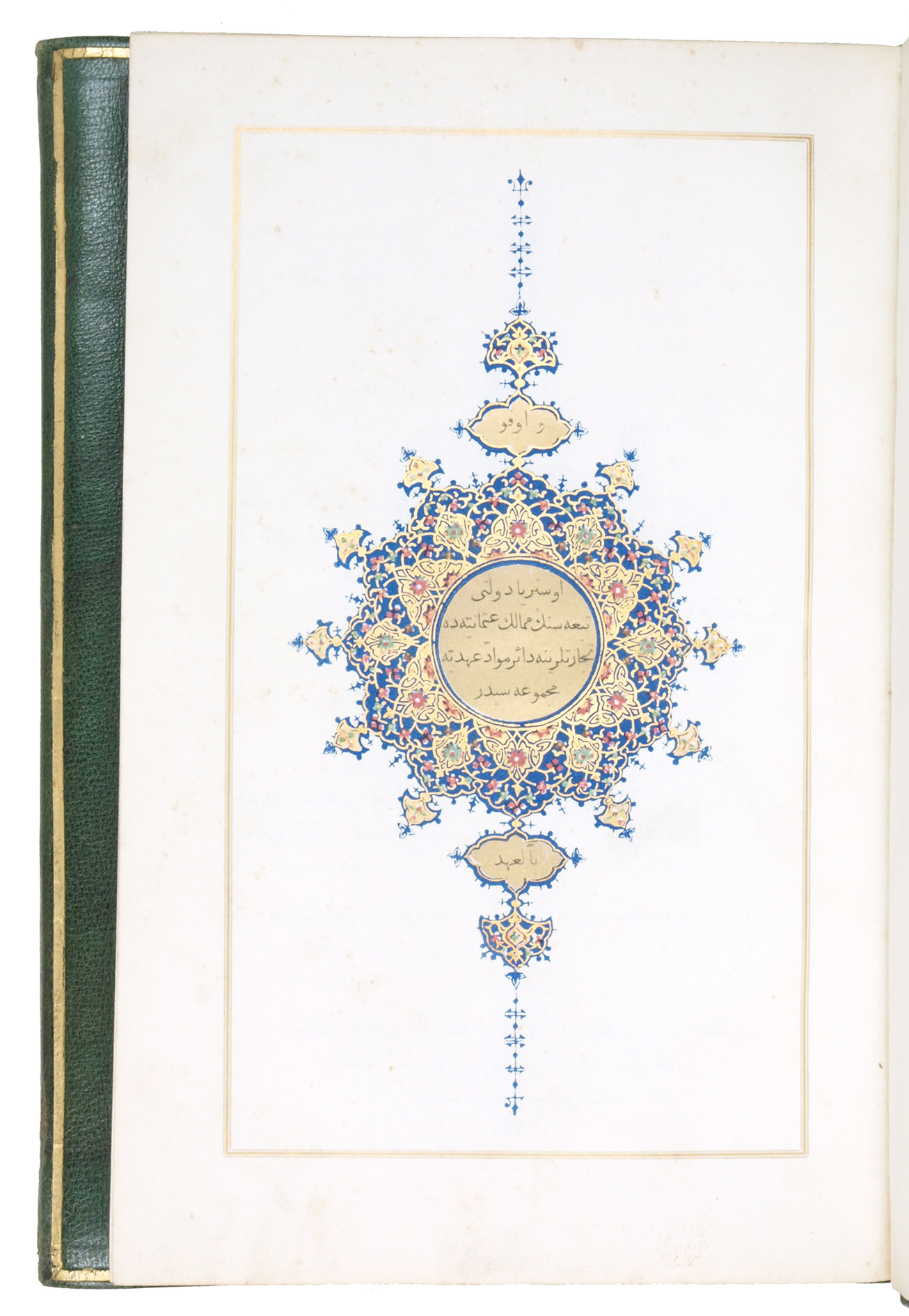 Vienna, Dar tiba al-imberaturiyy (k. k. Hof- und Staatsdruckerei), 1844. Large 8vo. Printed in black with red headings, within printed gilt rules. Illuminated head-piece and unwan printed in three colours and gilt, in imitation of manuscript illumination. Gilt tail-piece. Contemporary green morocco binding with fore-edge flap, covers giltstamped with an oriental design. All edges gilt. 88; [4], VIII, 224 pp.