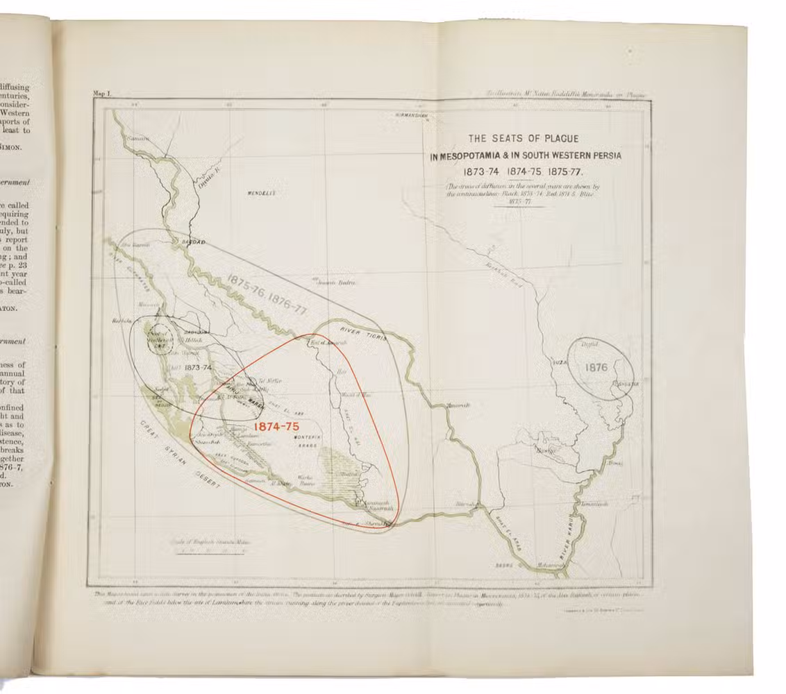 London, George Edward Eyre & William Spottiswoode, 1879. Folio. With two folding lithographed maps, one centered on the Middle East and the other detailing the seats of the plague in Mesopotamia and south-west Persia.Original publishers blue printed paper wrappers. [2], 76 pp.