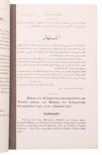Zanzibar consists of a few islands located in the Indian Ocean off the coast of Tanzania. Historically, it has played an important role in the trade across the Indian Ocean, between the African Great Lakes, the Somali Peninsula, the Arabian Peninsula, Iran, and the Indian subcontinent. The Zanzibar archipelago was discovered by Vasco da Gama (ca. 1460-1524) in 1498 and became part of the Portuguese Empire, until it fell under the control of the Sultanate of Oman in 1698. Somewhat gradually the power over the islands came into the hands of the British Empire in the 19th century, and Zanzibar became an official British Protectorate in 1890. The present work was printed during this time. The Protectorate was terminated in December 1963 and Zanzibar then became a constitutional monarchy within the Commonwealth. However, just a month later in early 1964, the Zanzibar Revolution began. During this bloody event, the Sultan was deposed and the sultanate replaced by a socialist government. In April 1964, Zanzibar merged with Tanganyika on the mainland, and the names of the two countries were combined into Tanzania. Zanzibar is currently an autonomous region within this country.