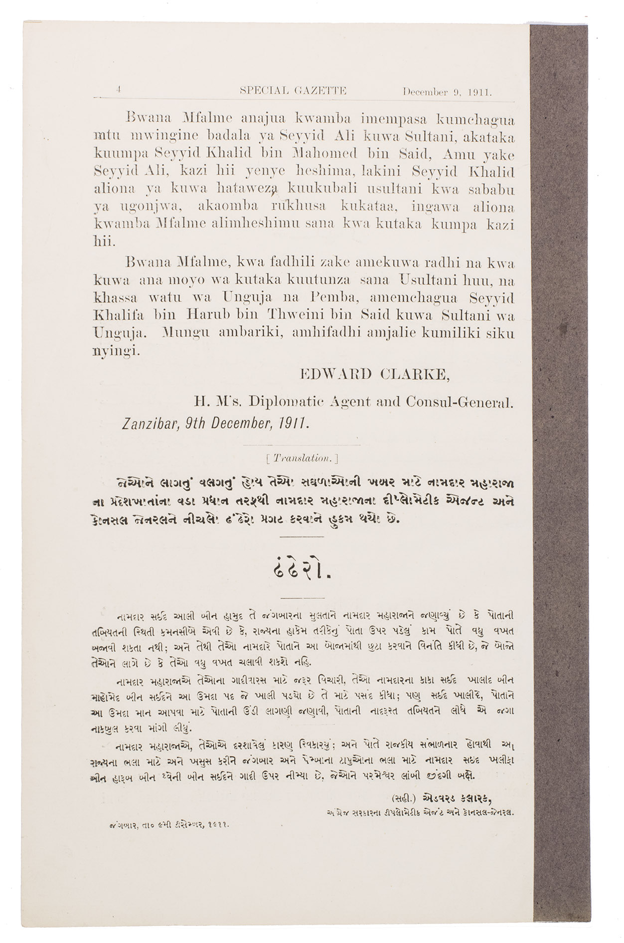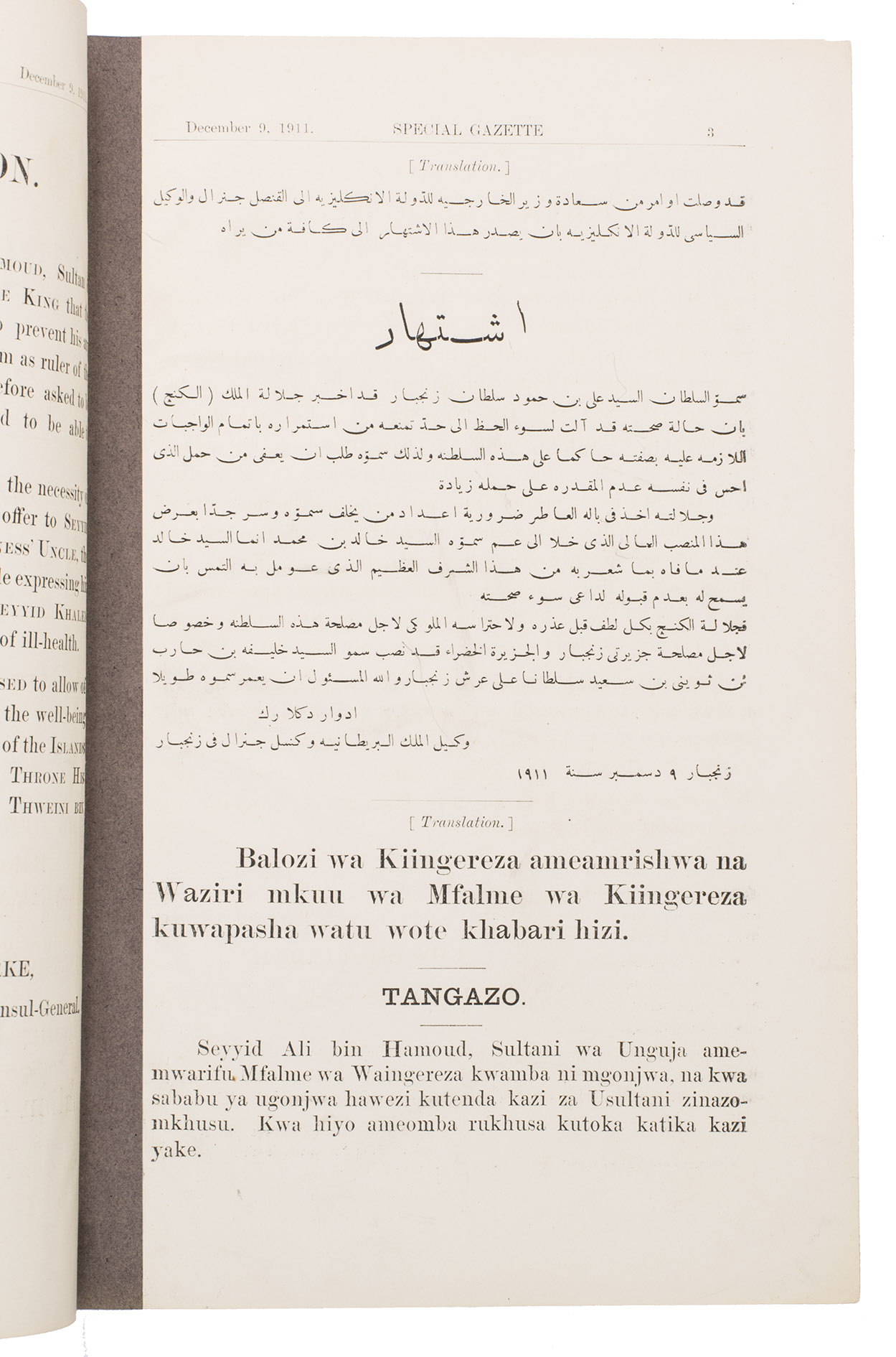 Rare proclamation announcing the abdication of Sayid Ali Bin Hamud (1884-1918), the 8th Sultan of Zanzibar, because of ill health. His appointed successor was Sir Khalifa Bin Harub (1879-1960), who would be one of the last sultans of the country. The proclamation is printed in four languages (English, Arabic, Swahili, and Gujarati) and is exceptionally rare, as we have not been able to find any other copies of it anywhere.