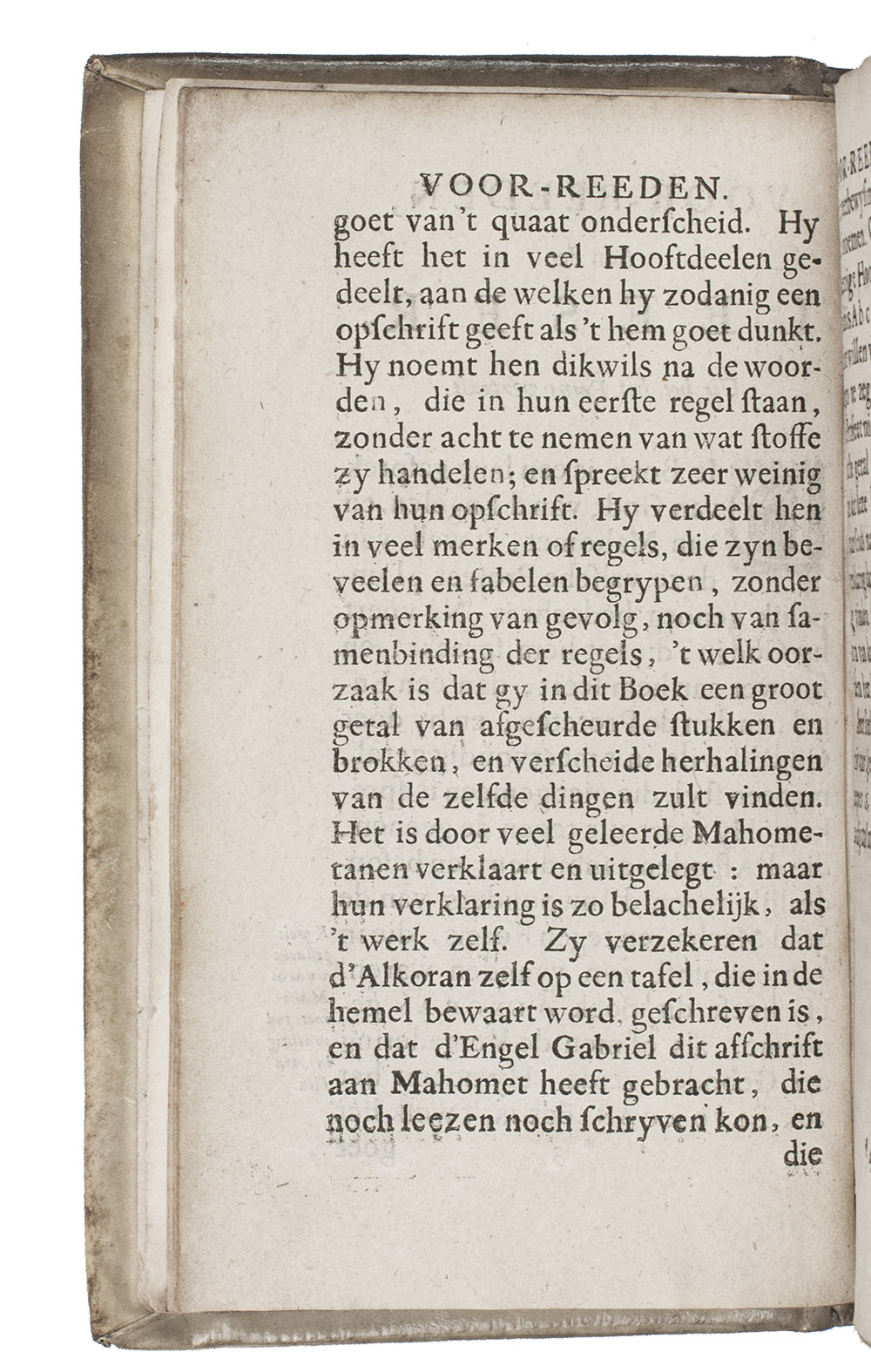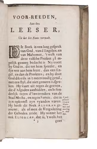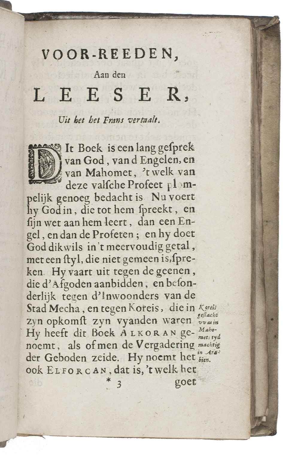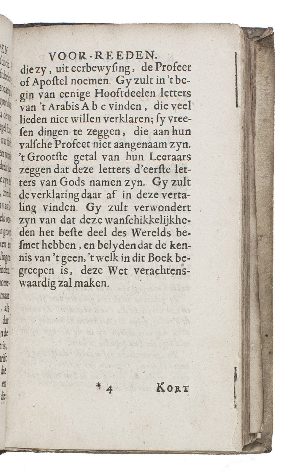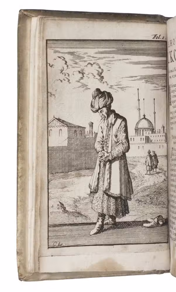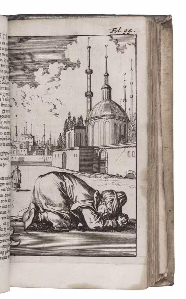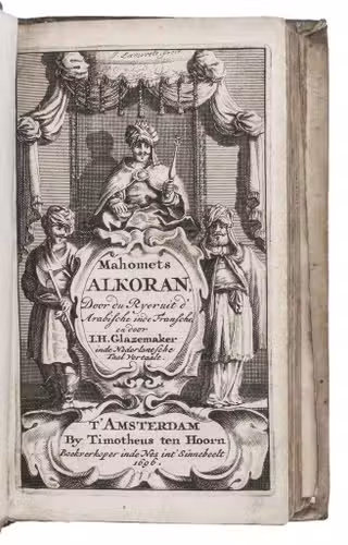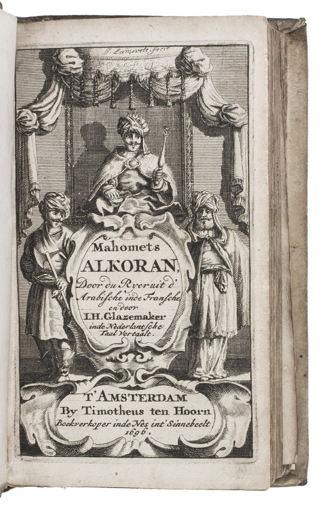 Second edition, the first with the engraved plates by Caspar Luyken, of the second Dutch translation of the Quran, translated by Jan Hendrik Glazemaker from André Du Reyer's French translation. Glazemaker's translation was first published in 1657 and proved quite popular, going through six editions (the last, in 1734, called the seventh). The text of the Quran is followed by a life of Mohammed, extracted from Ibn al-Amid's history of the Saracens and several other sources, translated from Erpenius's Latin rendering of the original Arabic. This edition was intended for Christians, who did not concern themselves with the Islamic restrictions on pictorial illustration. The preface is followed by a 5-page summary of the religion of the Ottomans.