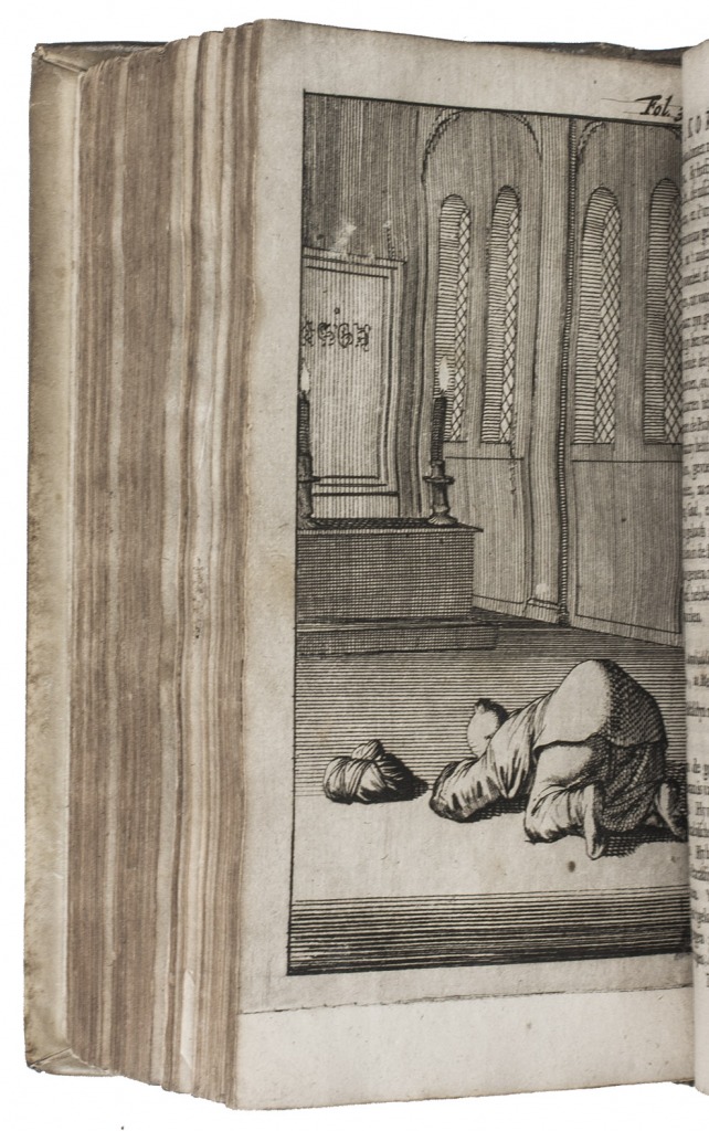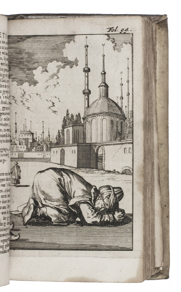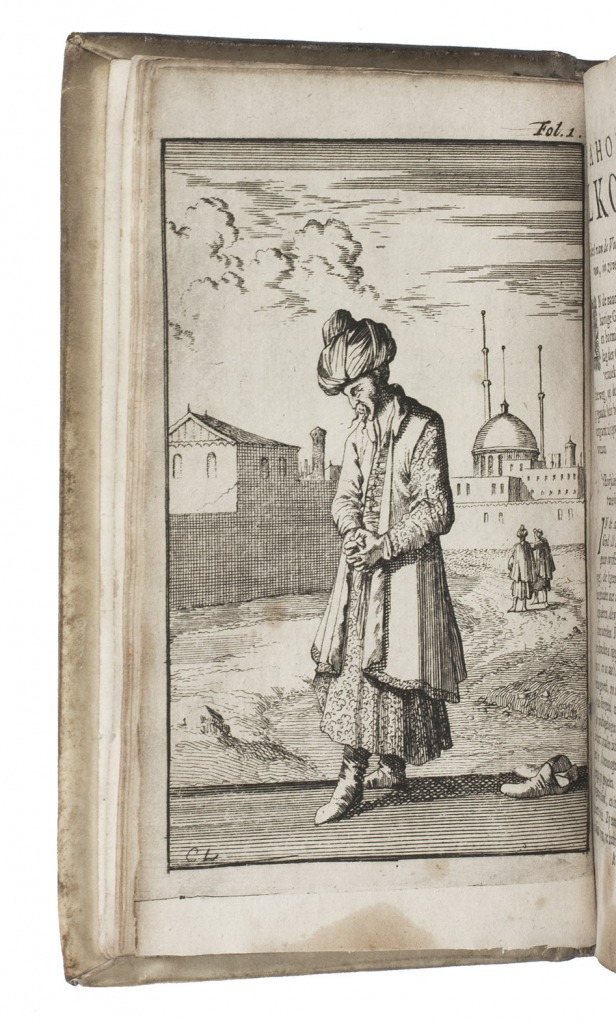 Amsterdam, Timotheus ten Hoorn, 1696. 8vo. With an integral engraved title-page, and 6 engraved plates showing the Prophet Mohammed, engraved by Caspar Luyken. Contemporary vellum, manuscript title on spine. [12], 547, [1 blank] pp.