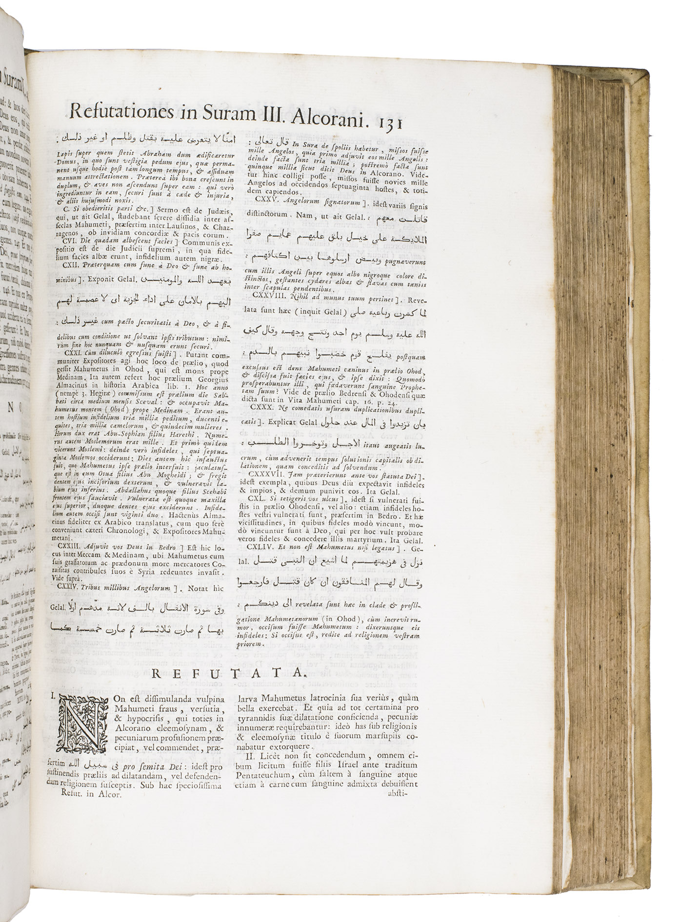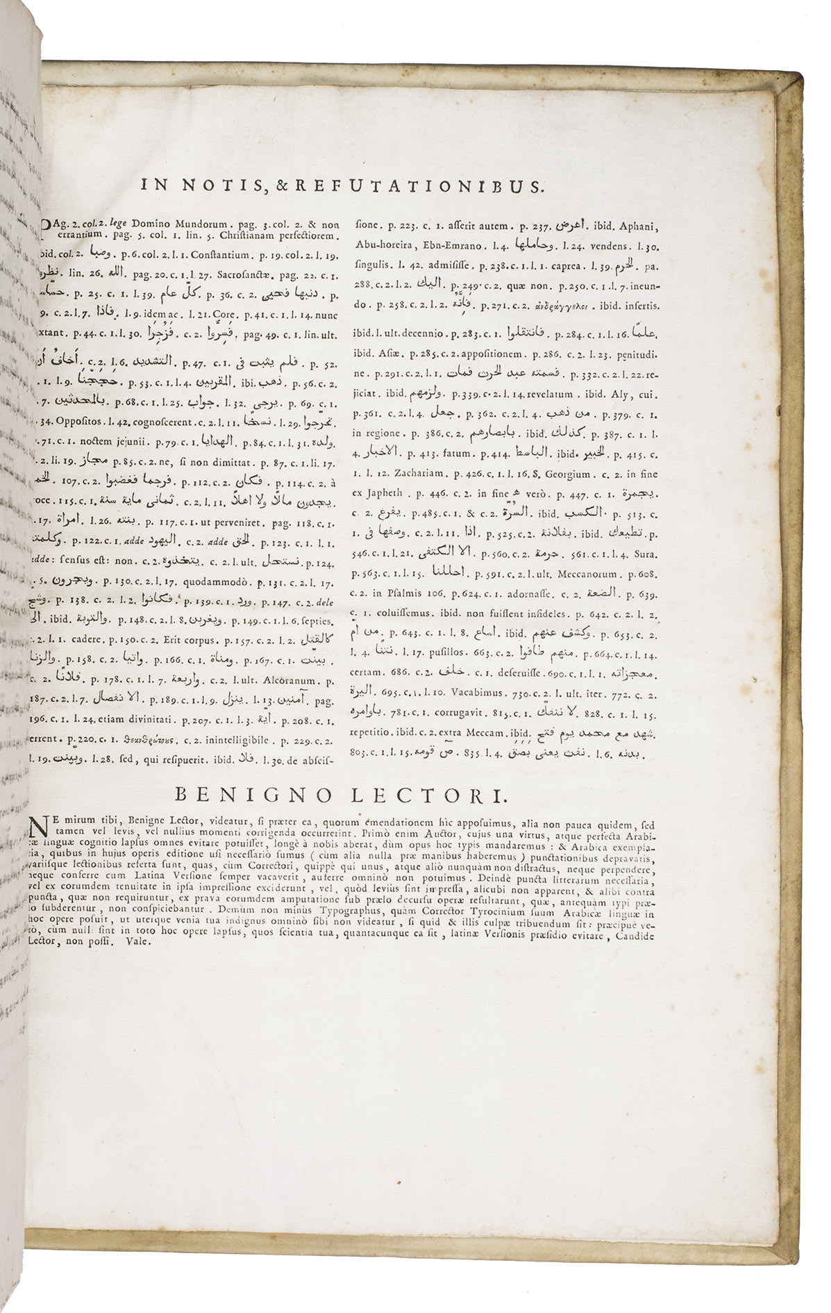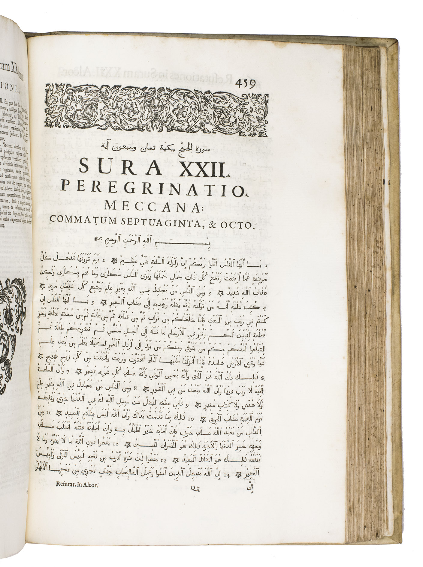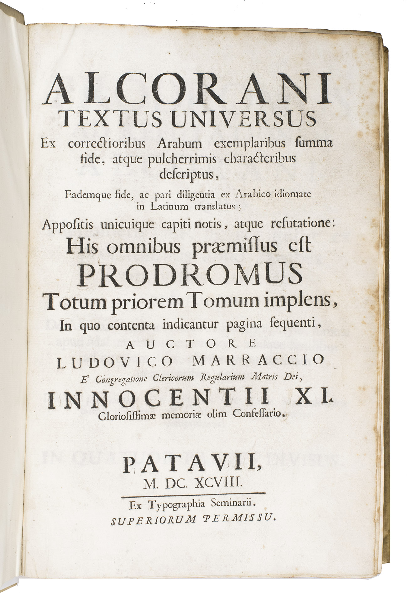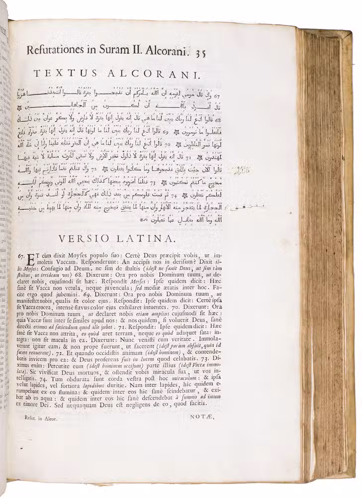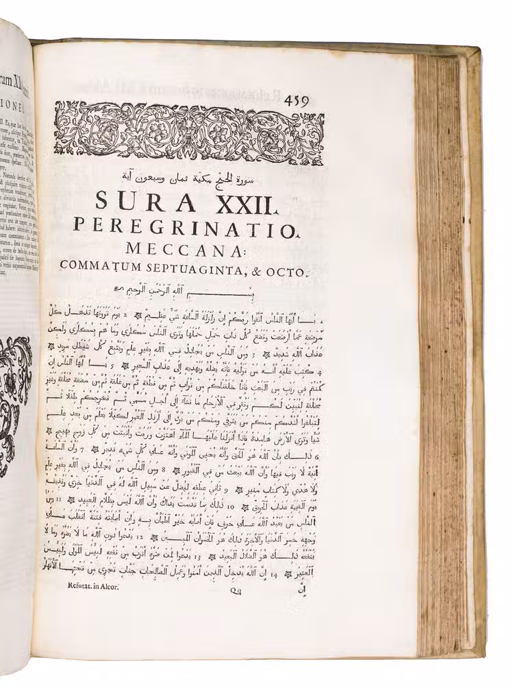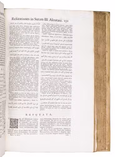 The first scholarly printed Quran, prepared by the anti-Islamic Catholic Ludovico Marracci, with a much more accurate Arabic text than any previously printed and the first accurate Latin translation, also including extensive notes based on the Islamic commentaries, as well as the editor's extensive "refutations" of each sutra. Each sura is given first in Arabic, then in Latin translation, followed by notes and then the refutation. The entire first volume of about 430 pages is taken up with preliminary matter, including a 24-page life of Muhammad (one of the first detailed biographies ever printed and again more accurate than its predecessors), an 8-page profession of faith with the Arabic and Latin in parallel columns, and additional commentaries and introductory matter. The fact that this edition was produced explicitly as an attempt to refute the views of Islam has naturally led Islamic scholars to dismiss it, but both the Arabic text and the Latin translation were far better than any previously printed and had no serious rival until the Leipzig edition of 1834. The commentaries also made a great deal of Islamic scholarship available to a European audience for the first time and both the Arabic and the Latin text influenced nearly every edition for the next 150 years.