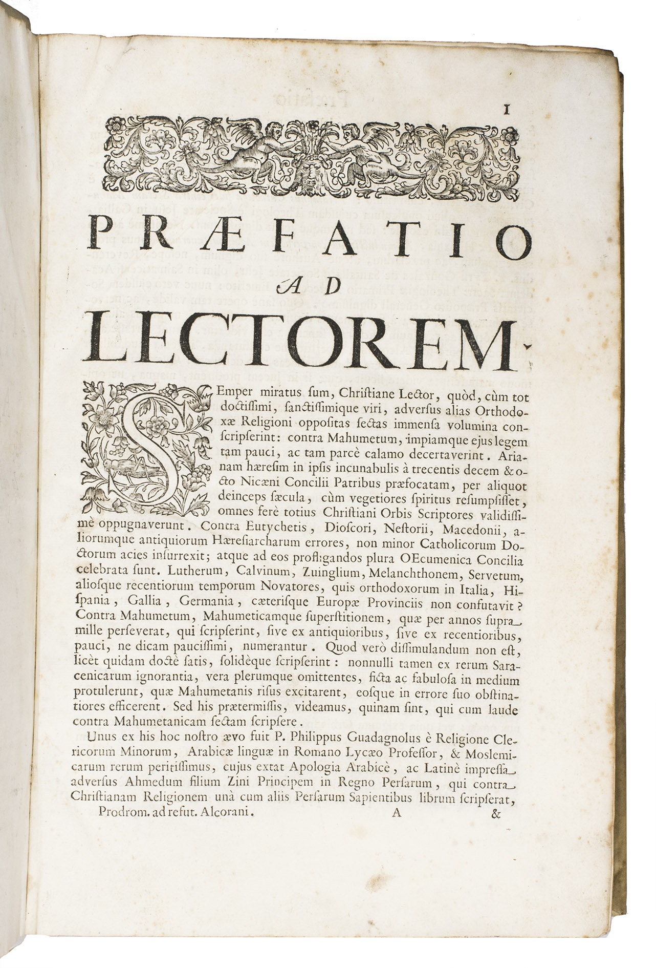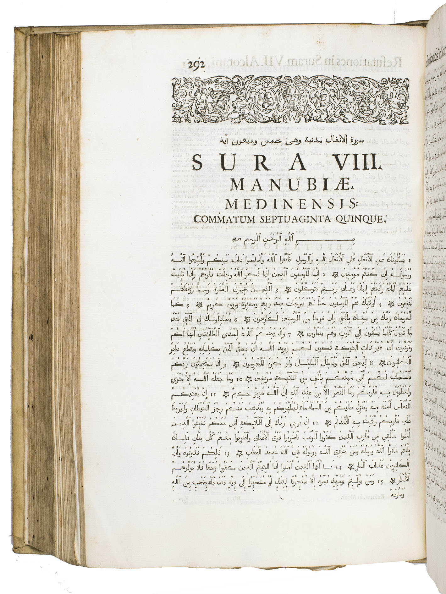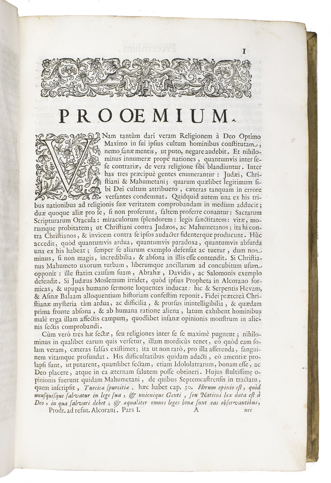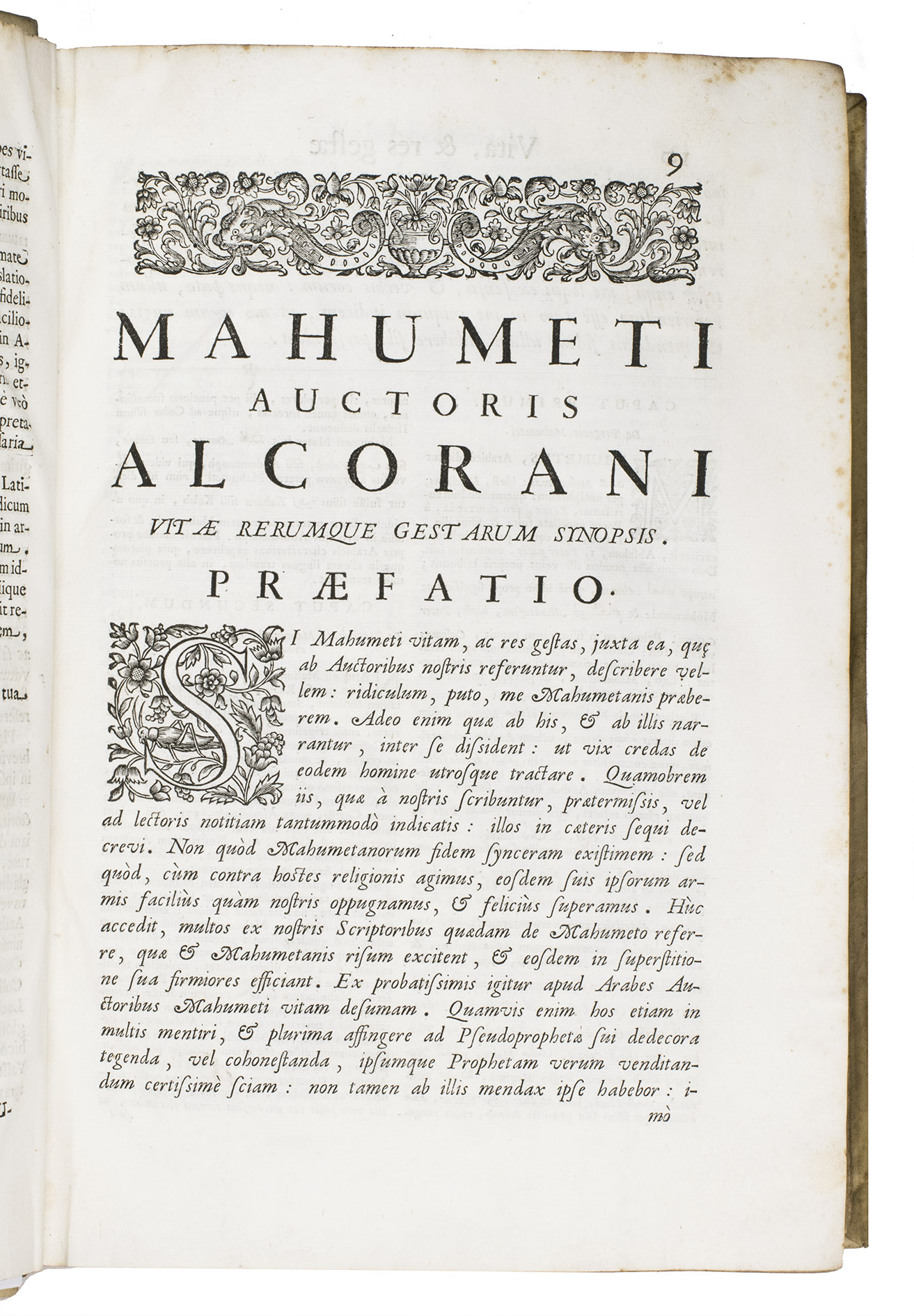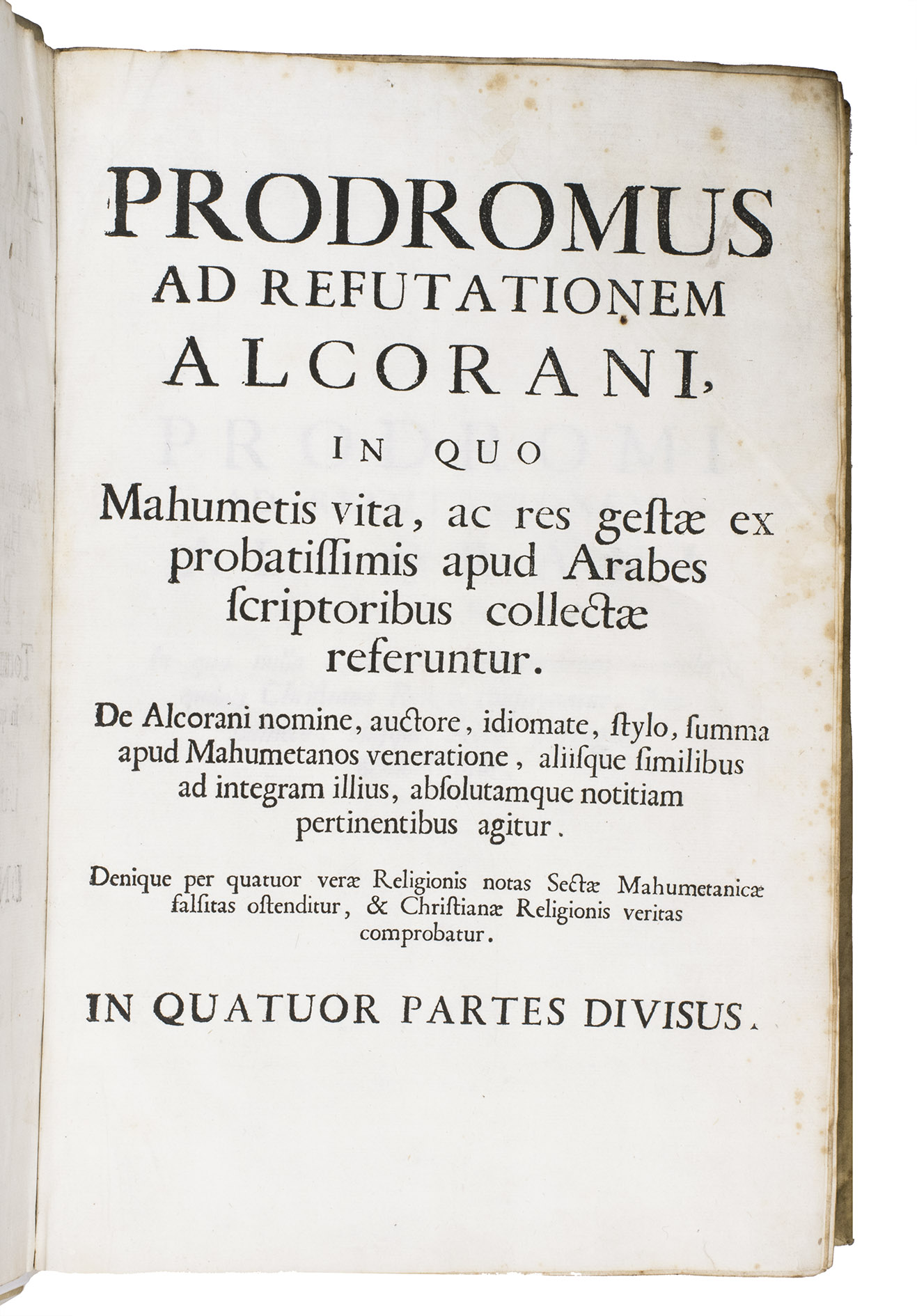 The first scholarly printed Quran, prepared by the anti-Islamic Catholic Ludovico Marracci, with a much more accurate Arabic text than any previously printed and the first accurate Latin translation, also including extensive notes based on the Islamic commentaries, as well as the editor's extensive "refutations" of each sutra. Each sura is given first in Arabic, then in Latin translation, followed by notes and then the refutation. The entire first volume of about 430 pages is taken up with preliminary matter, including a 24-page life of Muhammad (one of the first detailed biographies ever printed and again more accurate than its predecessors), an 8-page profession of faith with the Arabic and Latin in parallel columns, and additional commentaries and introductory matter. The fact that this edition was produced explicitly as an attempt to refute the views of Islam has naturally led Islamic scholars to dismiss it, but both the Arabic text and the Latin translation were far better than any previously printed and had no serious rival until the Leipzig edition of 1834. The commentaries also made a great deal of Islamic scholarship available to a European audience for the first time and both the Arabic and the Latin text influenced nearly every edition for the next 150 years.