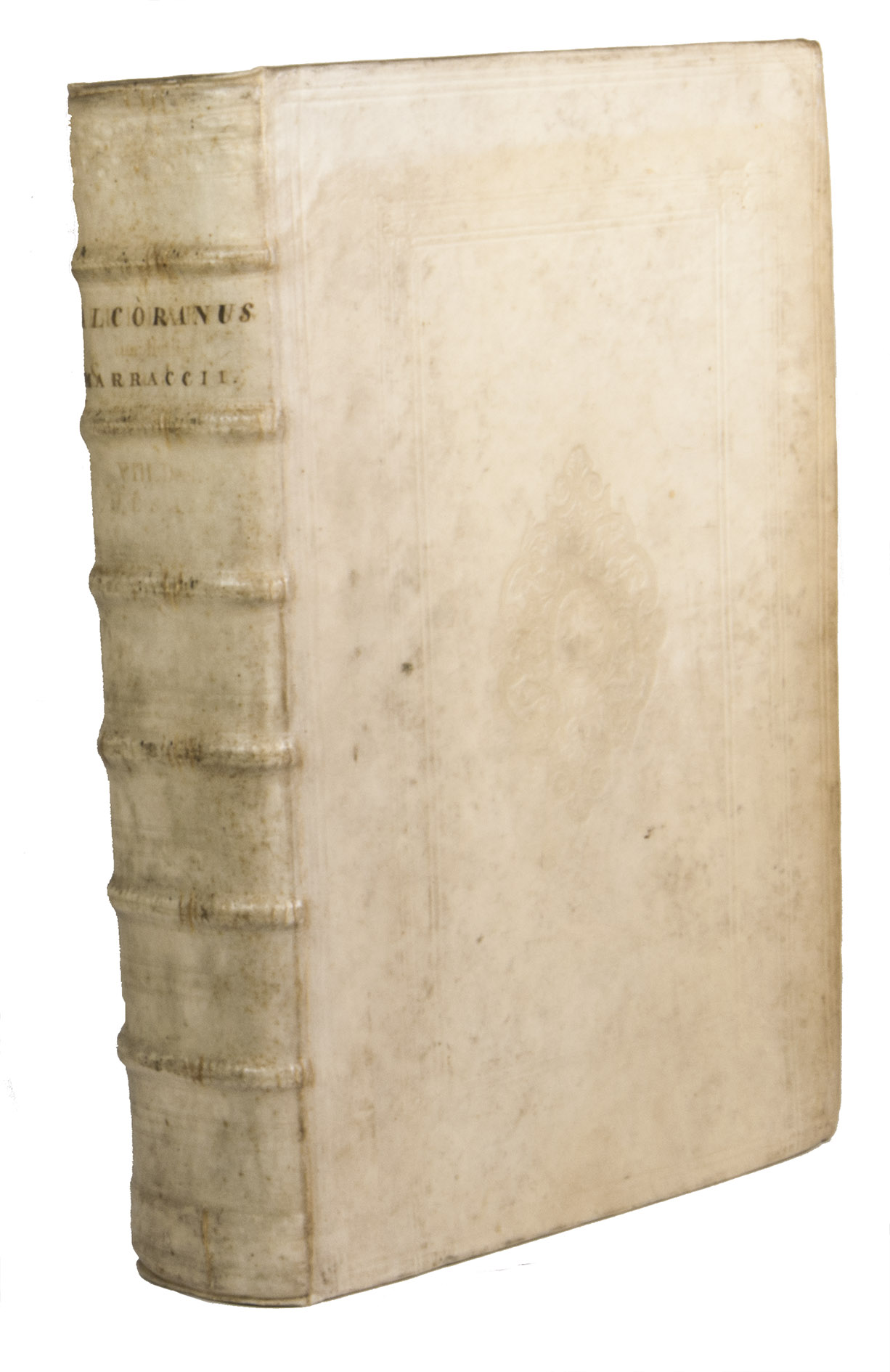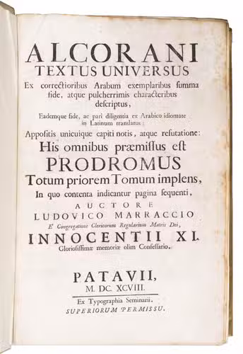 With two bookplates and an occasional early manuscript note and a few letters or numbers inscribed in the foot margin of one leaf. With a tear running into the text of one leaf, repaired, but otherwise in very good condition. With generous margins. The boards are slightly bowed and there is a small tear repaired at the foot of the spine. A ground-breaking work of Quranic scholarship, a valuable source for the study of the Quran and an essential source for European views of Islam. Cat. Bibl. A.-R. Courbonne, dont la vent ... 1er février 1842, 30 (this copy); A. Hamilton, Europe and the Arab world 34; Schnurrer 377; O. A. Sheikh Al-Shabab, "The place of Marraccis Latin translation of the Holy Quran: ...", in: Journal of King Saud University: language & tanslation, 13 (2001), pp. 57-74; USTC 1736471/1737617/1748538; not in Atabey; Blackmer; Philologia orientalis (but cited in 225g, 360a, 380b, 381c).
