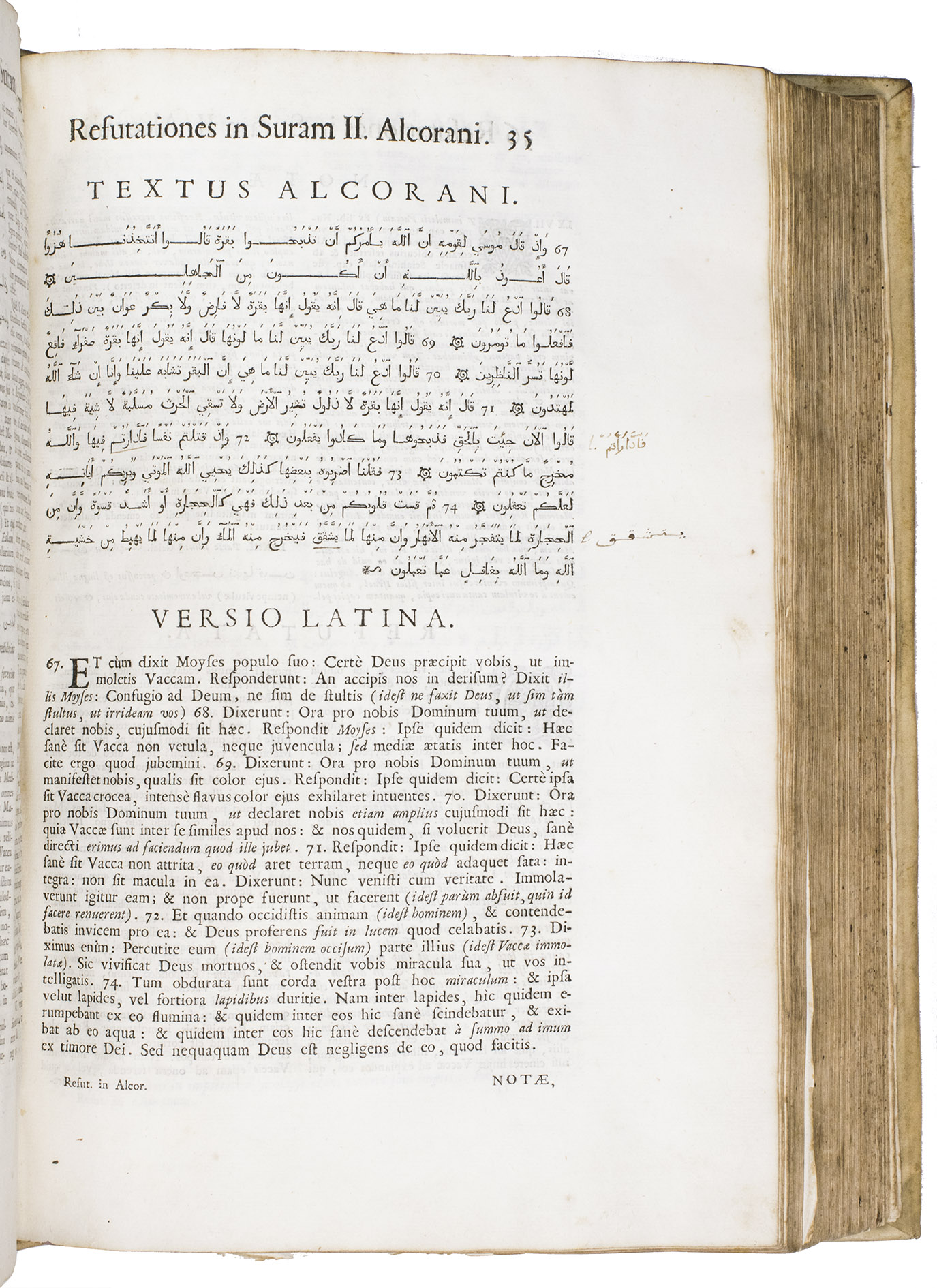 Alcorani textus universus ex correctioribus Arabum exemplaribus summa fide, ... Eadem fide, ... in Latinum translatus; appositis unicuique capiti notis, atque refutatione: ...