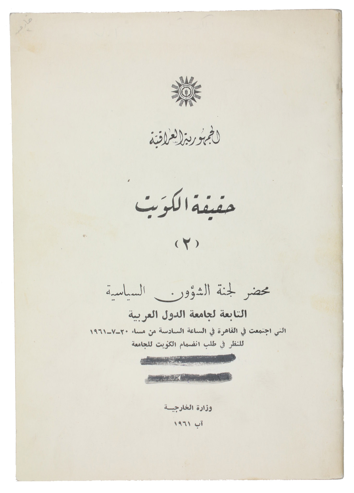First edition of the second of two rare pamphlets published by the Iraqi government, opposing the independence of Kuwait. The first pamphlet, published in English and Arabic, outlined Kuwait's historical connection to Iraq and analysed its "imperialist relations" with Britain. This second one, in Arabic throughout, prints the minutes of the Political Affairs Committee of the Arab League, which met in Cairo on 20 July 1961 to consider Kuwait's request to join the League.