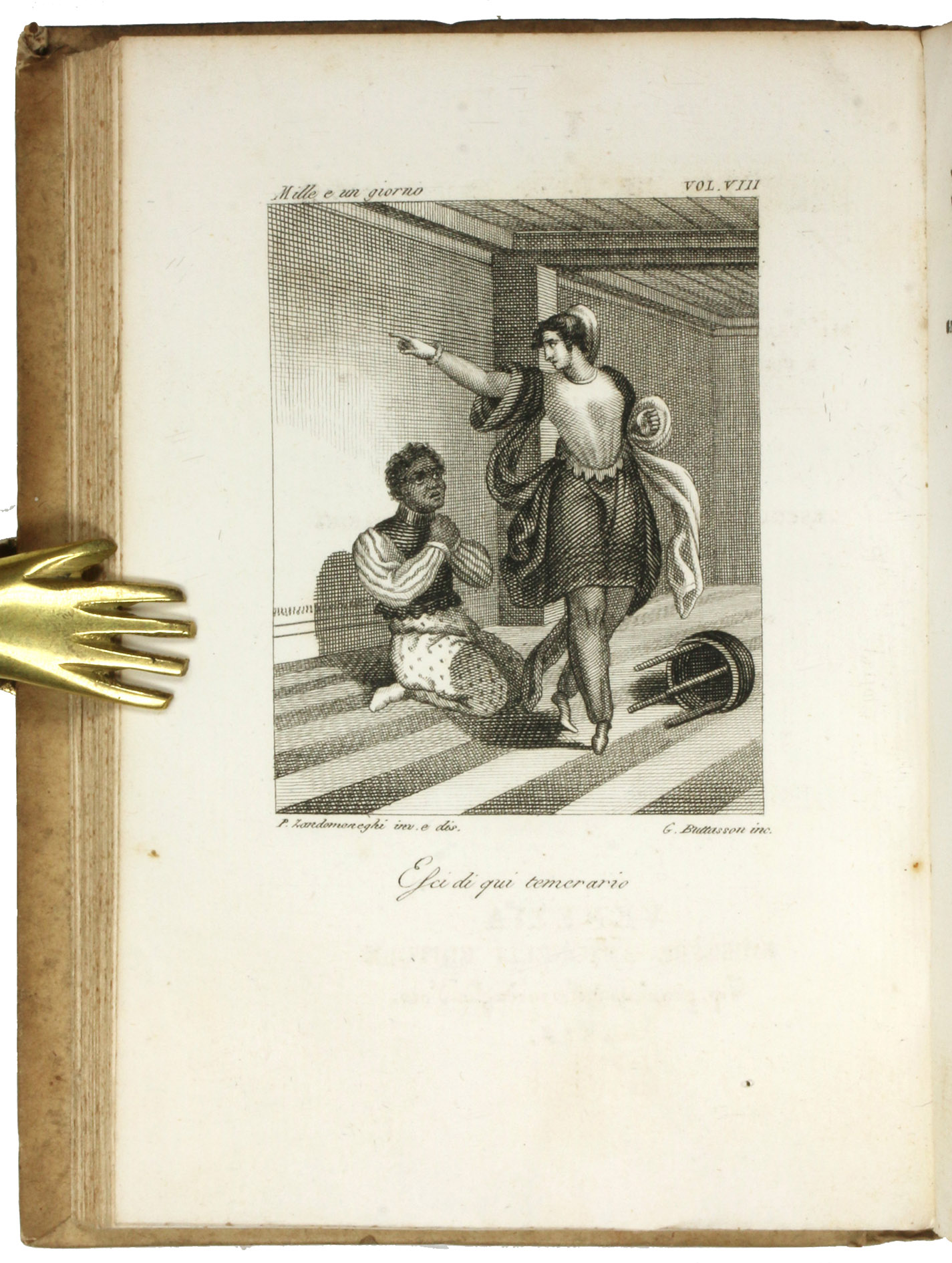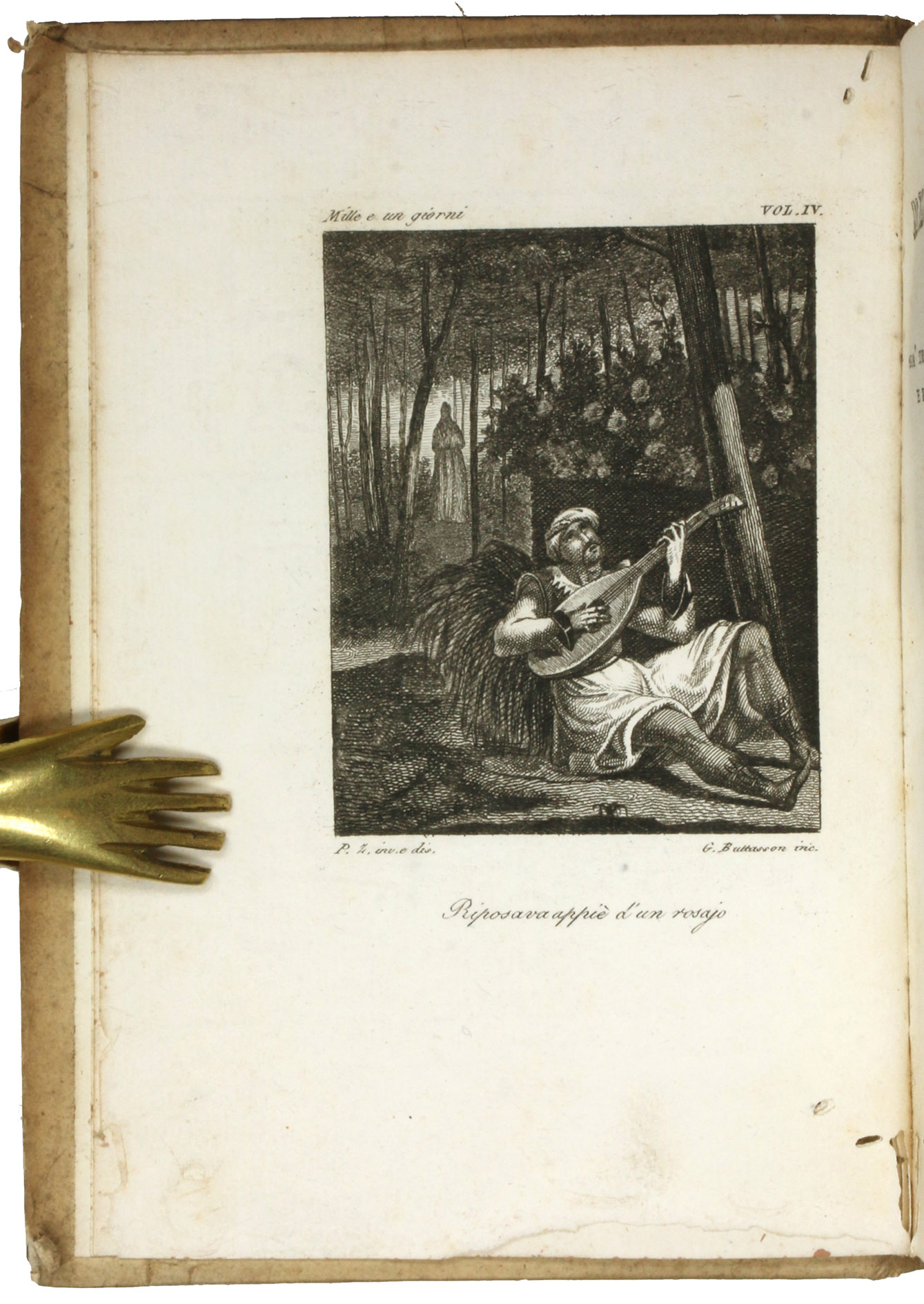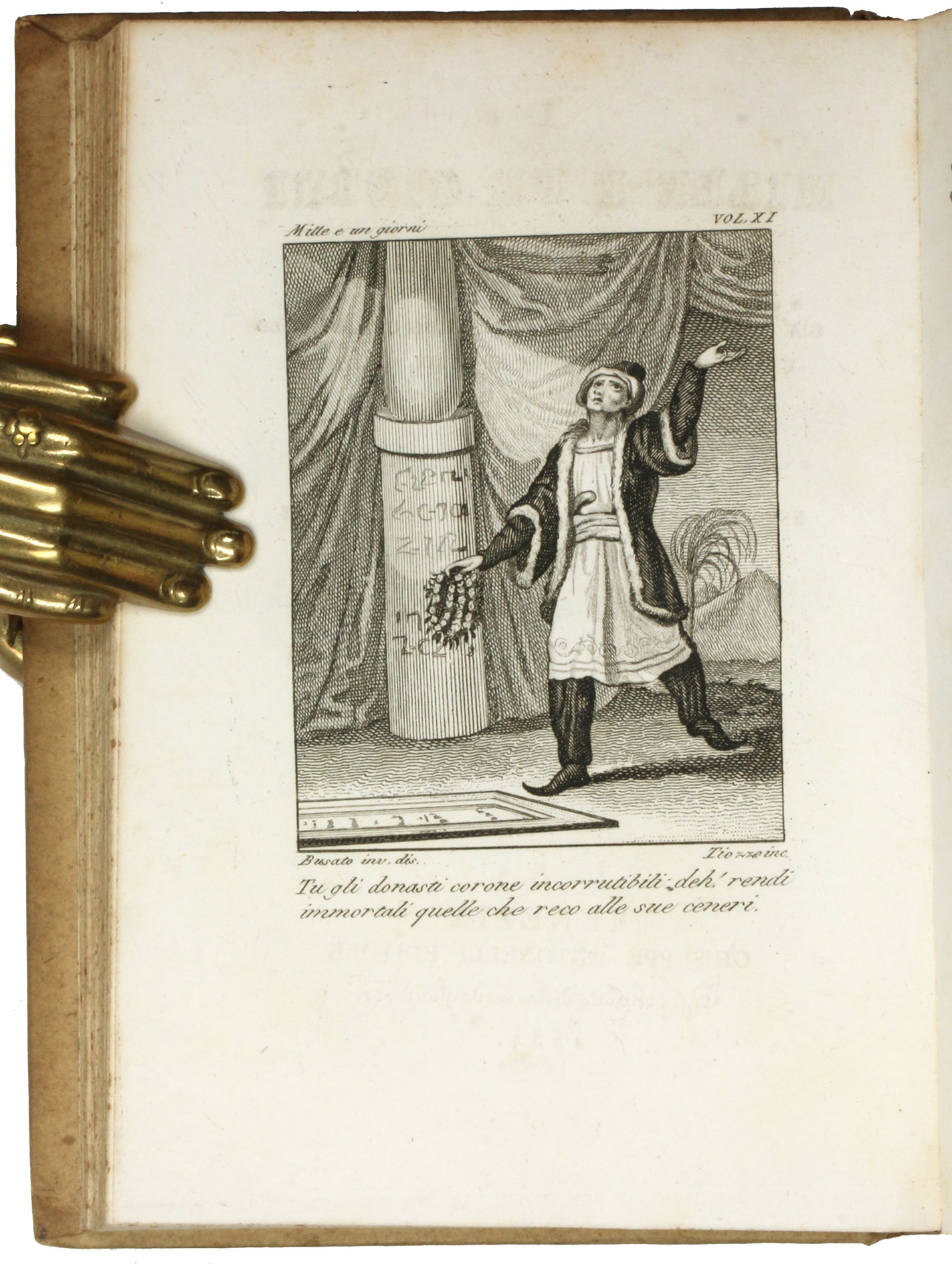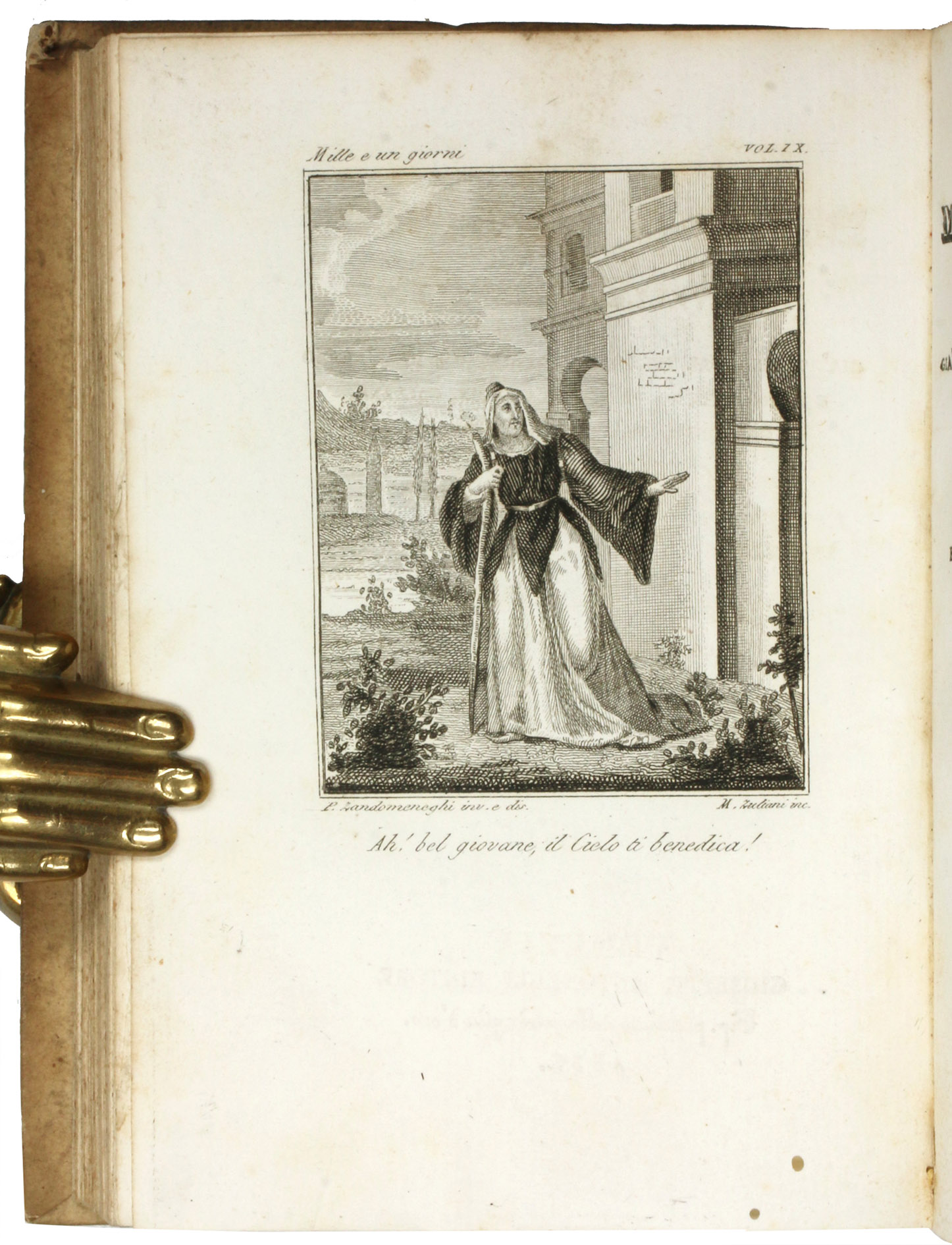 First illustrated Italian edition: a charming edition of the Heyaryek-Rouz or Thousand and One Days, so-called to "give the work an air of originality" (Chauvin IV, 124). A Persian manuscript of this work was given to Francois Petit de la Croix in Isfahan in 1675, but enjoyed far fewer editions and translations than the Alf layla wa-layla. As Chauvin notes, it cannot be determined whether the Thousand and one days or the Thousand and One Nights was composed first, nevertheless, to this day the Heyarek-Rouz is much less well-known to the Western world (IV, 123f.). Chauvin quotes one commentator who declares the Heyarek-Rouz "much more ingenious and more realistic, as it sometimes includes marvels, following the taste of the Oriental".