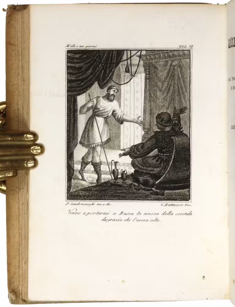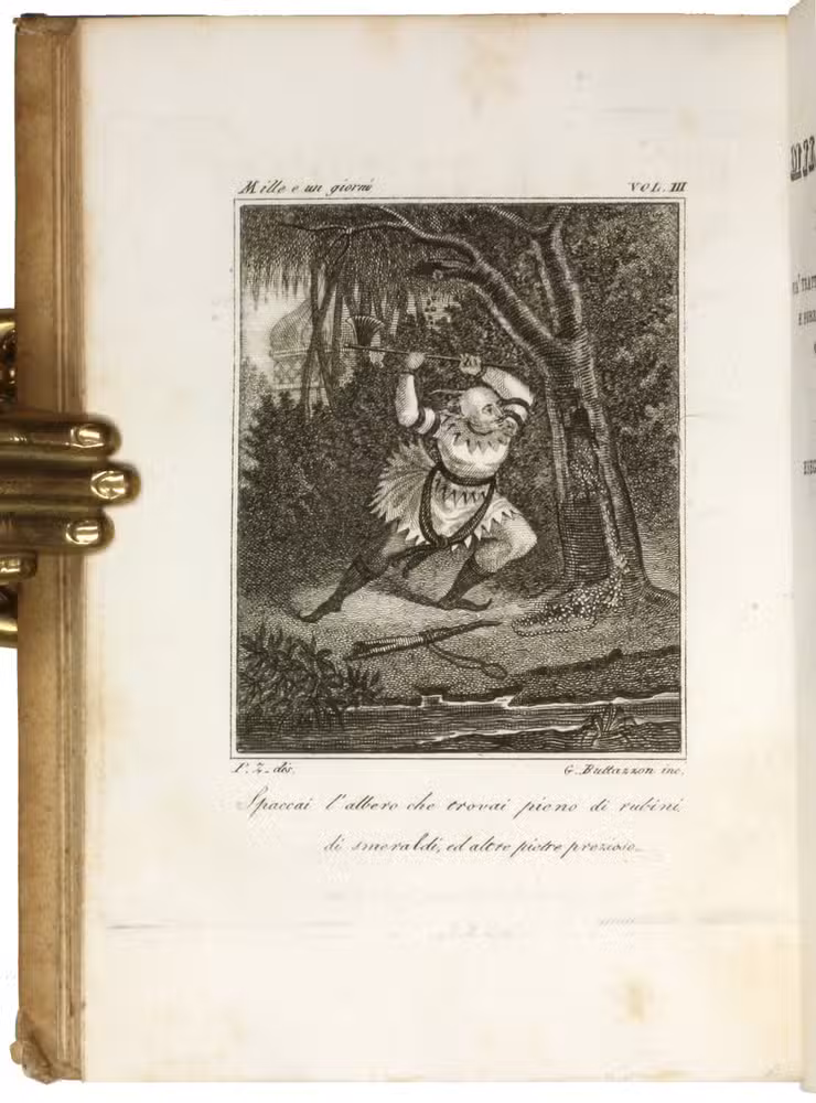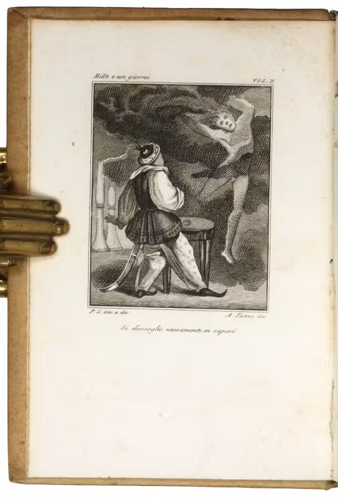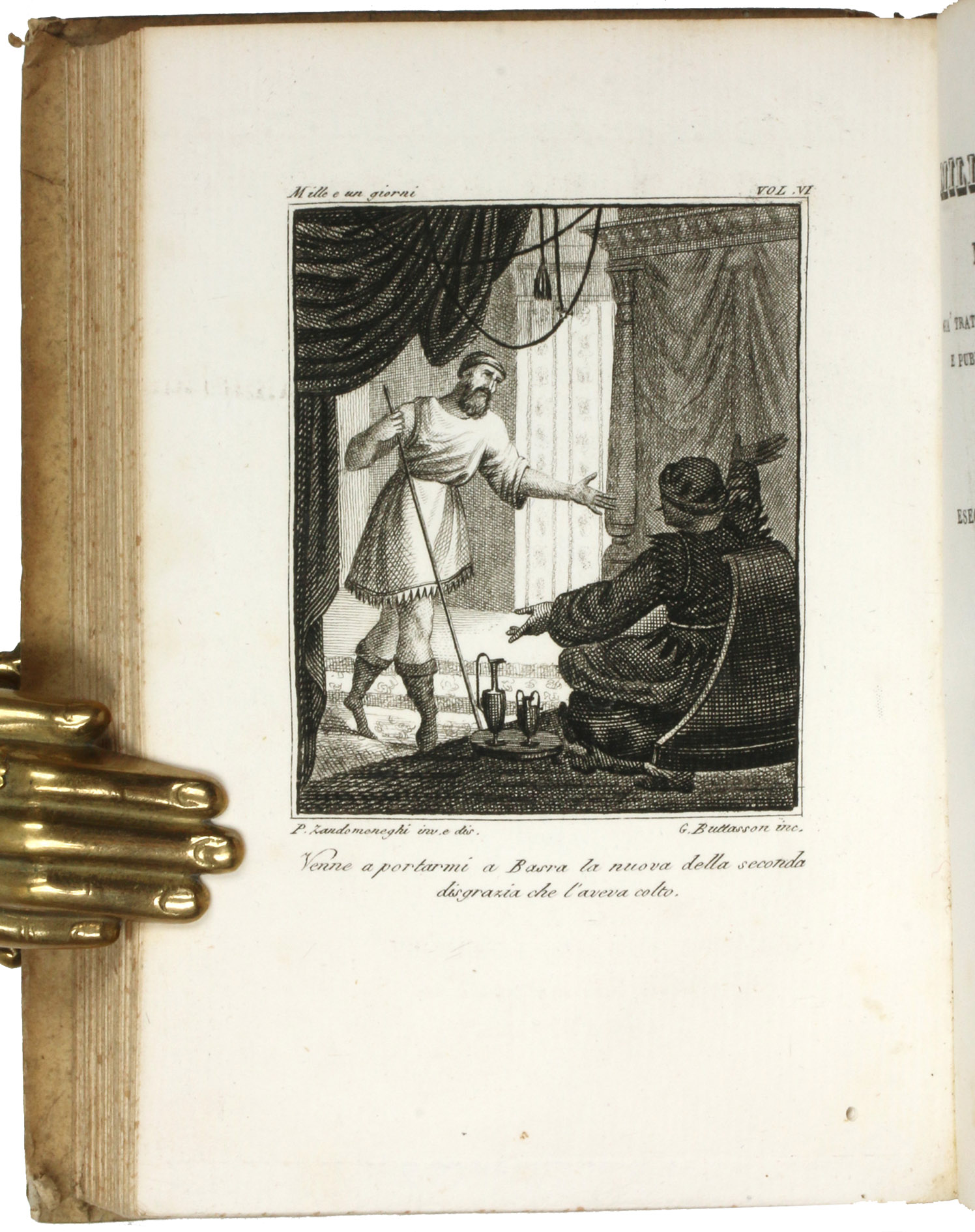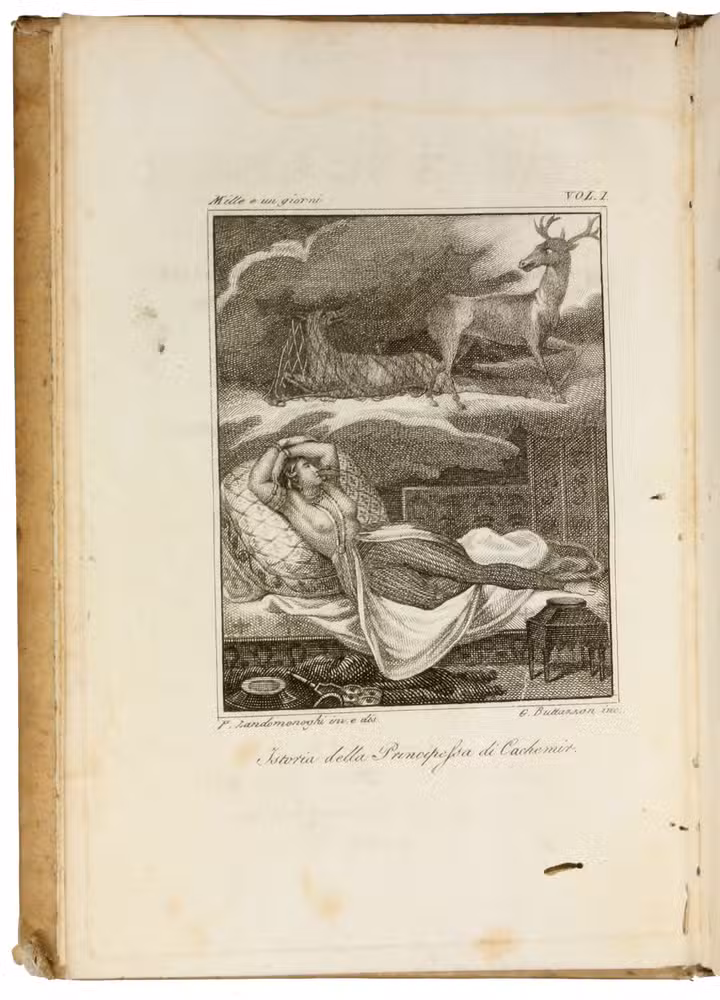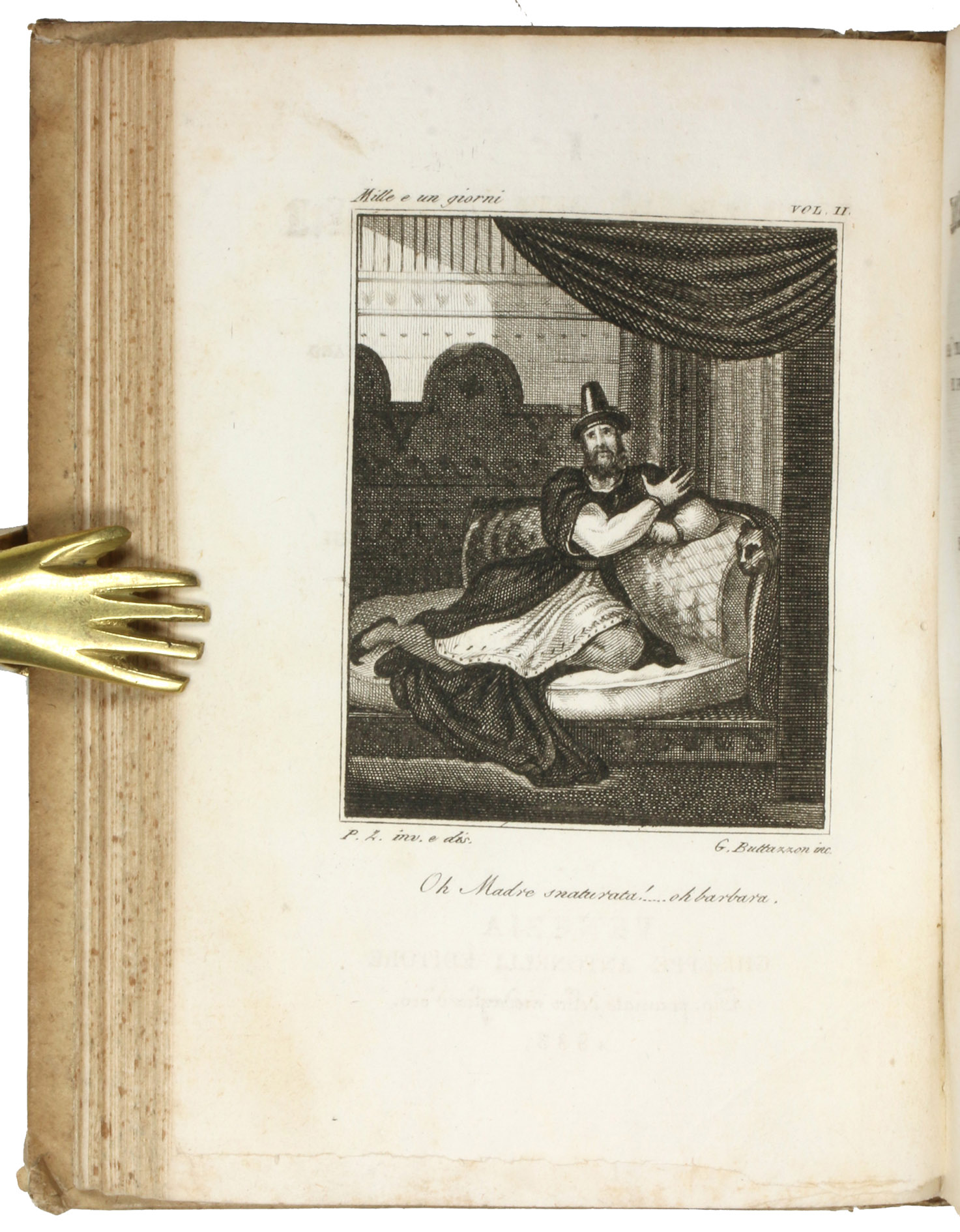 First illustrated Italian edition: a charming edition of the Heyaryek-Rouz or Thousand and One Days, so-called to "give the work an air of originality" (Chauvin IV, 124). A Persian manuscript of this work was given to Francois Petit de la Croix in Isfahan in 1675, but enjoyed far fewer editions and translations than the Alf layla wa-layla. As Chauvin notes, it cannot be determined whether the Thousand and one days or the Thousand and One Nights was composed first, nevertheless, to this day the Heyarek-Rouz is much less well-known to the Western world (IV, 123f.). Chauvin quotes one commentator who declares the Heyarek-Rouz "much more ingenious and more realistic, as it sometimes includes marvels, following the taste of the Oriental".