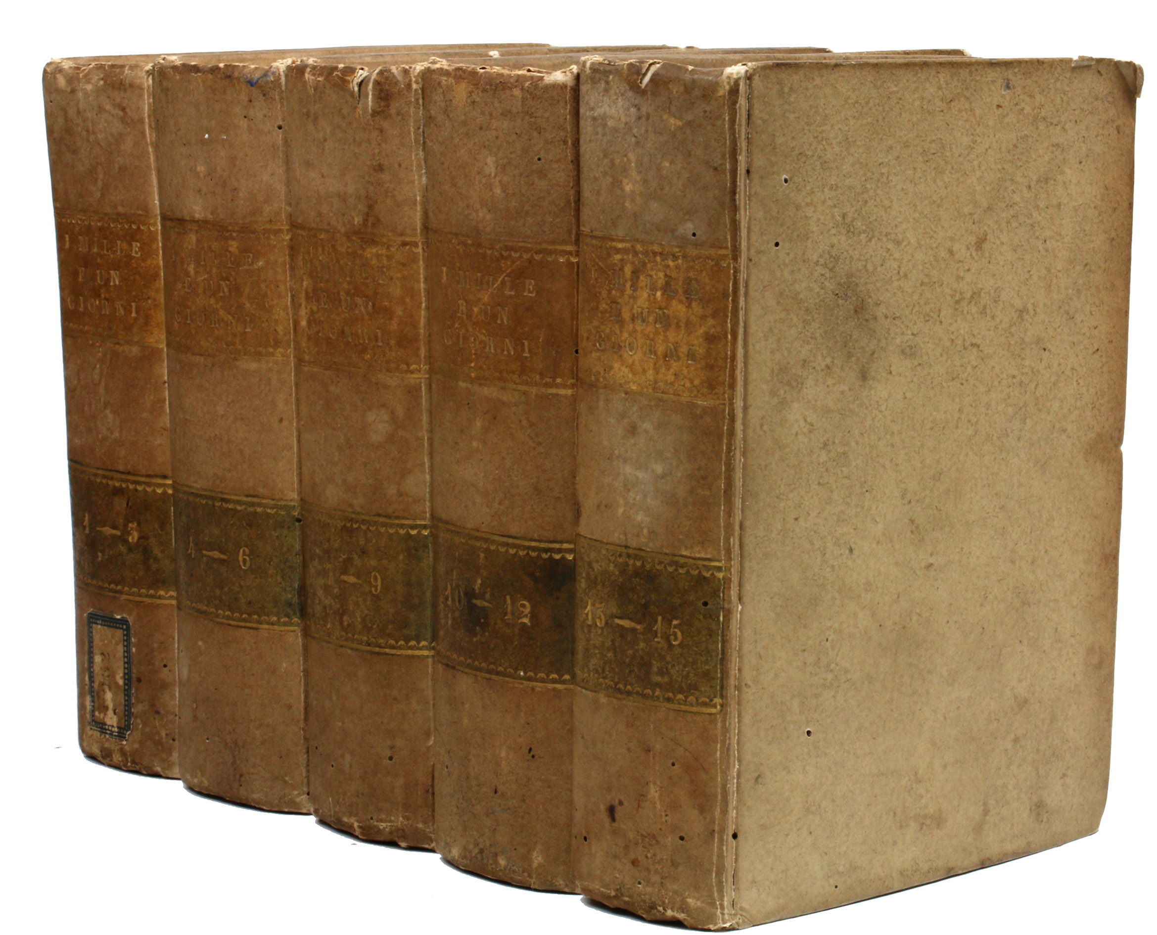 Venice, Giuseppe Antonelli, 1833-1834. 15 volumes bound as 5. 16mo. With an engraved frontispiece in each of the 15 volumes. Contemporary boards with a red title label and a black volume number label, both lettered in gold, on each spine.