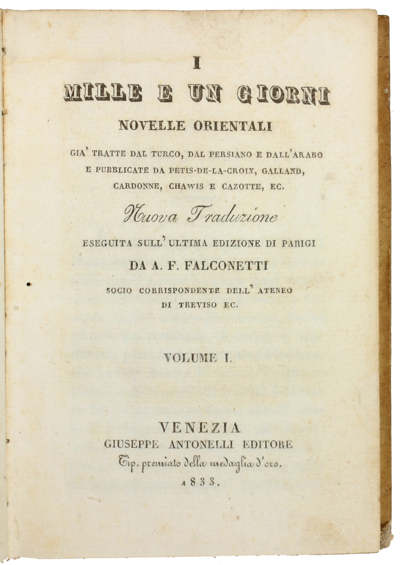 I mille e un giorni. Novelle orientali già tratte dal turco, dal persiano e dallarabo e pubblicate da Petis-de-la-Croix, Galland, Cardonne, Chawis e Cazotte etc. Nuova traduzione eseguita sullultima edizione di Parigi da A. F. Falconetti. Vol. I [-XV].