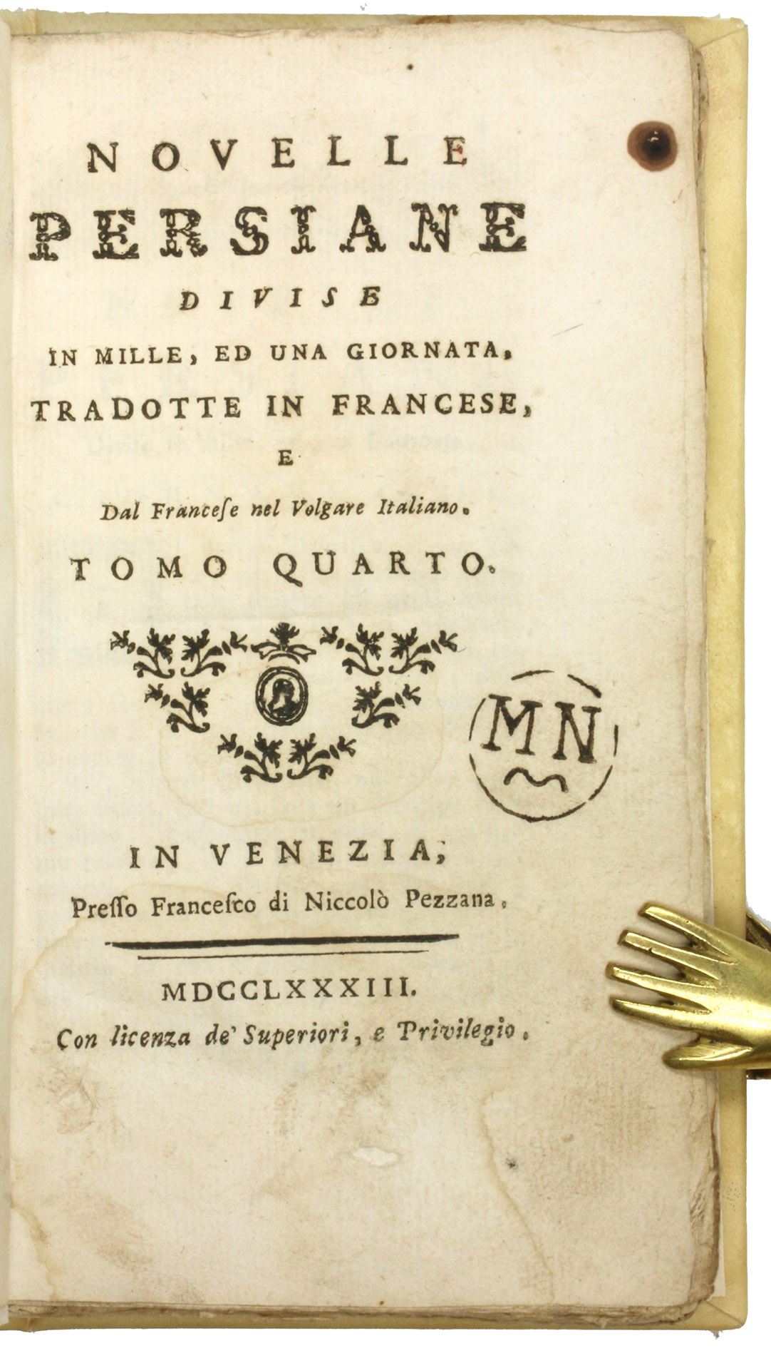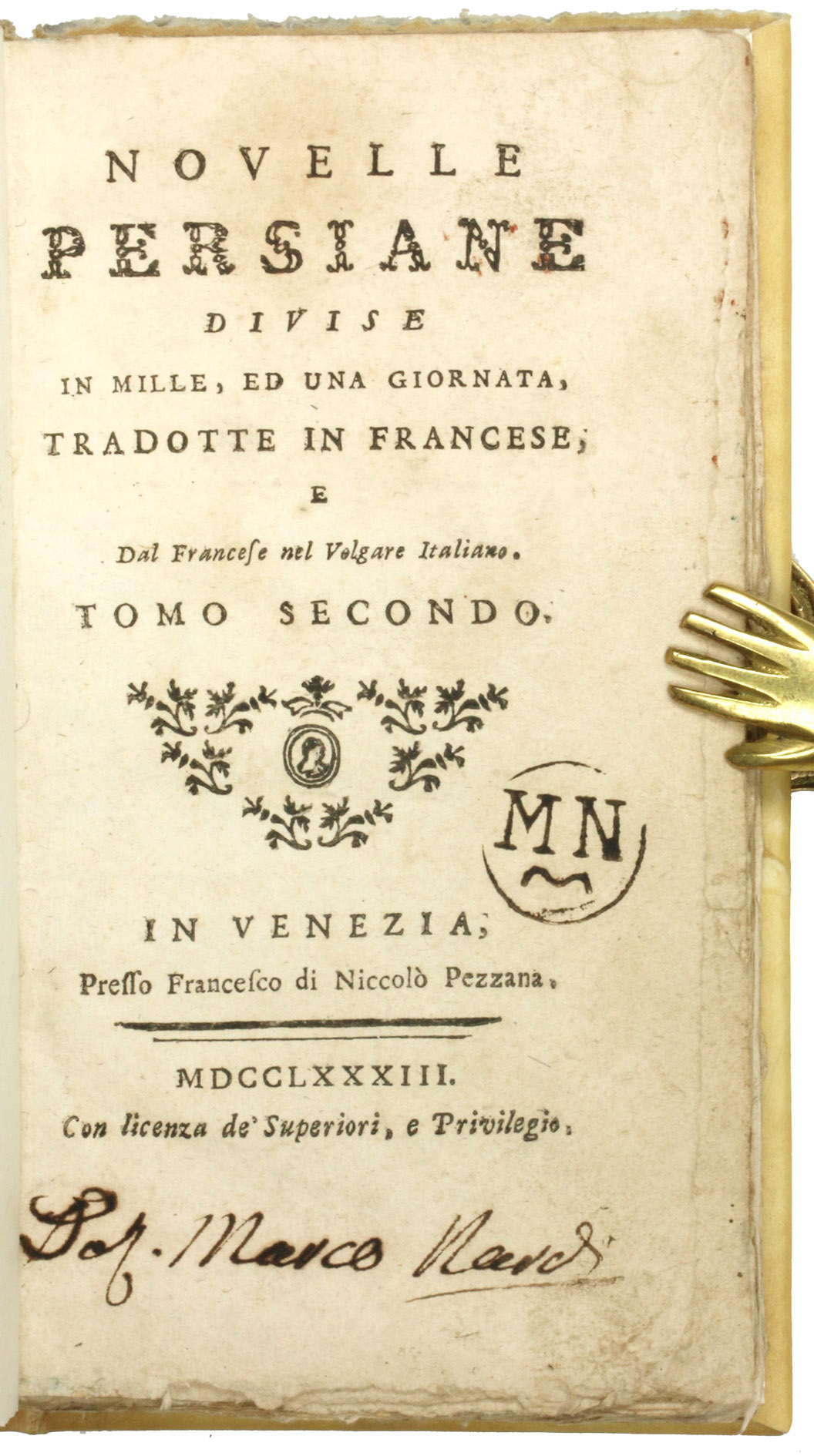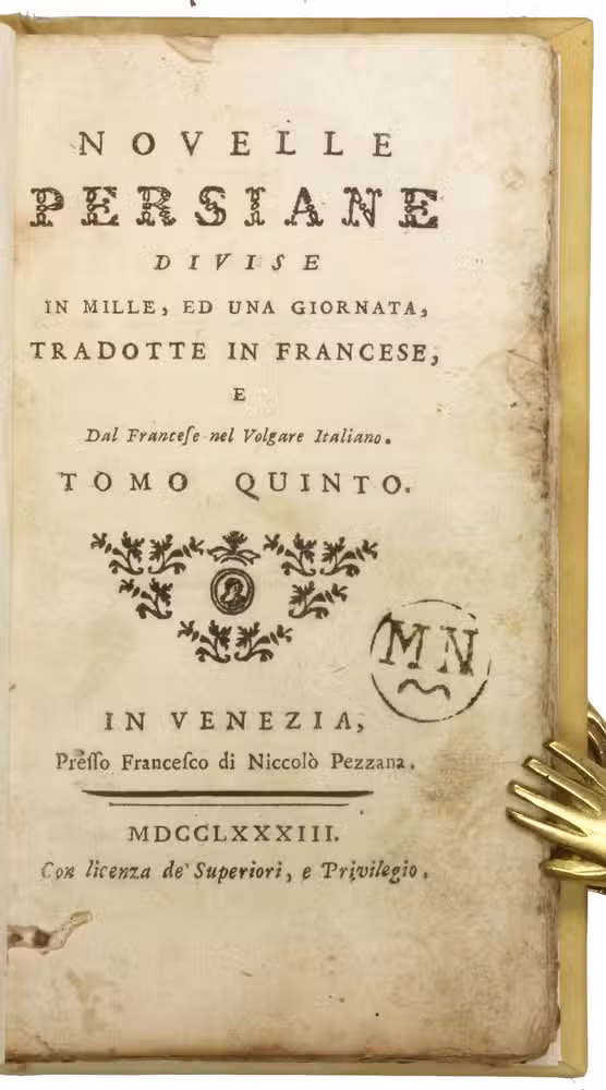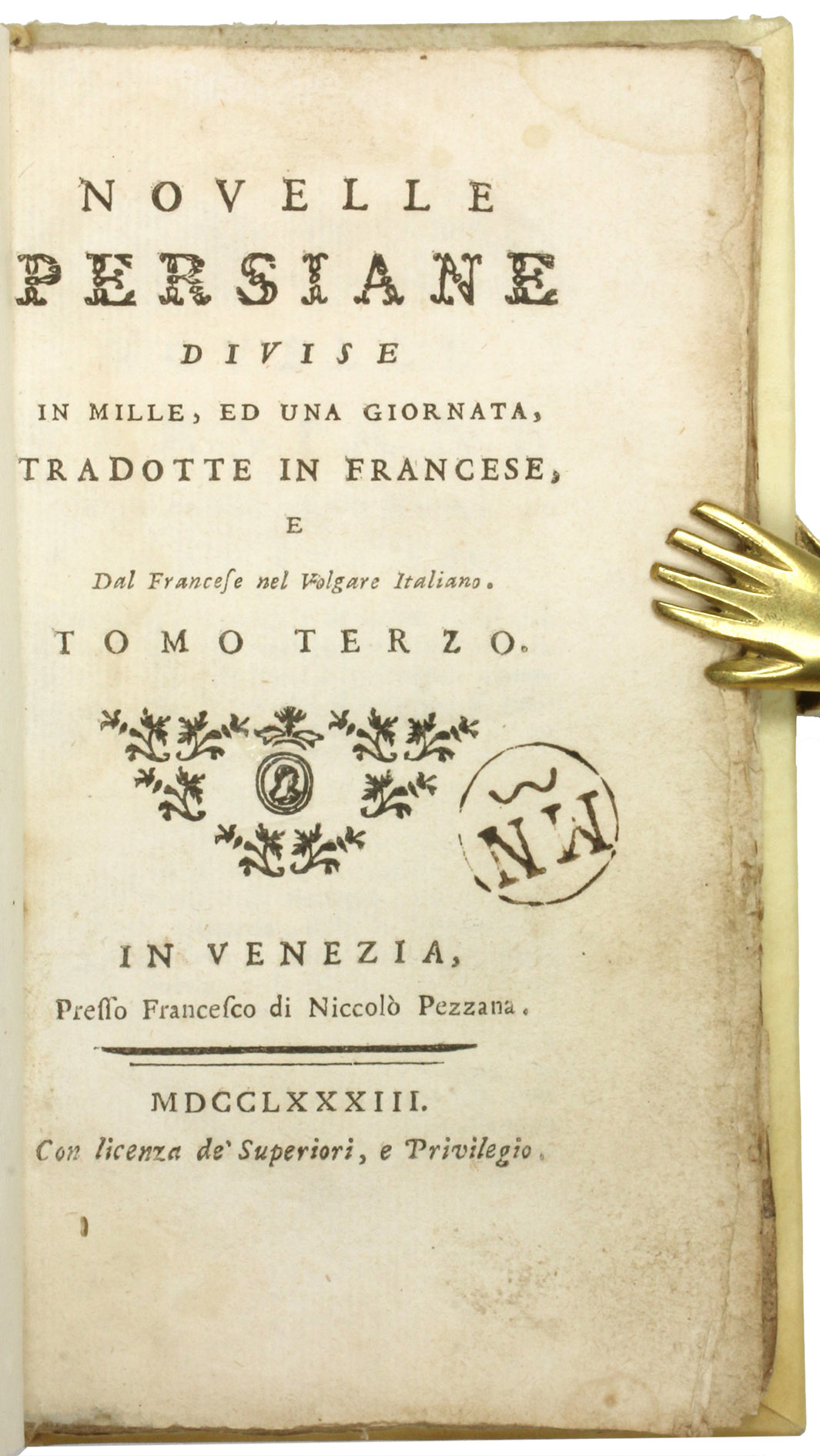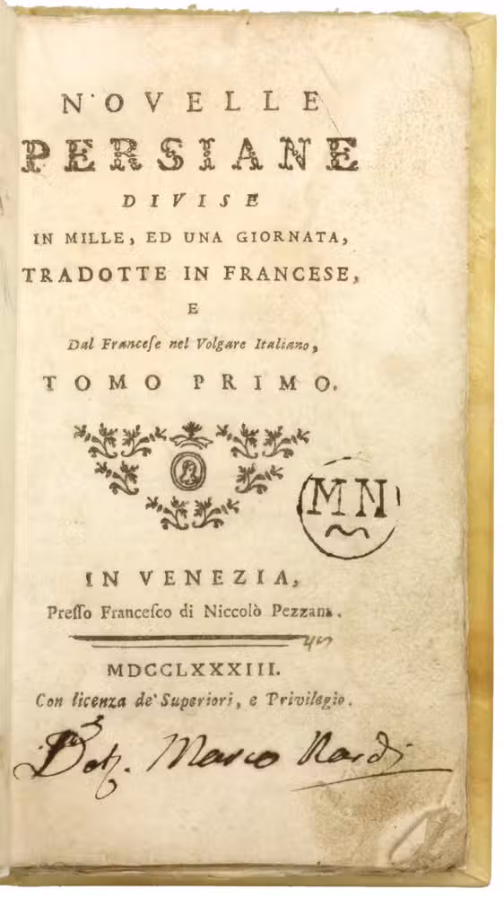 The present edition is printed by Niccolò Pezzana, who only the following year would produce the Thousand and One Nights part of an ambitious publishing project catering to the Venetian public, which at the time was rediscovering a taste for exotic fairy tales.