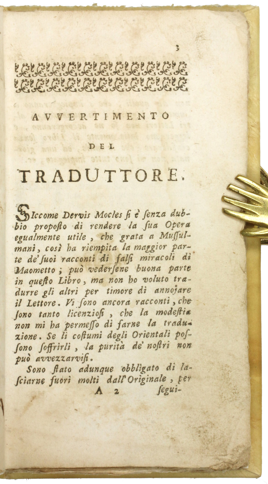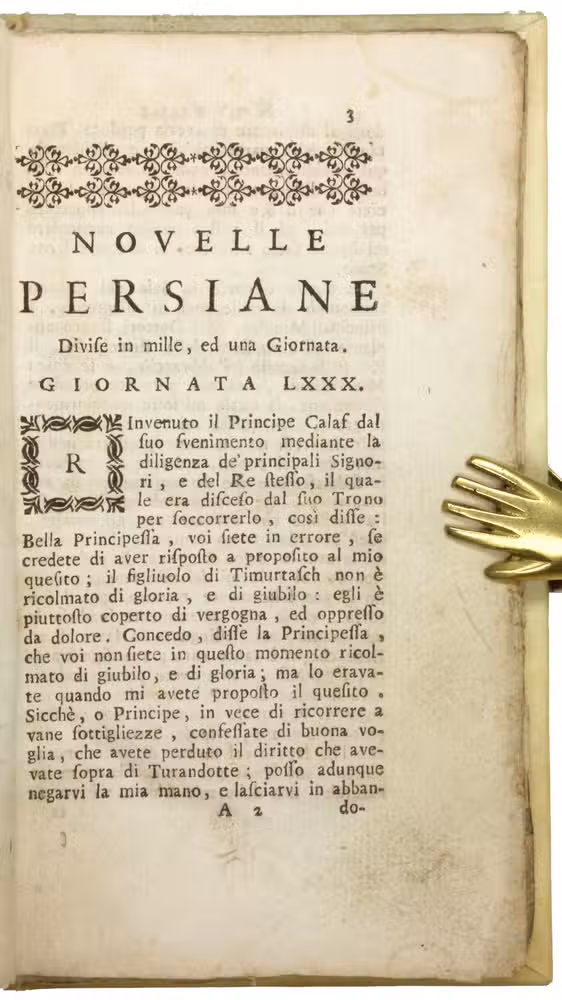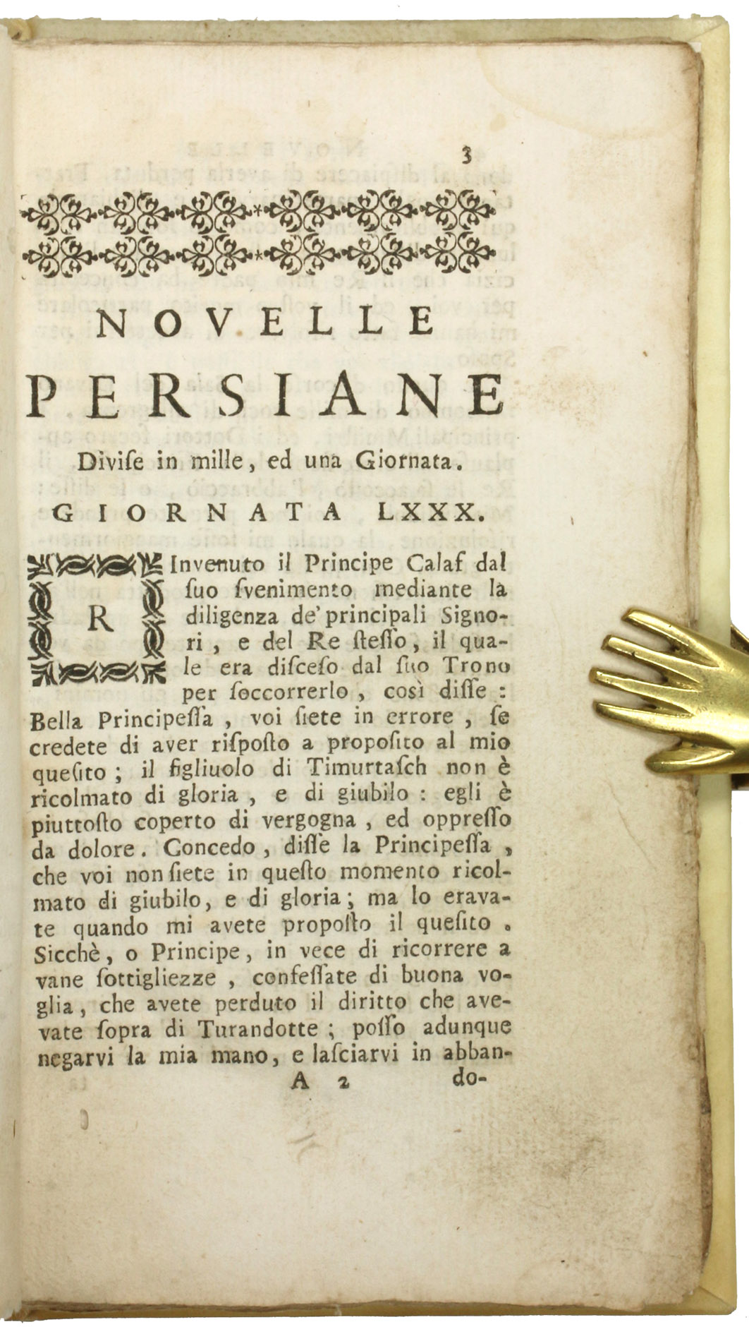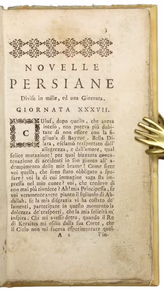 The present edition is printed by Niccolò Pezzana, who only the following year would produce the Thousand and One Nights part of an ambitious publishing project catering to the Venetian public, which at the time was rediscovering a taste for exotic fairy tales.