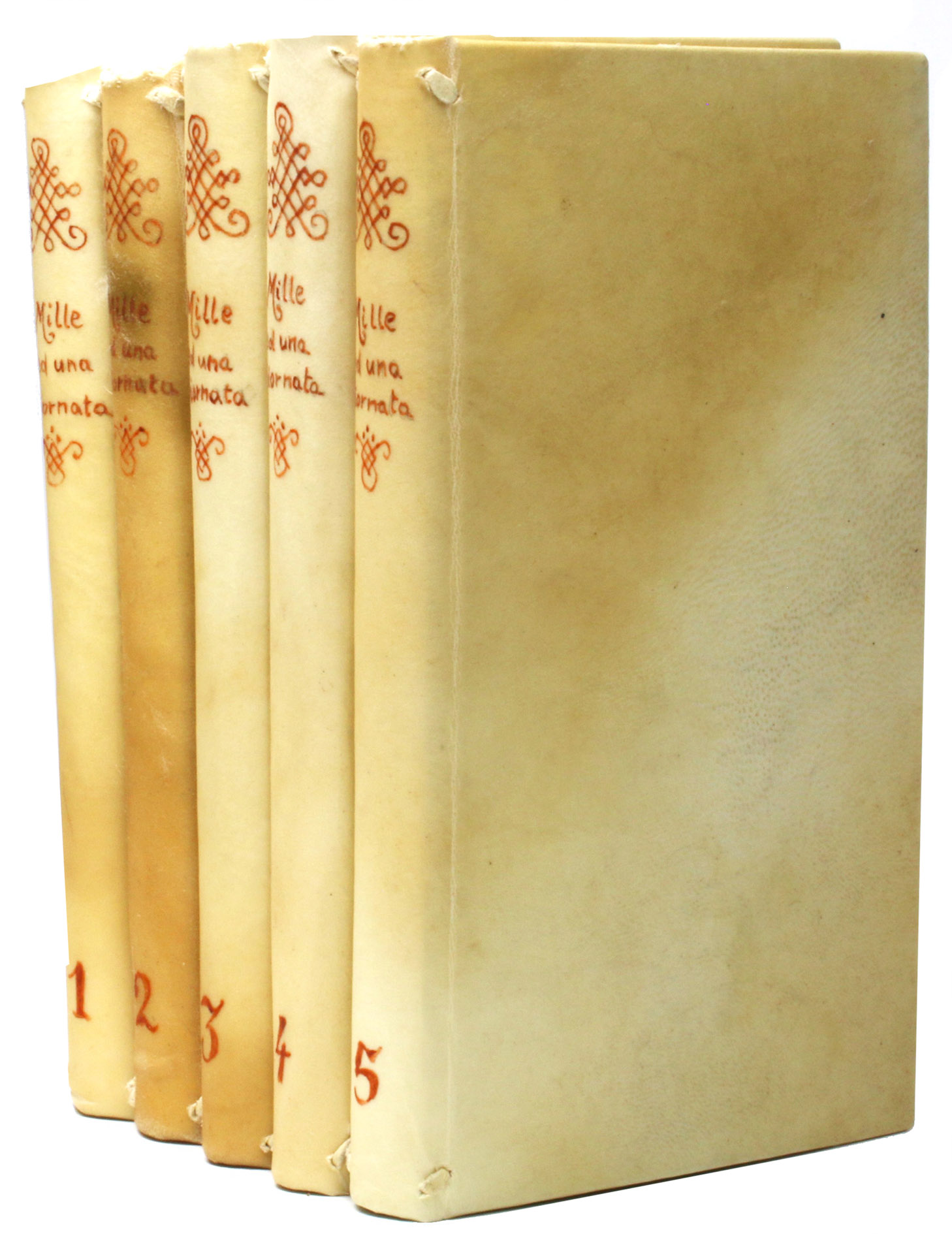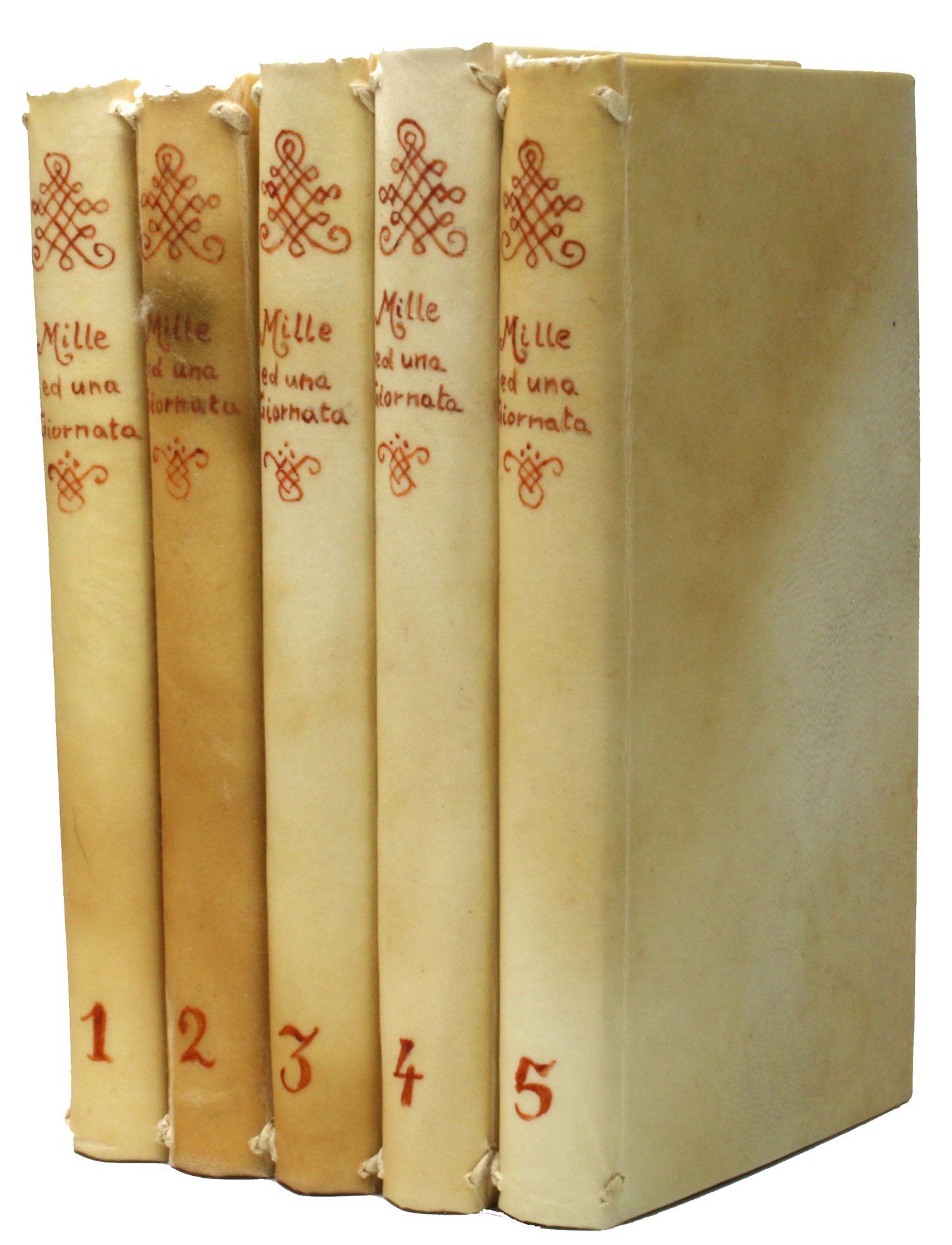 Extremely rare, charming five-volume Italian edition of the Heyaryek-Rouz or Thousand and One Days, so called to "give the work an air of originality" (Chauvin IV, 124). A Persian manuscript of this work was given to Francois Petit de la Croix in Isfahan in 1675, but enjoyed far fewer editions and translations than the Alf layla wa-layla. As Chauvin notes, it cannot be determined whether the Thousand and One Days or the Thousand and One Nights was composed first, nevertheless, to this day the Heyarek-Rouz is much less well-known to the Western world (IV, 123f.). Chauvin quotes one commentator who declares the Heyarek-Rouz "much more ingenious and more realistic, as it sometimes includes marvels, following the taste of the Oriental".