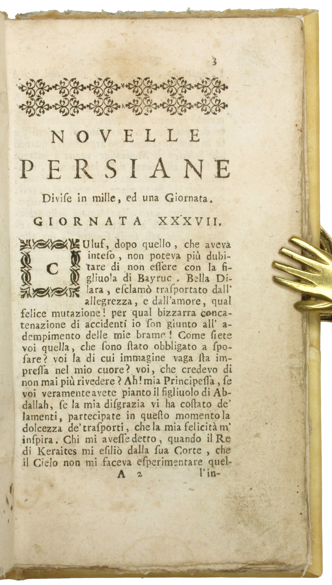 Novelle persiane divise in mille, ed una giornata. Tradotte dal francese e dal francese nel volgare italiano. Tomo primo [-quinto].