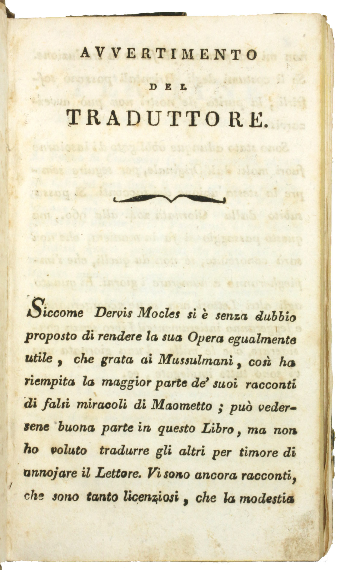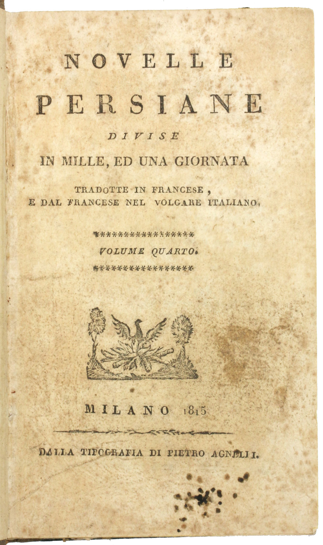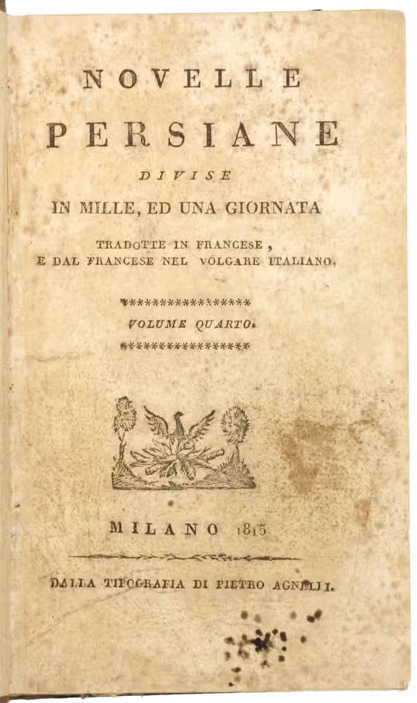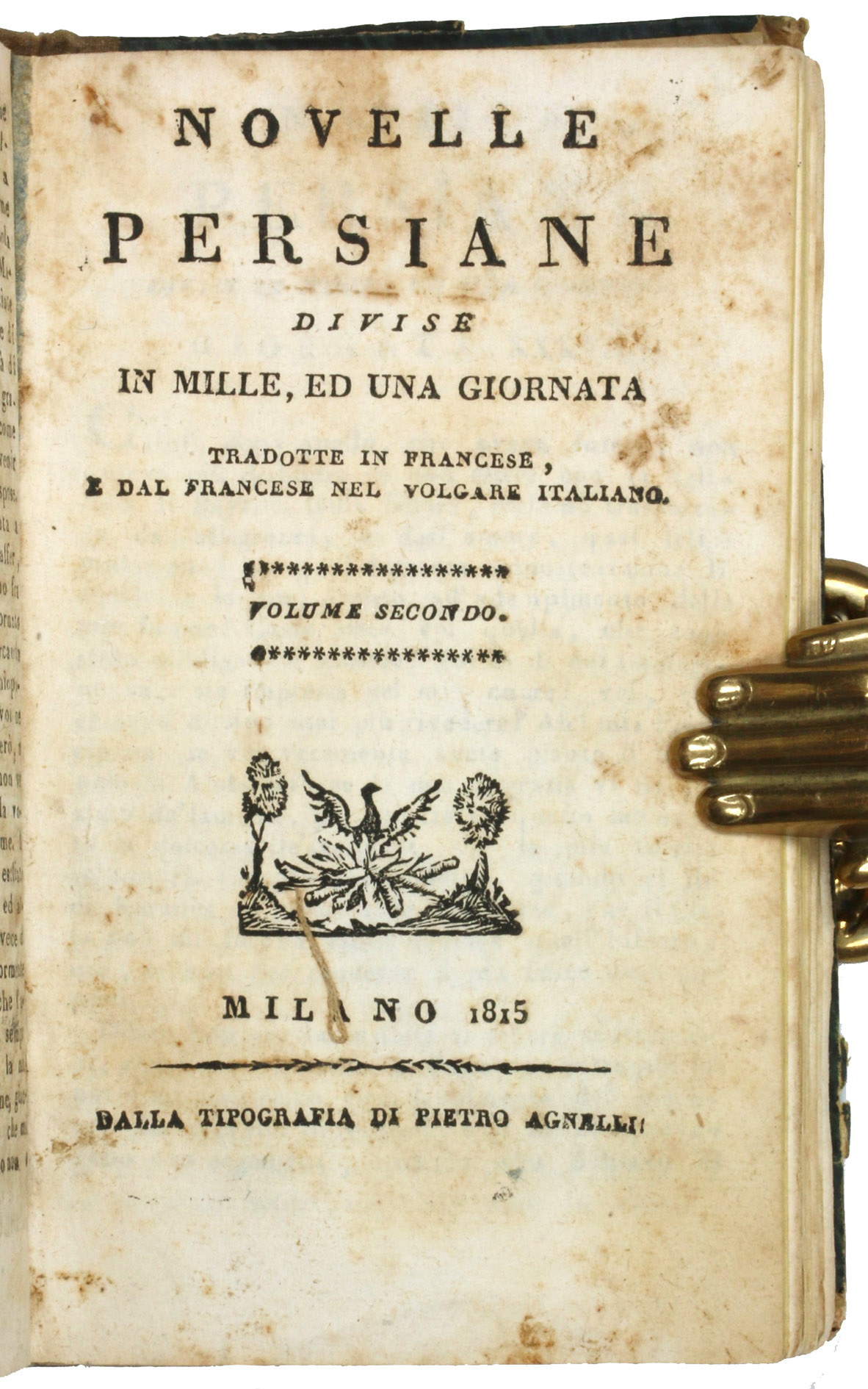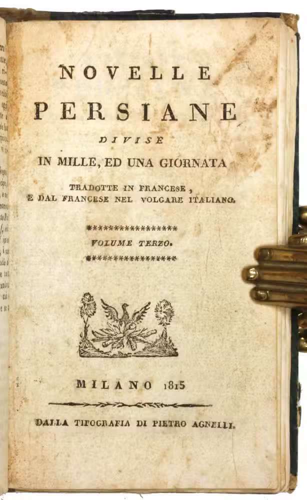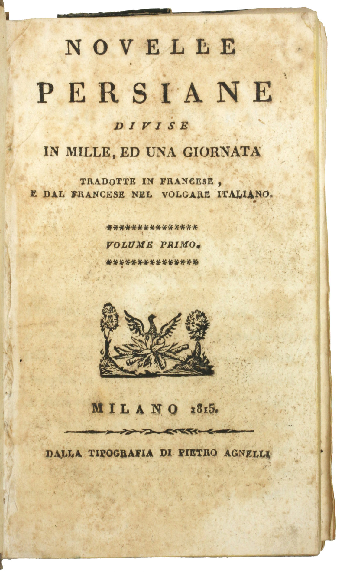 First and only Milan edition of the Heyaryek-Rouz or Thousand and one days, so called to "give the work an air of originality" (Chauvin IV, 124). A Persian manuscript of this work was given to Francois Petit de la Croix in Isfahan in 1675, but enjoyed far fewer editions and translations than the Alf layla wa-layla. As Chauvin notes, it cannot be determined whether the Thousand and one days or the Thousand and one nights was composed first; nevertheless, to this day the Heyarek-Rouz is much less well-known to the Western world (IV, 123f.). Chauvin quotes one commentator who declares the Heyarek-Rouz "much more ingenious and more realistic, as it sometimes includes marvels, following the taste of the Oriental".