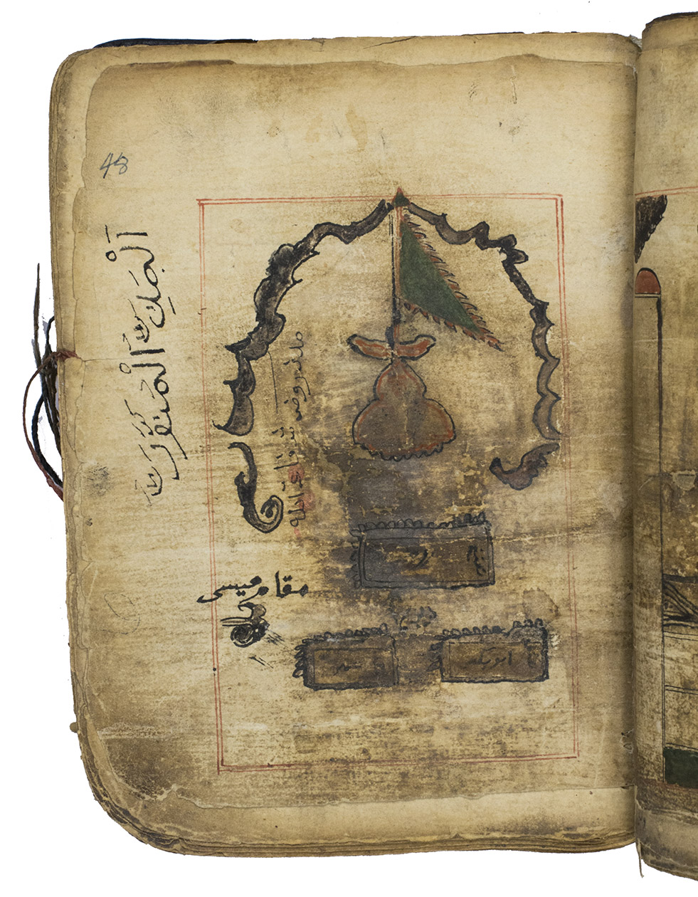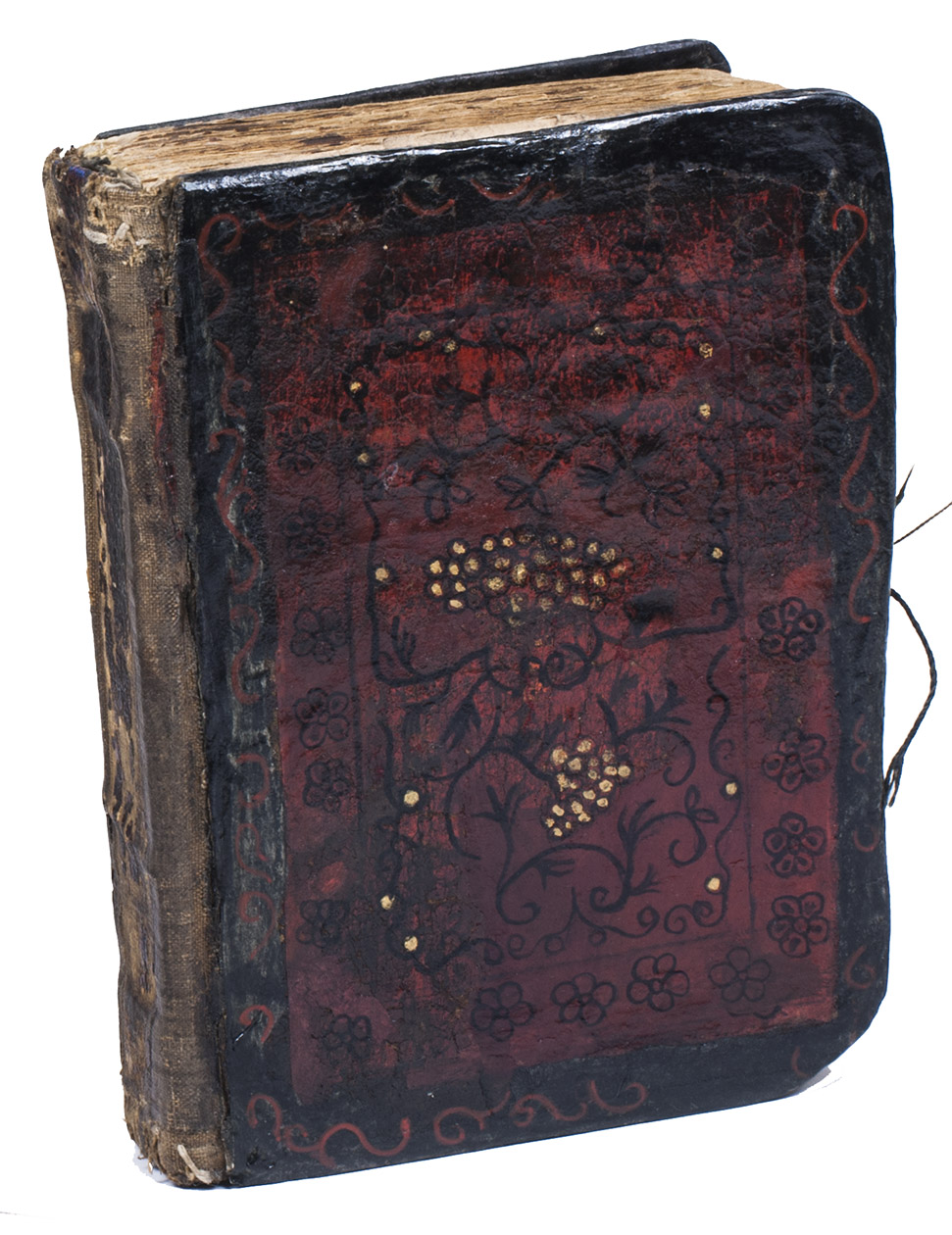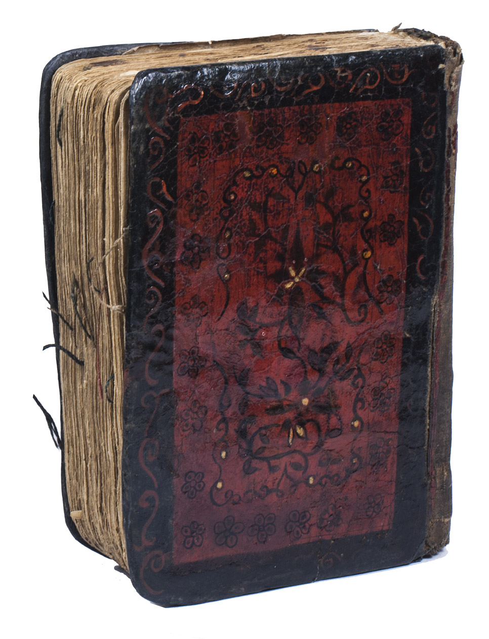 [Eastern Turkestan, now Xinjiang, China, early 17th century CE]. 4to (19 x 14 cm). Manuscript written in black ink on paper in Arabic script, with a red single- or double-line frame around each page, rubricated throughout, and two illustrations on pages 47 and 48) showing the "Ka'ba of Allah" (!) and the burial sites of the first three Rashidun Caliphs. The Arabic script is in the sini calligraphic style used in China, an archaic form mixing features of naskh and muhaqqaq. Contemporary(?) black, red and gold painted and lacquered leather over paper and cloth. The painted sides show floral designs in black and gold on a red background, in a black border with red wave designs. With remnants of leather on the brown cloth spine. [1], 337 pp.