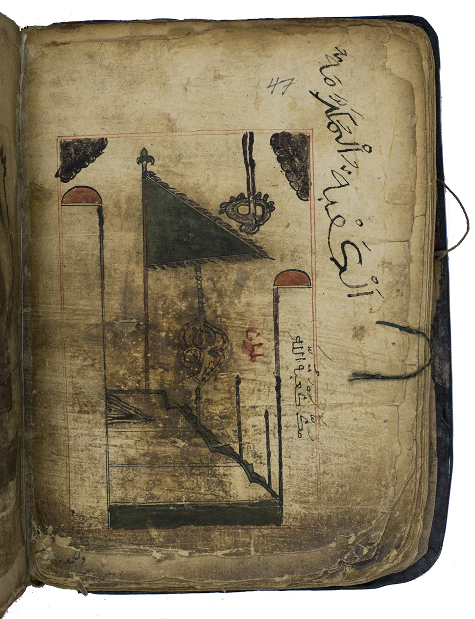 Occasional notes and/or corrections in the margins. With 4 leaves (pp. 12-19) that were not originally part of the manuscript, consisting of Arabic text (which is also rubricated) written on lilac-lined (printed) white paper with Chinese characters in the head margins of the pages. The numbering in Western Arabic numerals is most likely not contemporary, since the inserted pages are included in the consecutive page-numbering. With some annotations, some in Chinese characters on the front paste-down. The spine is worn, without affecting the integrity of the binding, the boards are somewhat worn but the painted designs remain clearly visible, edges somewhat frayed, the leaves are somewhat browned and stained, mainly finger staining in the bottom outer corners, showing the manuscript's popularity in extensive use. Otherwise the text is still very clearly legible and the whole is altogether well preserved.