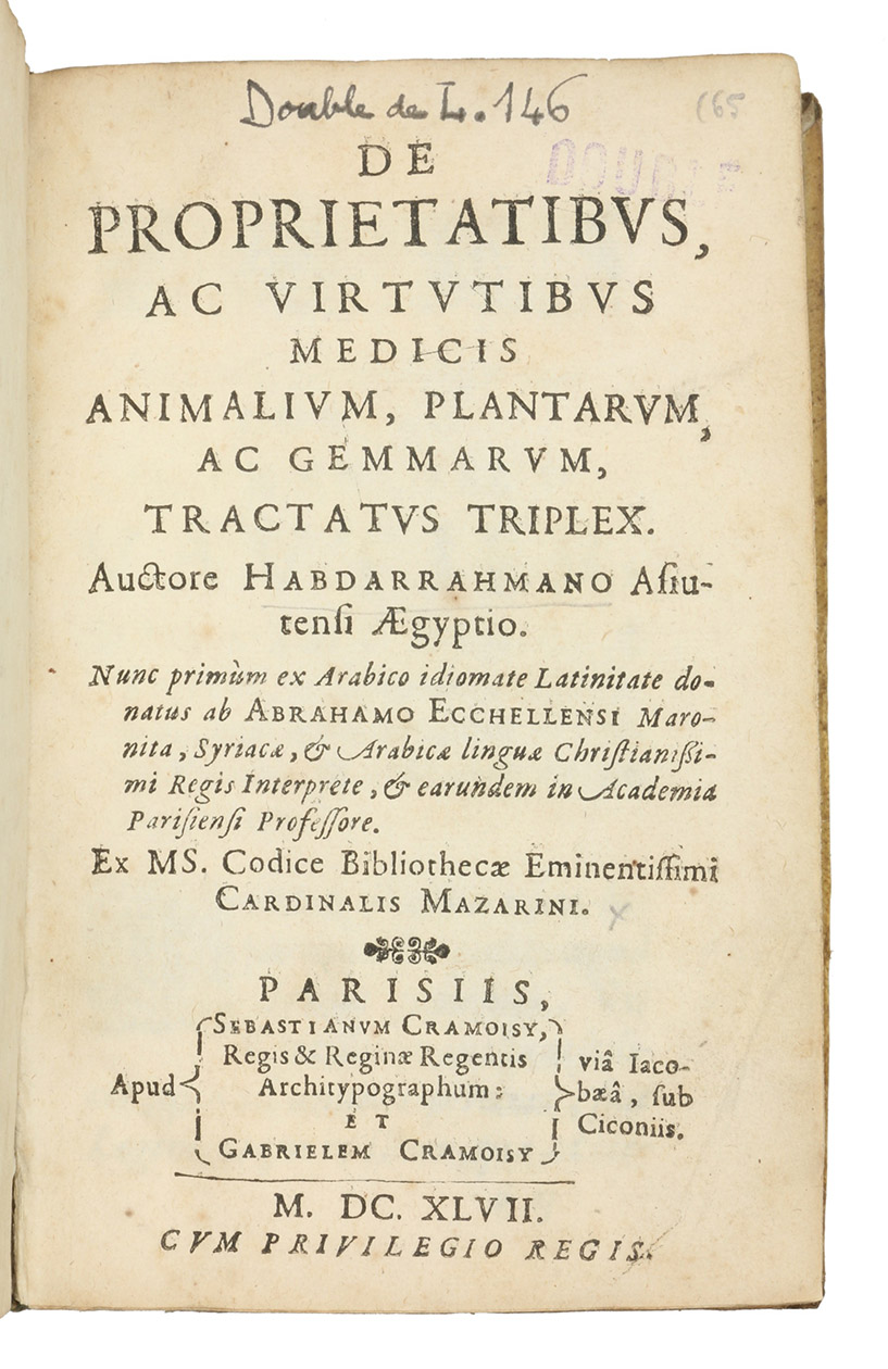 First Latin translation of a three-part pharmacological treatise on the nature and effect of medicines gained from animals, vegetables, and minerals (including some quite superstitious material), published under the name of the mediaeval Egyptian polymath Abd al-Rahman Al-Suyuti, whose "versatility stands out as unique in the history of Arabic literature" (Brockelmann, GAL II, p. 144), but probably assembled from various Arabic sources. The first part, covering animals, is likely Al-Suyutis own "Diwan al-Hayawan", translated by Abraham Ecchellensis after a manuscript in Cardinal Mazarins library; the authors and manuscript sources of the following two parts remain unidentified. The notes at the end include a few words set in Greek, Hebrew, naskh Arabic and serto Syriac type. Sébastien Cramoisy had been appointed director of the Imprimerie Royale in 1640 and was assisted there by his younger brother Gabriel. Although the present book nowhere uses the words "Imprimerie Royale", it calls Cramoisy "Regis & Reginae Regentis Architypographum" and notes its royal privilege. The Arabic and Syriac type are probably those of Savary de Brèves, which he brought to Paris in 1614. In 1641, Cramoisy had bought matrices for roman and italic types cut by Jean Jannon in Sédan, later mistakenly attributed to Claude Garamont, but he appears never to have used the romans and here not even the italics. The book it therefore set mostly in types by Claude Garamont and Robert Granjon.