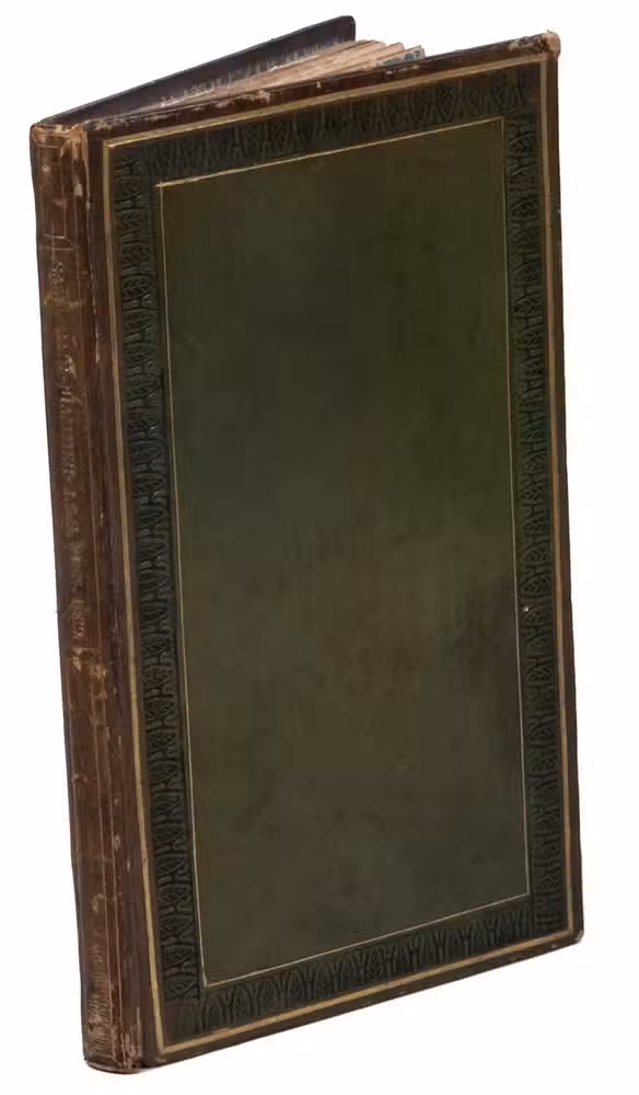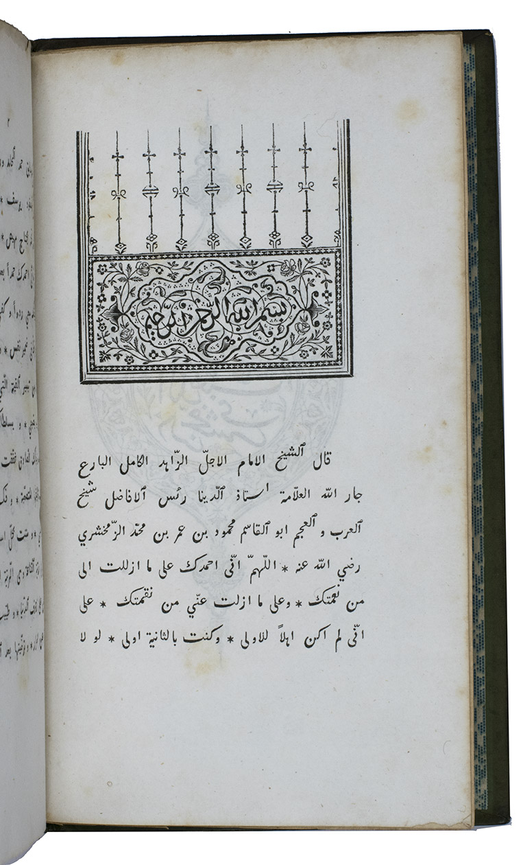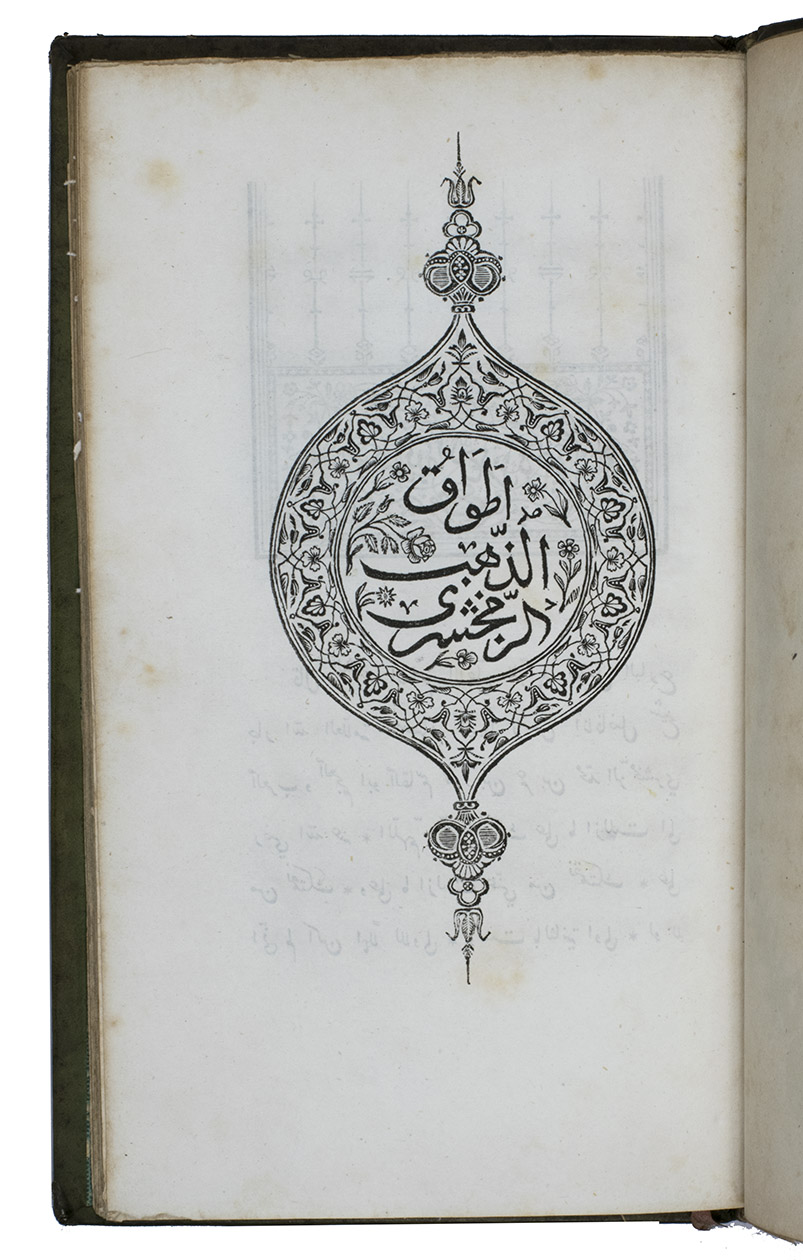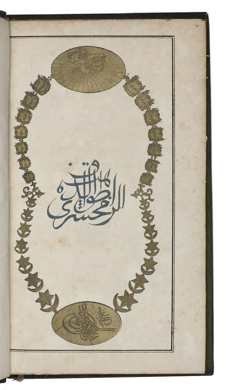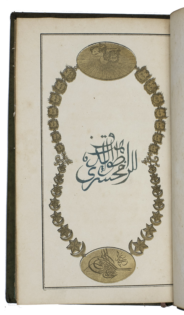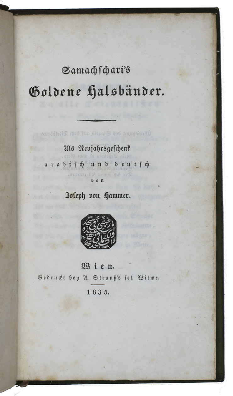 Vienna, widow of A. Strauss, 1835. 8vo. With two identical plates showing the golden necklace around a calligraphic Arabic inscription, the necklace hand-coloured in gold and the inscription in blue, as a frontispiece for both the Arabic and the German text (on the first and the last page). The Arabic title is incorporated into a printed circular medallion with decorative points at the head and foot on the first page, and the main Arabic text opens on the back of the same leaf with an elaborate headpiece. Text set in German and Arabic. Contemporary green calf (spine faded to brown), with a gold- and blind-stamped frame on each board. [1], [1 blank], 54 pp. (German text); 27, [1] ll. (Arabic text).