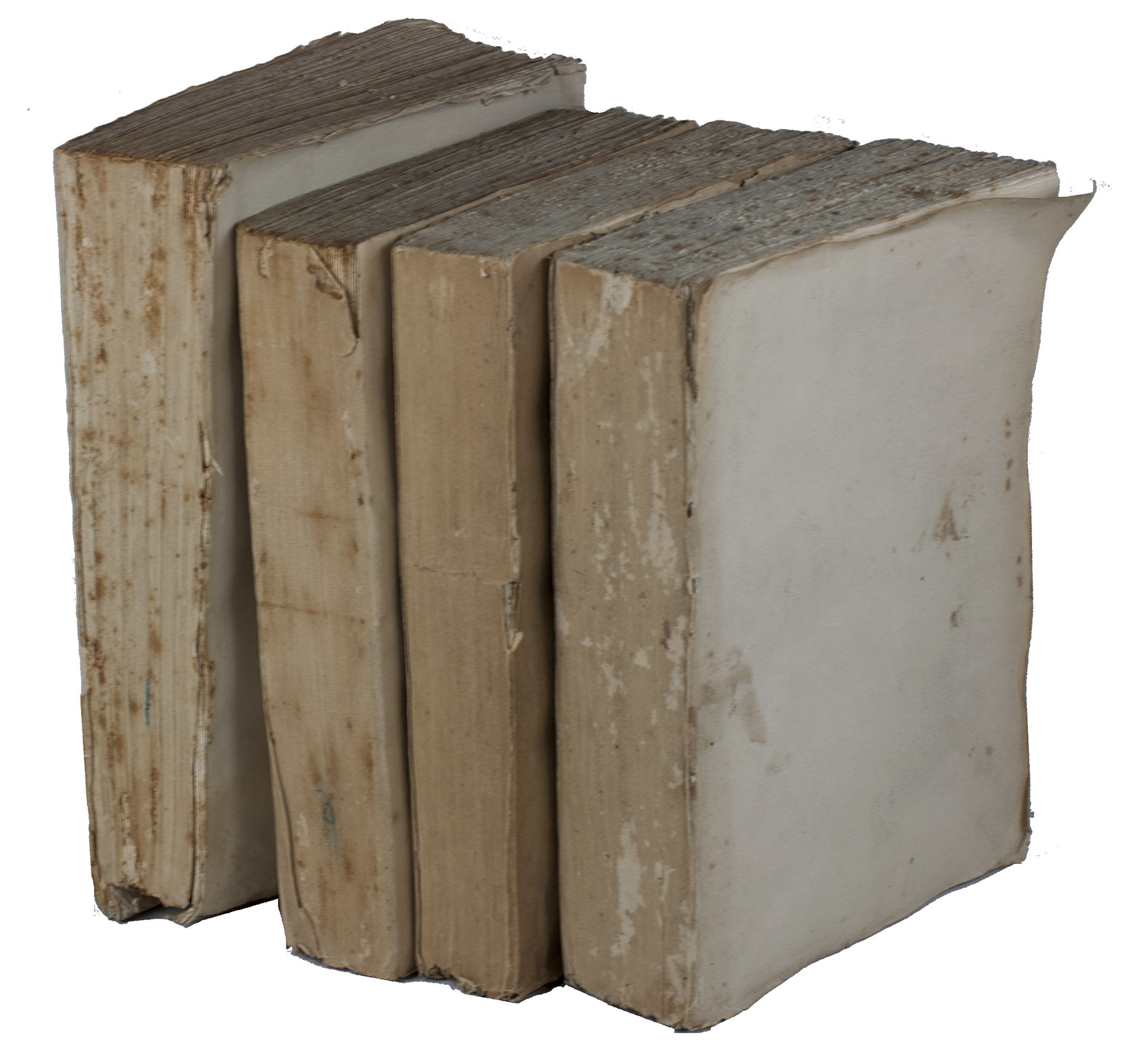 Coimbra, Real officina da universidade, 1796. 4 volumes. 4to. With a woodcut royal Portuguese coat of arms on title-page of each volume. Contemporary plain paper wrappers. VIII, I-XV, [1 blank], 385, [1 blank]; [4], XIX, [1 blank], 565 [=465], [1 blank]; [4], XX, 452;
