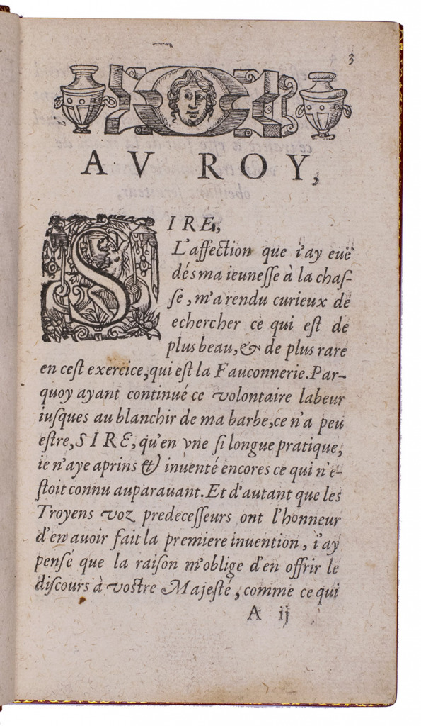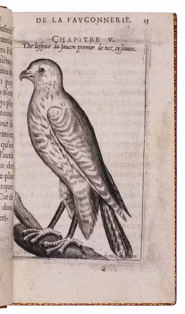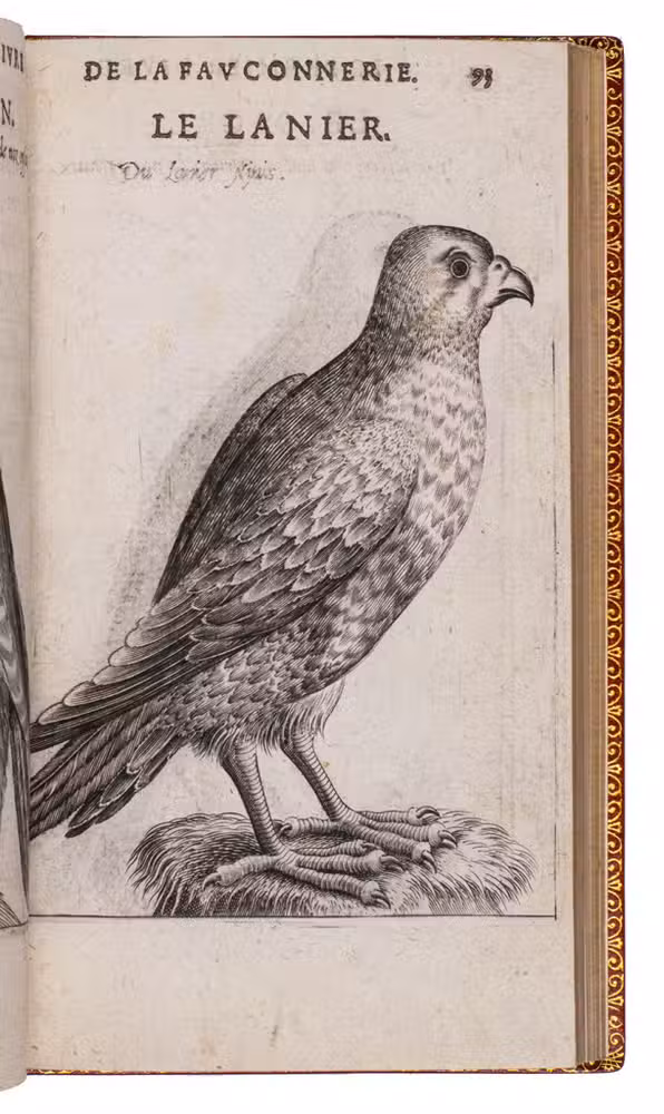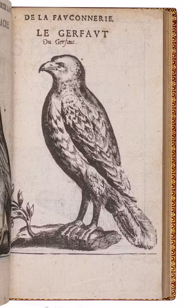 With an 18th-century endleaf, a ca. 1800(?) monogram stamp on the title-page and a modern armorial bookplate. Washed and lacking F8 (supplied in facsimile), but that leaf contains only repeats of 2 engravings plus their captions and a 4-line verse, with no other text. Three other plates are slightly shaved, affecting the tip of one bird's tail (present in the repeat plate), the beak of another and a small bit of foliage in a third plate, a corner torn off 1 leaf (affecting one shoulder note), a small hole in another, a worm hole in the foot margin of the last few leaves and a faint water stain in the fore-edge margin of a few leaves. Still generally in good condition, the binding fine. Very rare classic of falconry and hawking. Harting, Bibl. accipitraria 153 note; Nissen, IVB 35; Ronsil 3120; Schwerdt, p. 41; Souhart, col. 16; Thiébaud, col. 28 & supp. col. 1050; USTC 20901 (3 copies); Wellcome I, 388; cf. Lindner, Bibl. Jagdliteratur 11.0077.01; for the binder Godillot: Fléty, p. 82.