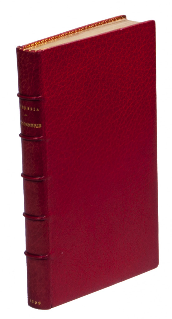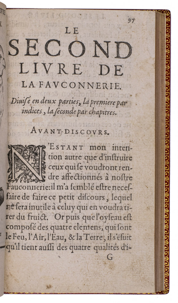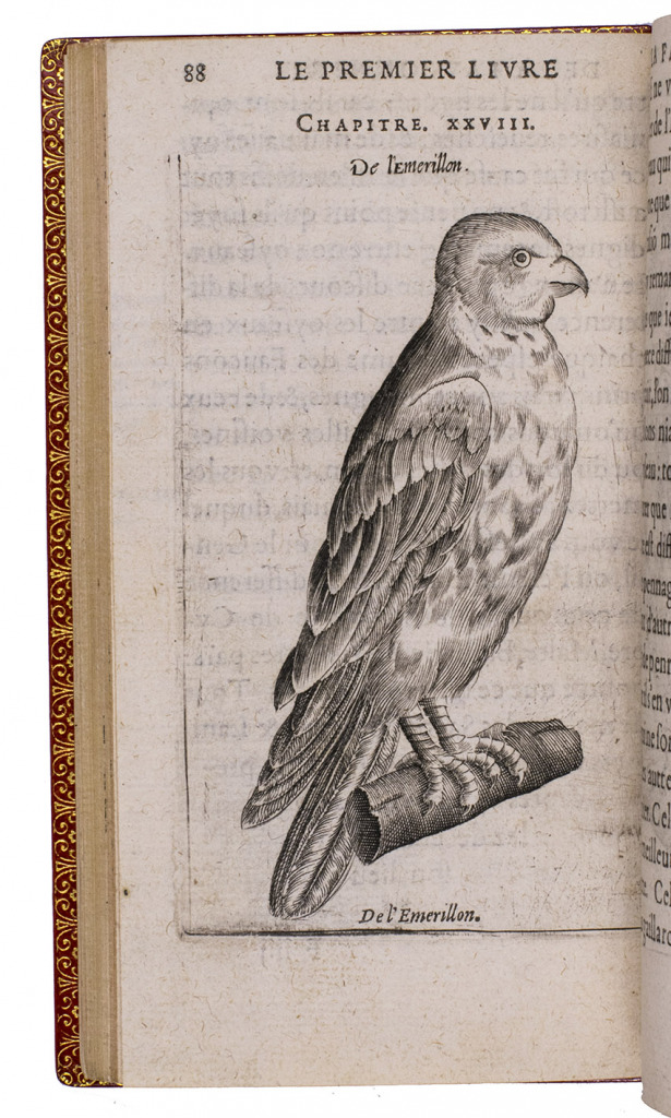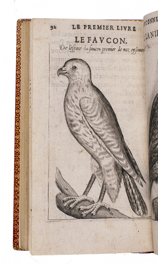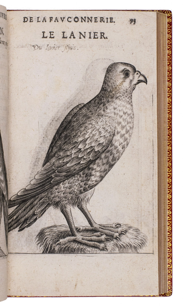 Paris, Jean Houzé, 1599. 8vo. With Houzé's woodcut device, 6 full-page engravings of birds of prey (12.5 x 8.5 cm) plus 3 (of 5) repeats and all on integral leaves. Red goatskin morocco, signed in the foot of the front turn-in by M[arcel] GODILLOT (active as bookbinder 1938-1975), with wide gold-tooled turn-ins and gold fillets on board edge. 272, [8] pp.
