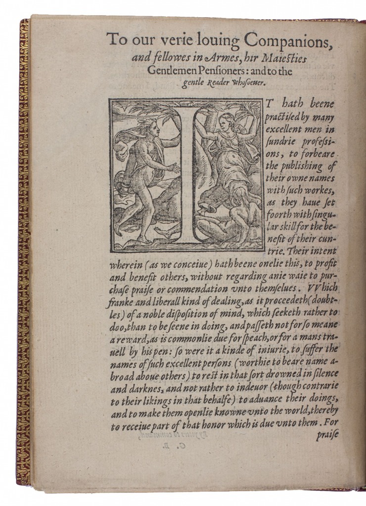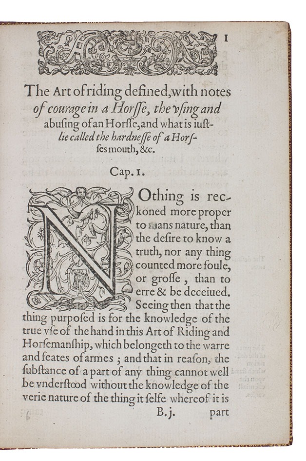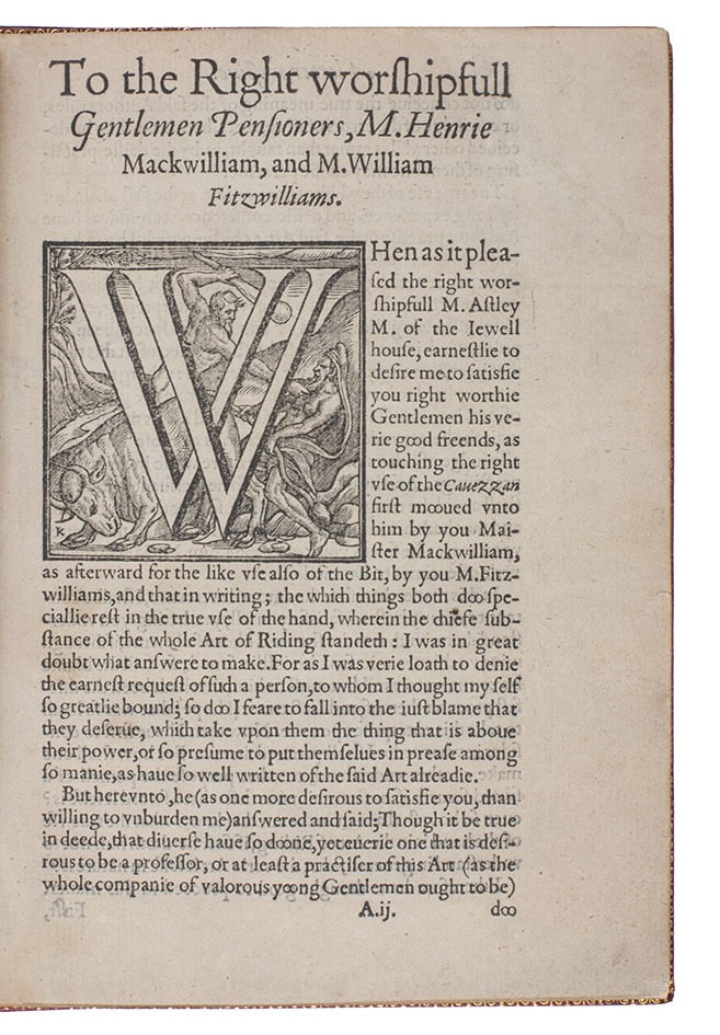 With the first three leaves somewhat browned and their upper outside corners skilfully and unobtrusively restored, slightly affecting the corner of one headpiece and a few letters of the text, and a tear in the fourth leaf restored without loss, but otherwise in good condition, with only an occasional minor blemish. A rare classic of horsemanship deserving pride of place in any collection on the subject. Dejager, Great books on horsemanship (2014), 38; Huth, p. 11; Podeschi 12; STC 884 (8 complete & 2 incomplete copies).