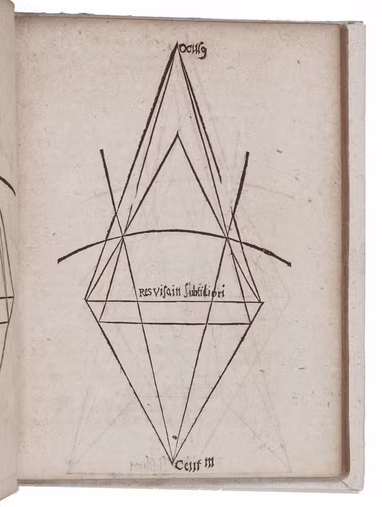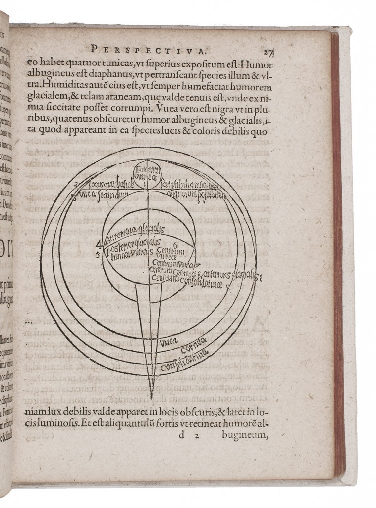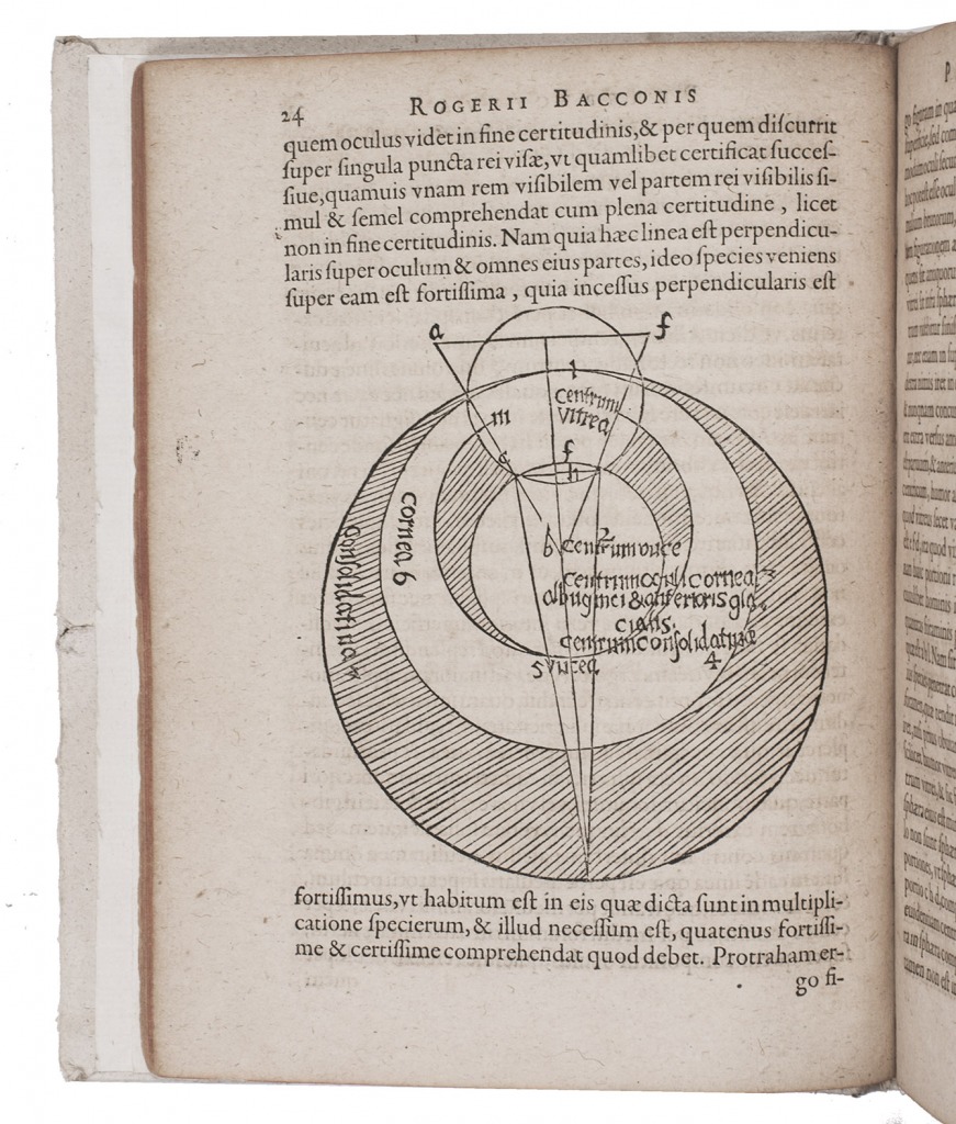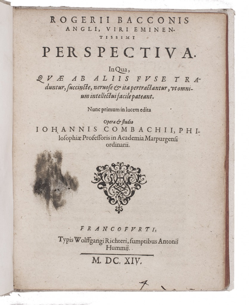 First edition of a famous work on optics by the English natural philosopher and mathematician Roger Bacon (ca. 1220-ca. 1292). Bacon was well read in Arabic and ancient Greek sources on optics and perspective, a subject hardly studied in Europe during the earlier Middle Ages. The main sources for his theories were the writings of Euclid, Ptolemy and Alhazen (Ibn al-Haytham), and he followed Robert Grosseteste concerning the importance of light and in his emphasis on the use of lenses, not only for burning, but also for magnification to aid natural vision. Bacon advised magnifying glasses for old people as well as for people with weak eyes. The Perspectiva belonged to Bacon's Opus maius, compiled in manuscript in 1266-1267. The present edition was based on a medieval manuscript and was edited by Johann Combach (1585-1651), professor of philosophy at Marburg in Germany