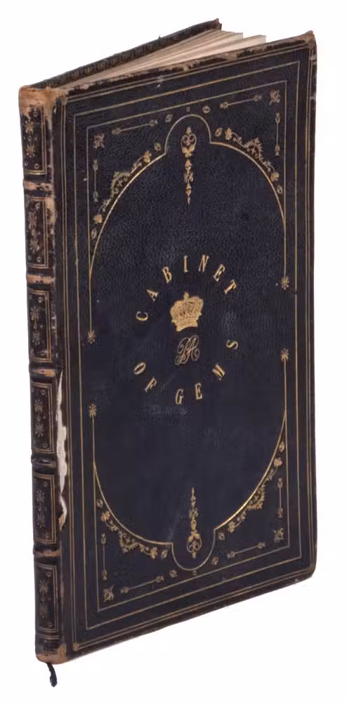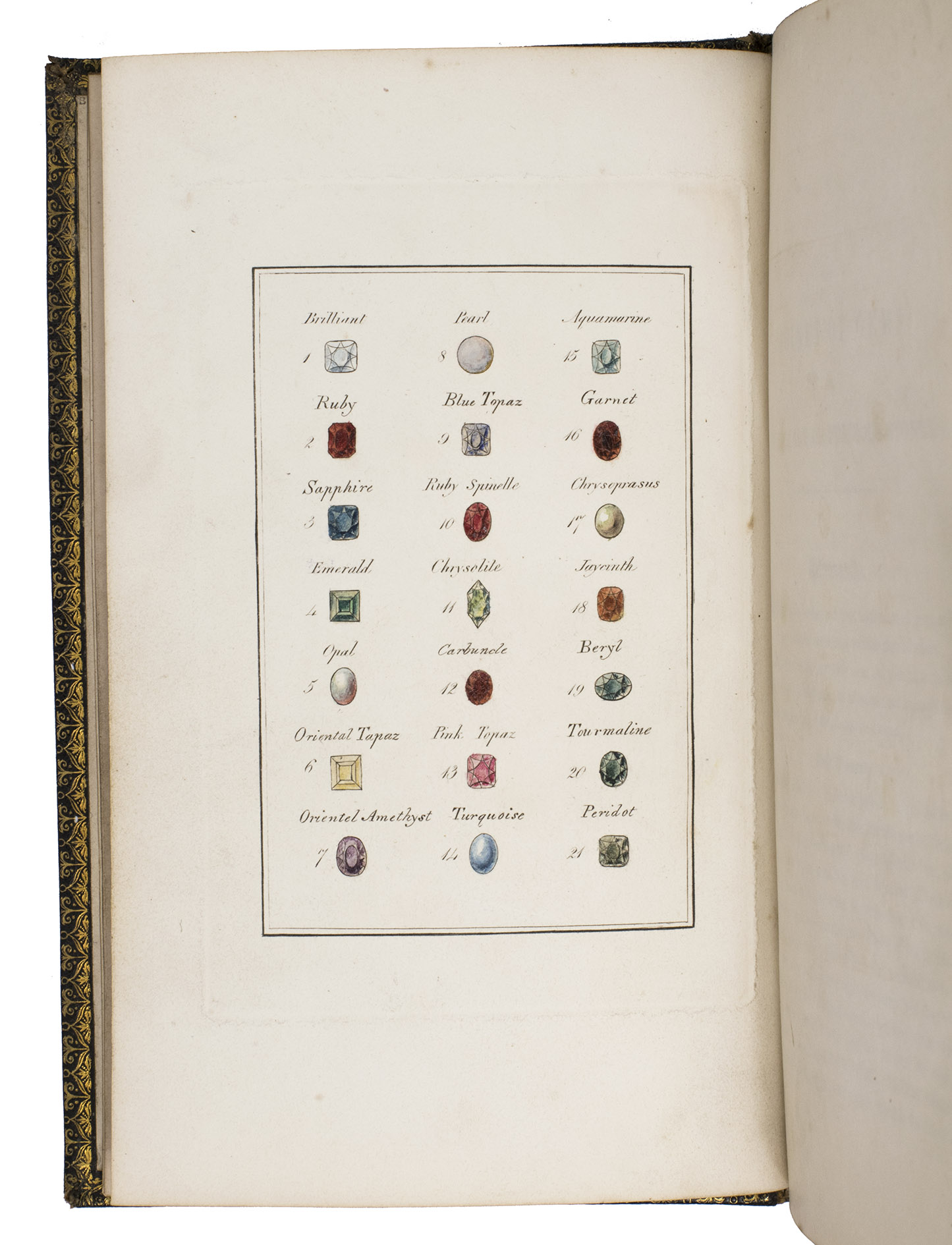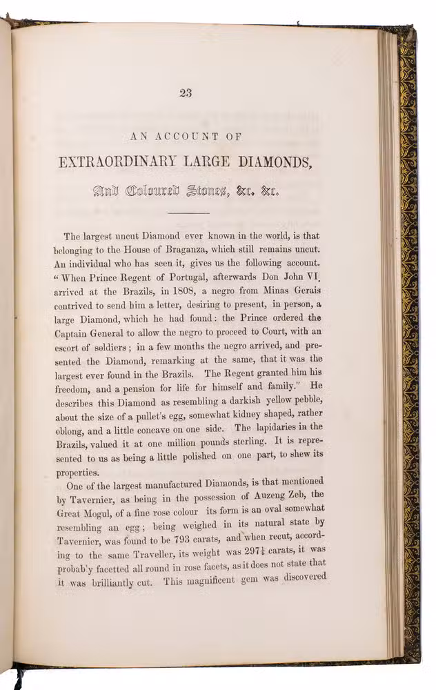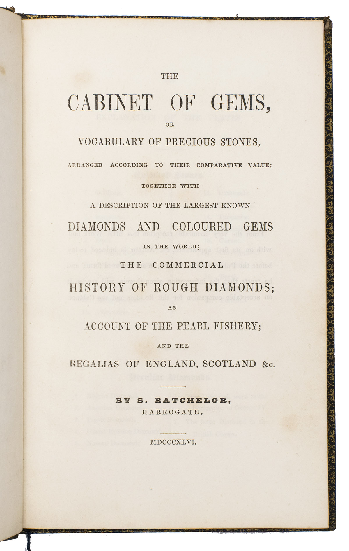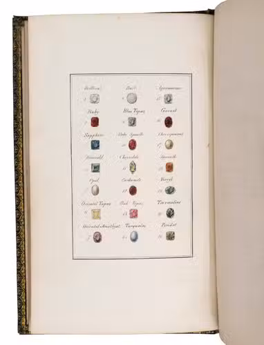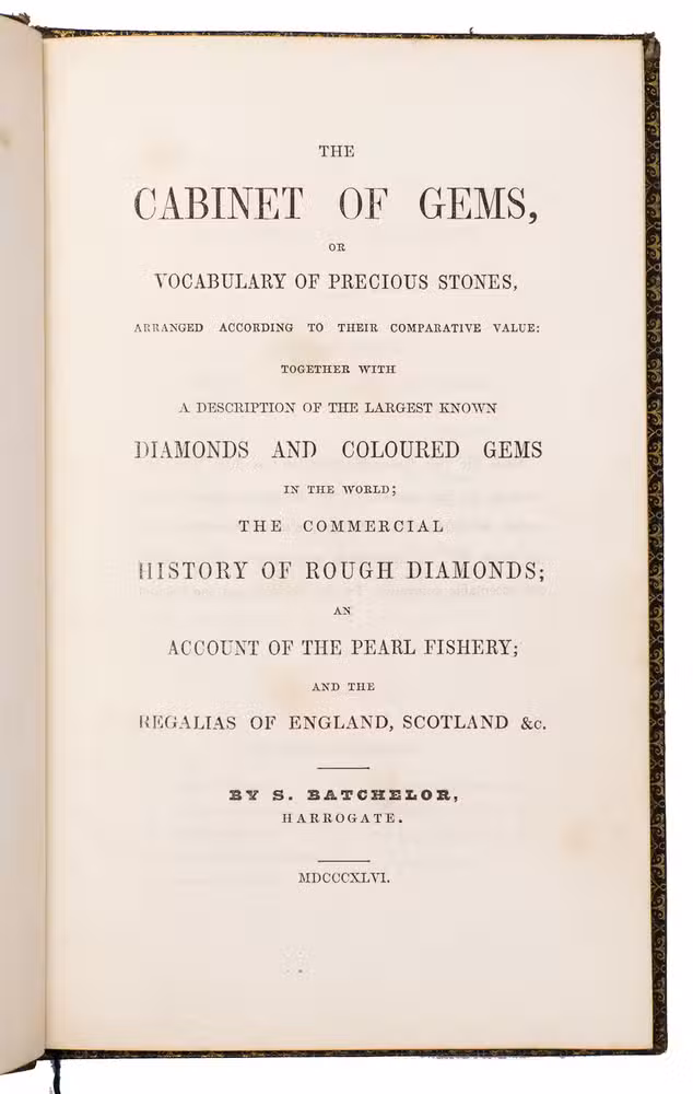 Harrogate, by the author, 1846. 8vo. With a full-page lithographic plate celebrating the marriage of Queen Victoria and Prince Albert, and 2 full-page engraved plates: a coloured plate of 21 different gemstones and a partially coloured plate showing different cuts of diamonds. Contemporary gold-tooled black morocco, with a crown and the initials PA in the centre on the front board, the title on both sides in a decorative frame, gold-tooled board edges and turn-ins, green reading ribbon, gilt edges. III, [1 blank], 96 pp.