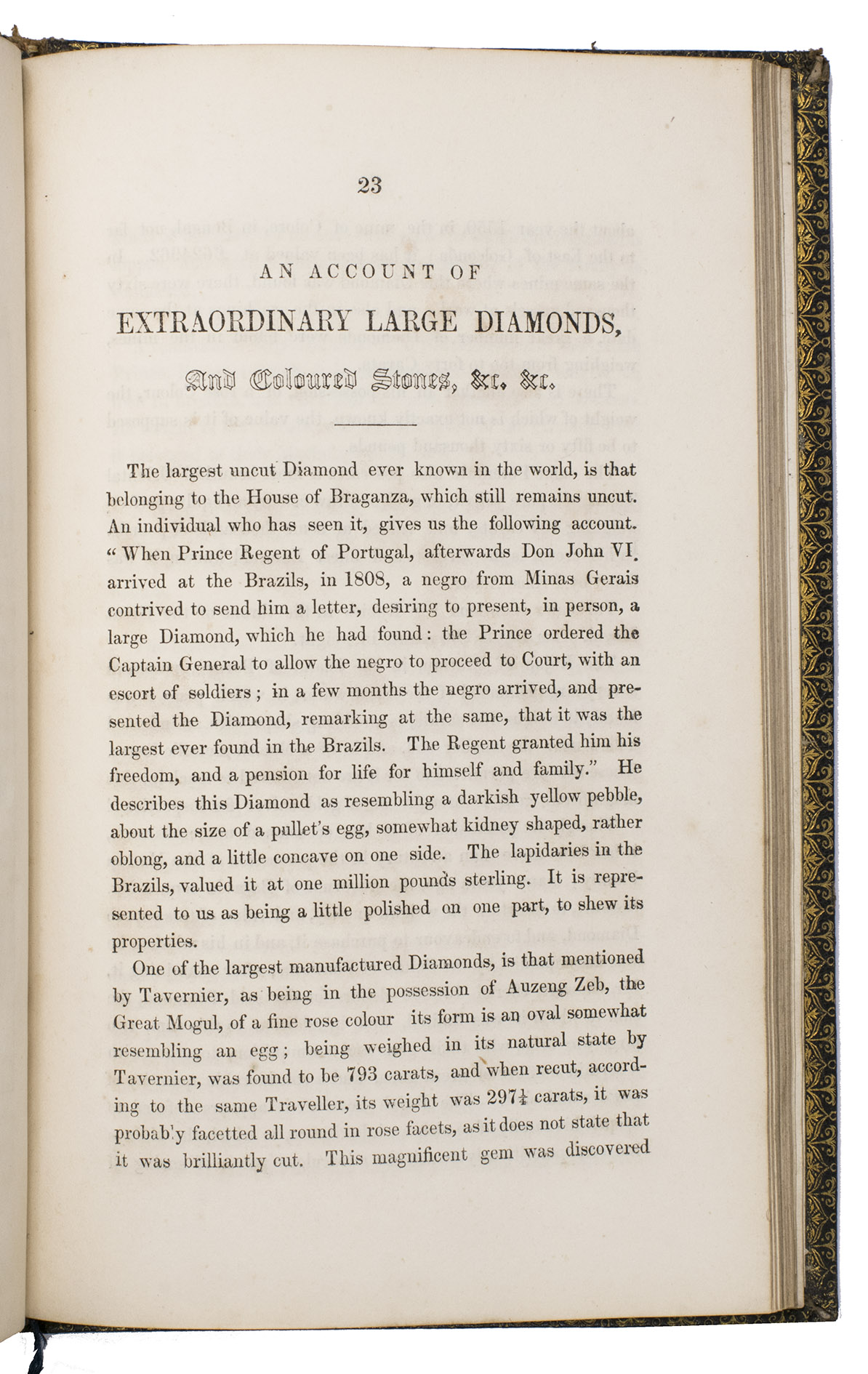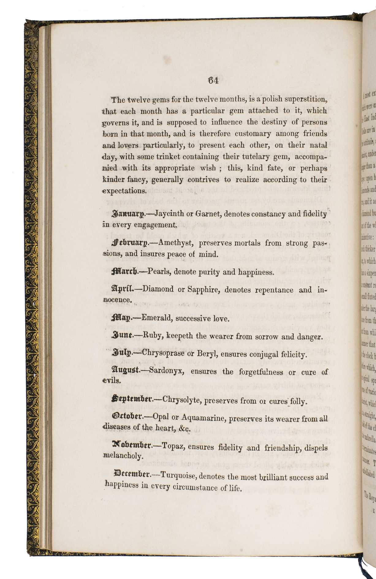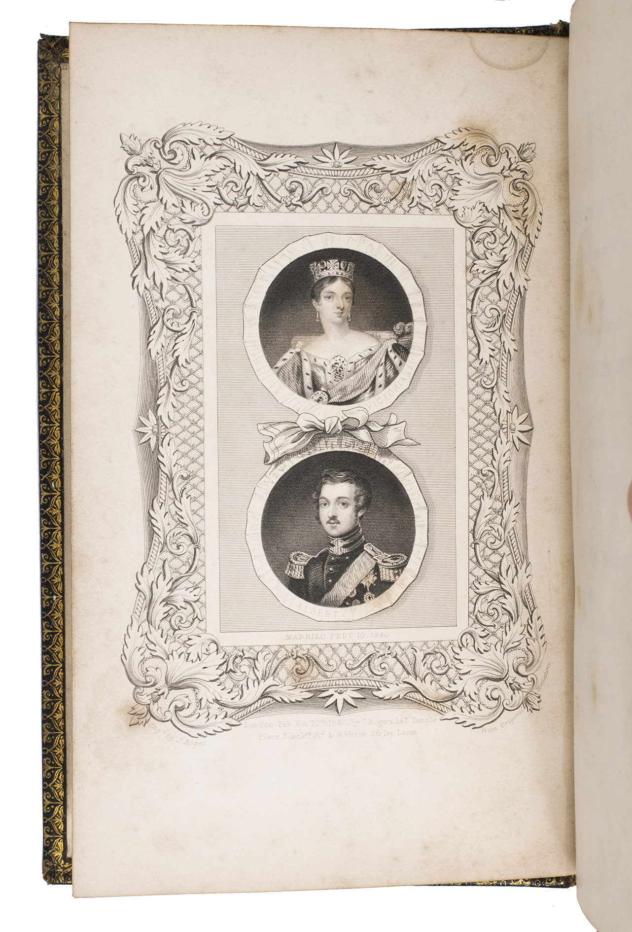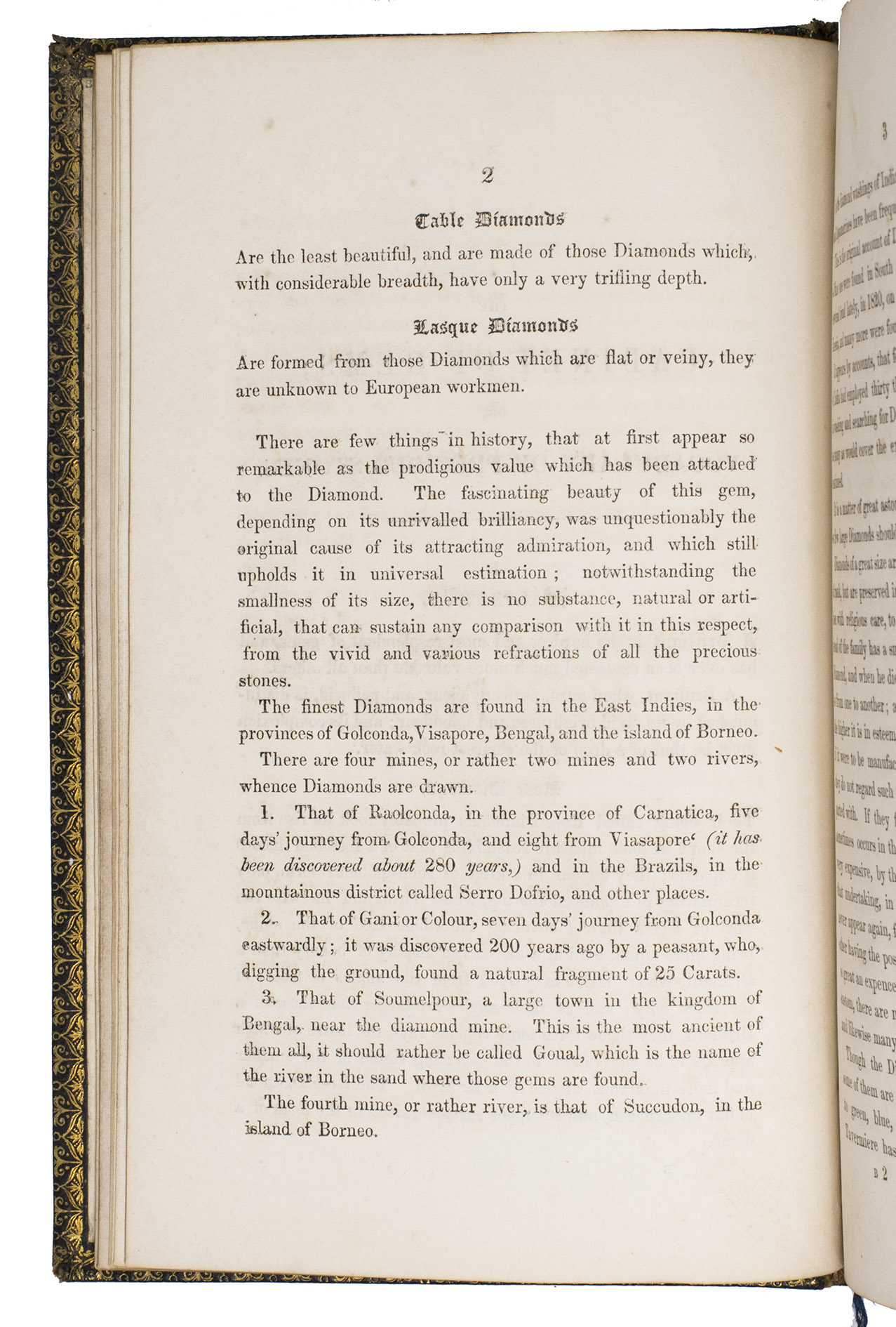 Harrogate, by the author, 1846. 8vo. With a full-page lithographic plate celebrating the marriage of Queen Victoria and Prince Albert, and 2 full-page engraved plates: a coloured plate of 21 different gemstones and a partially coloured plate showing different cuts of diamonds. Contemporary gold-tooled black morocco, with a crown and the initials PA in the centre on the front board, the title on both sides in a decorative frame, gold-tooled board edges and turn-ins, green reading ribbon, gilt edges. III, [1 blank], 96 pp.