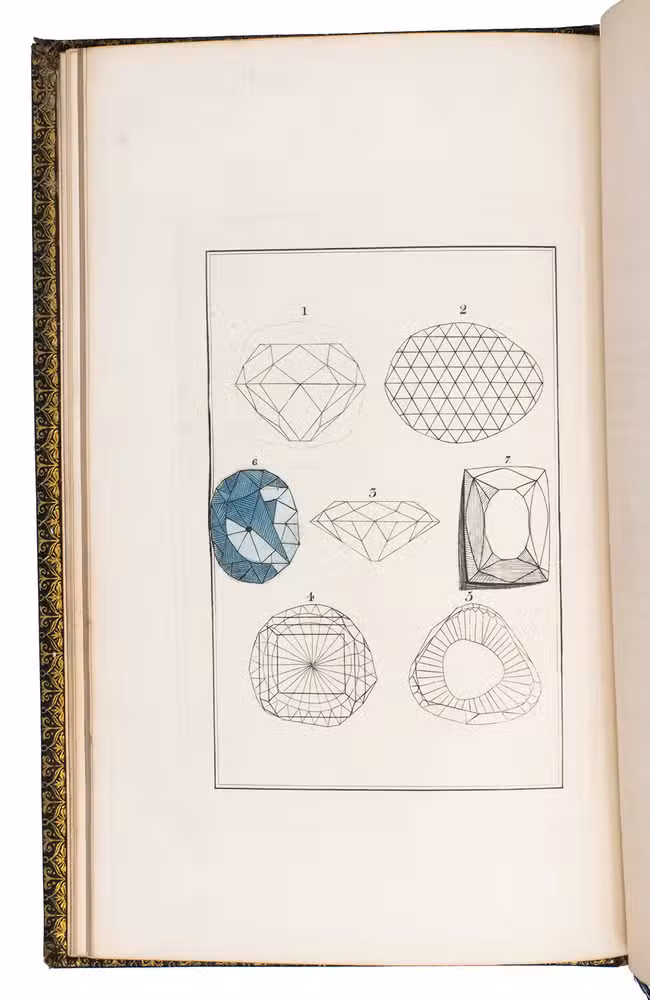 Very rare, revised and expanded third edition of an attractive work on gemstones, written by a jeweller and beautifully bound by British bookbinder Alfred Tarrant (1819-1877) in a typical Victorian style. The first part of the work describes 63 different gemstones, paying special attention to their colours, shapes and geological origin. The second part of the work focusses primarily on diamonds. It devotes a chapter to a few unusual specimen, provides a succinct history of the diamond trade, describes the English and Scottish crown regalia and explains the basics of cutting and polishing diamonds.