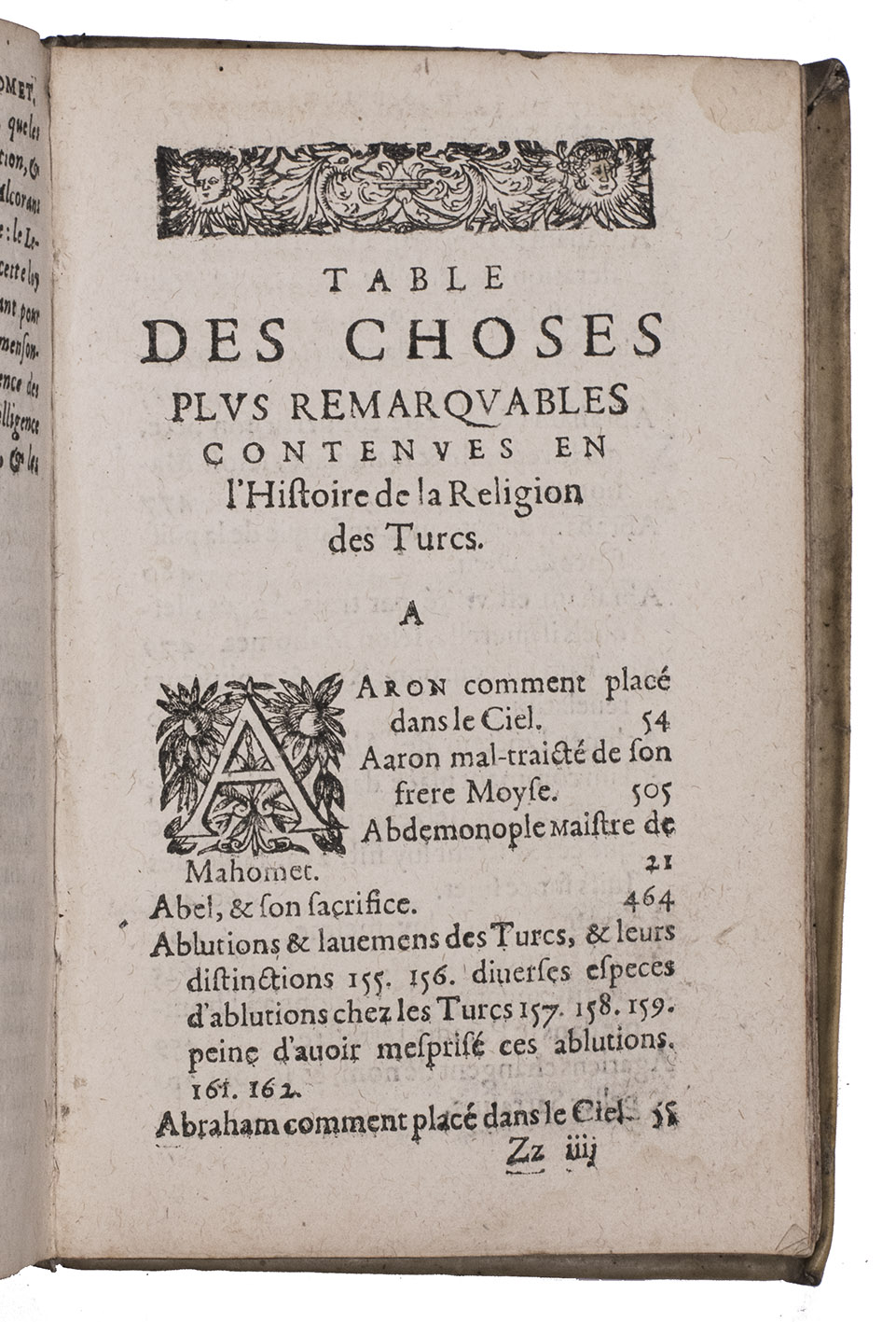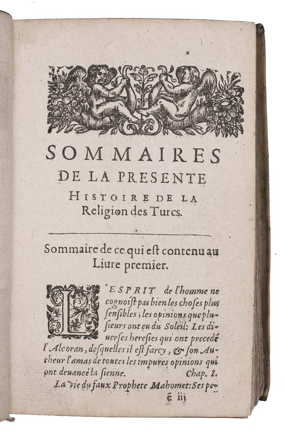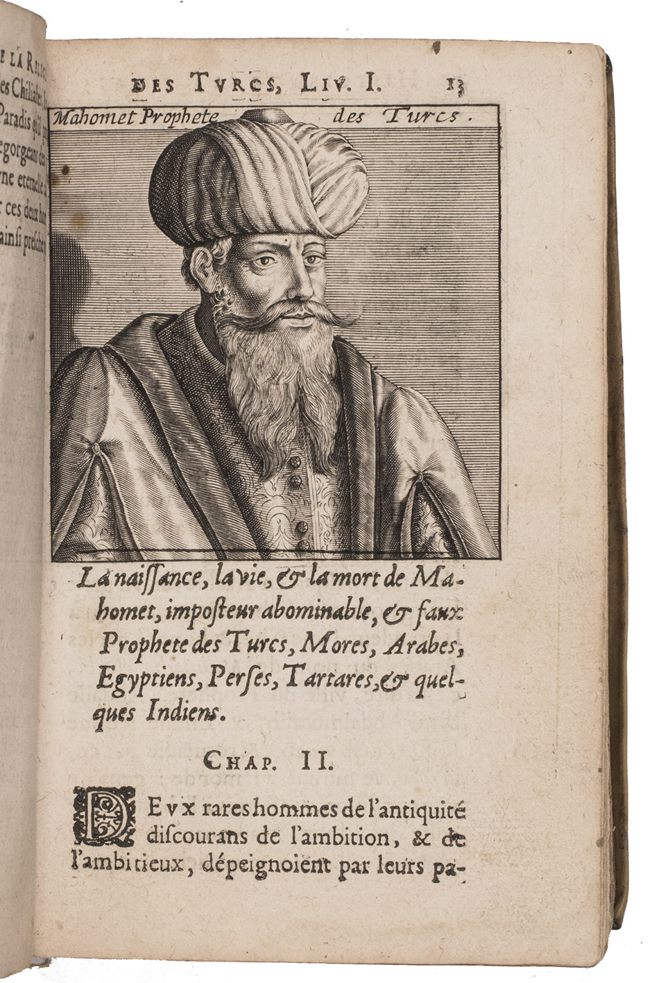 Paris, Jean Guignard, 1632. 8vo. With the controversial half-page engraved portrait of Muhammad. 17th-century(?) vellum, later endpapers. [70], [2 blank], 726, [50] pp.