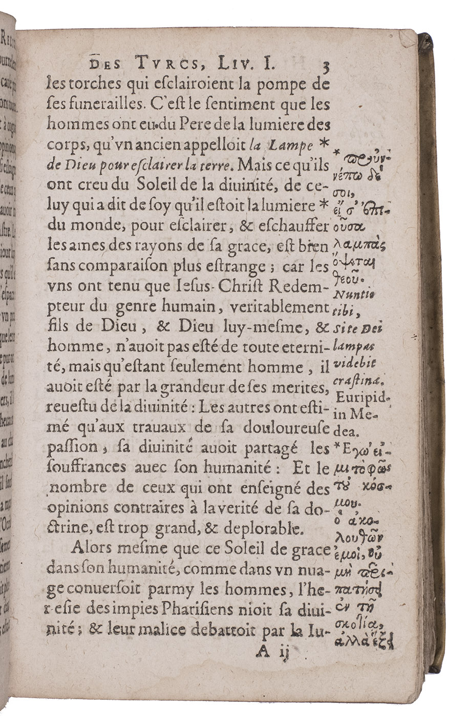 Second edition of "the most complete treatment of Islam up to its time in France" (Atabey). Written by Micheal Baudier (ca. 1589-1645), historiographer to the Court of France. The book is presented as a history of the religion of the Turks, who controlled, at that time, a large part of the Islamic world, and gives a detailed description of Islam and its prophet Muhammad.