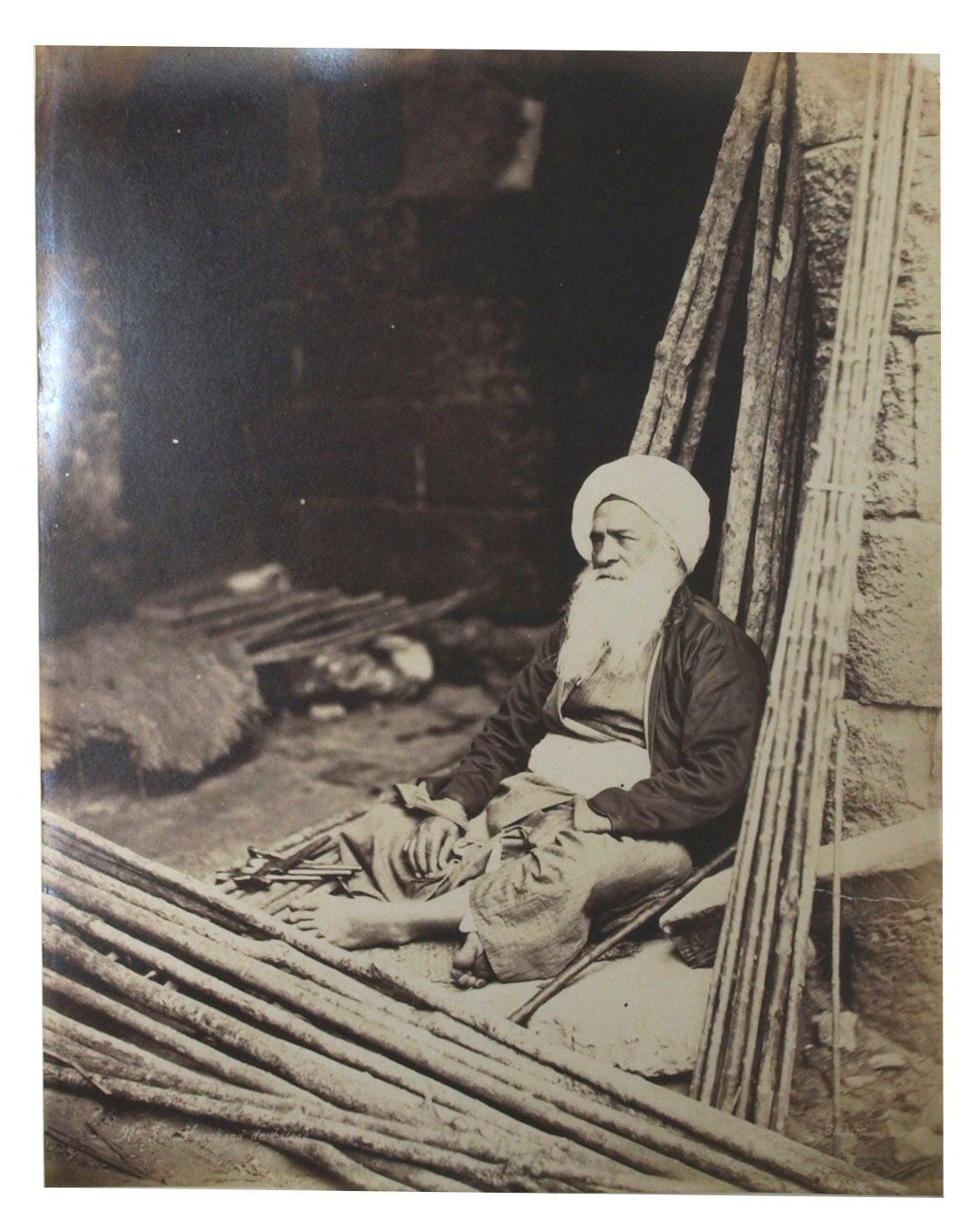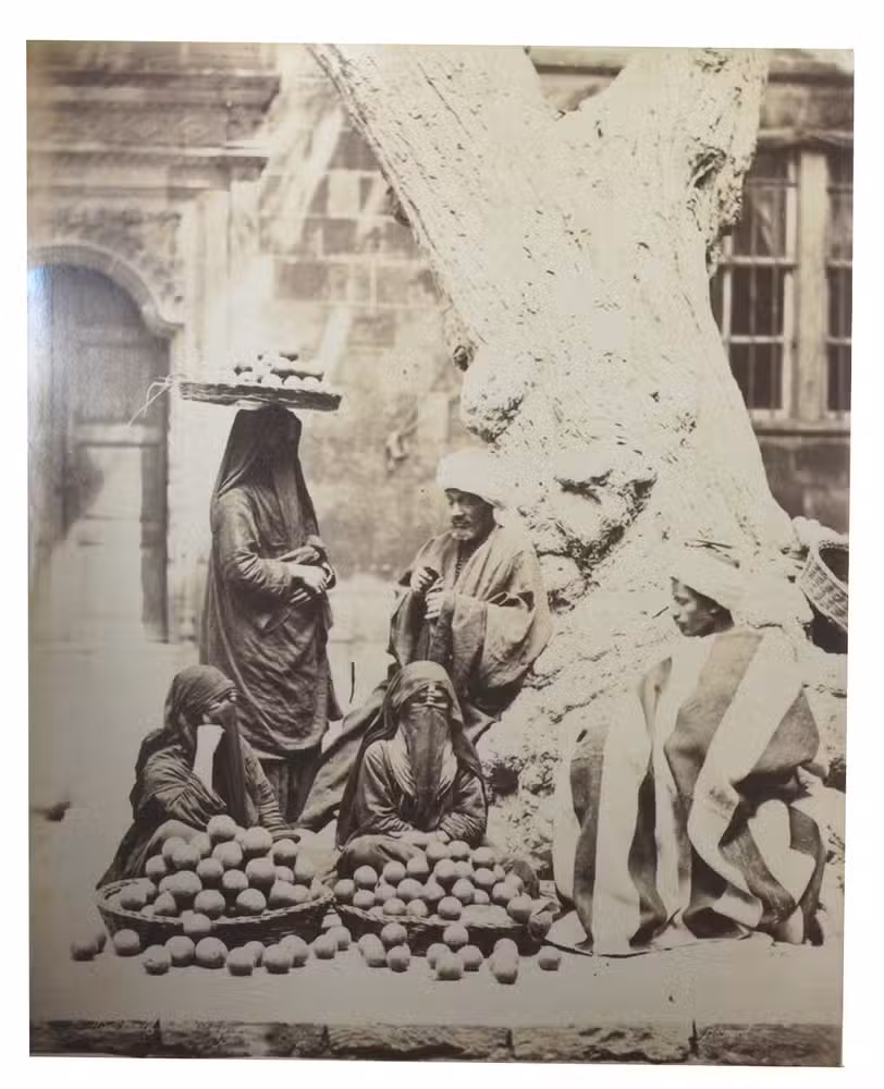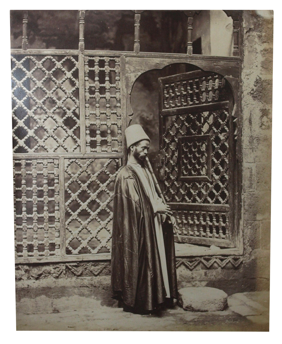 Large and beautiful photographs by Bechard: excellent vintage prints, mostly in superior condition. They represent the popular Egyptian and Nubian types, frequently in close-ups. Nissan N. Perez states that this part of the work of a photographer specializing in views of sites and monuments "has escaped general attention" (cf. Focus East, p. 123, reproducing the photograph of water carriers resting). Includes: a scribe; a sheikh reading the Qur'an, merchants and grocers, a group of ulemas (religious scholars) reading the Qur'an, an Arab drawing water, whirling dervishes, Arab peasants (a fellah carrying water), a sheikh going to the mosque, a game of Mangala, water carriers, mat manufacturers, Sheikh Sadad, a descendant of Mohammed, a falconer, washerwomen, an Arabic singer, a young fellah, a Darabouka player, labourers, a public fountain, a beggar, Arabs at prayer, Arabic coffee, etc.
