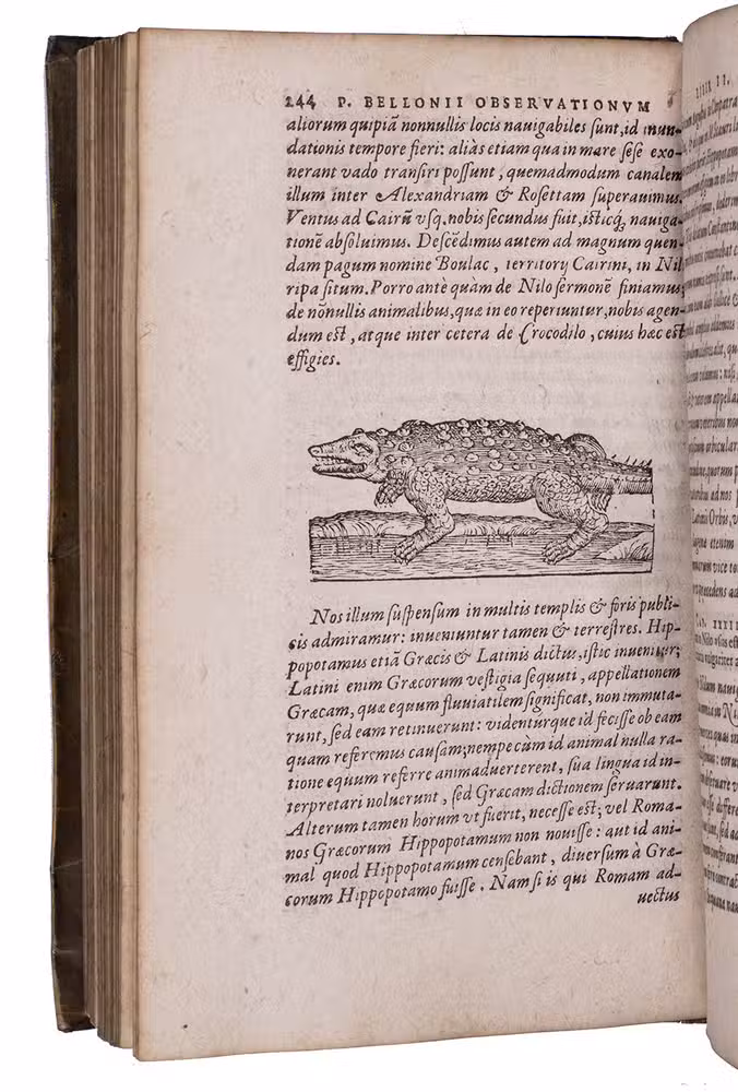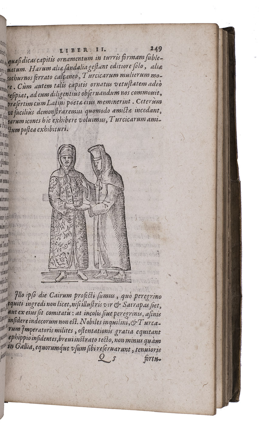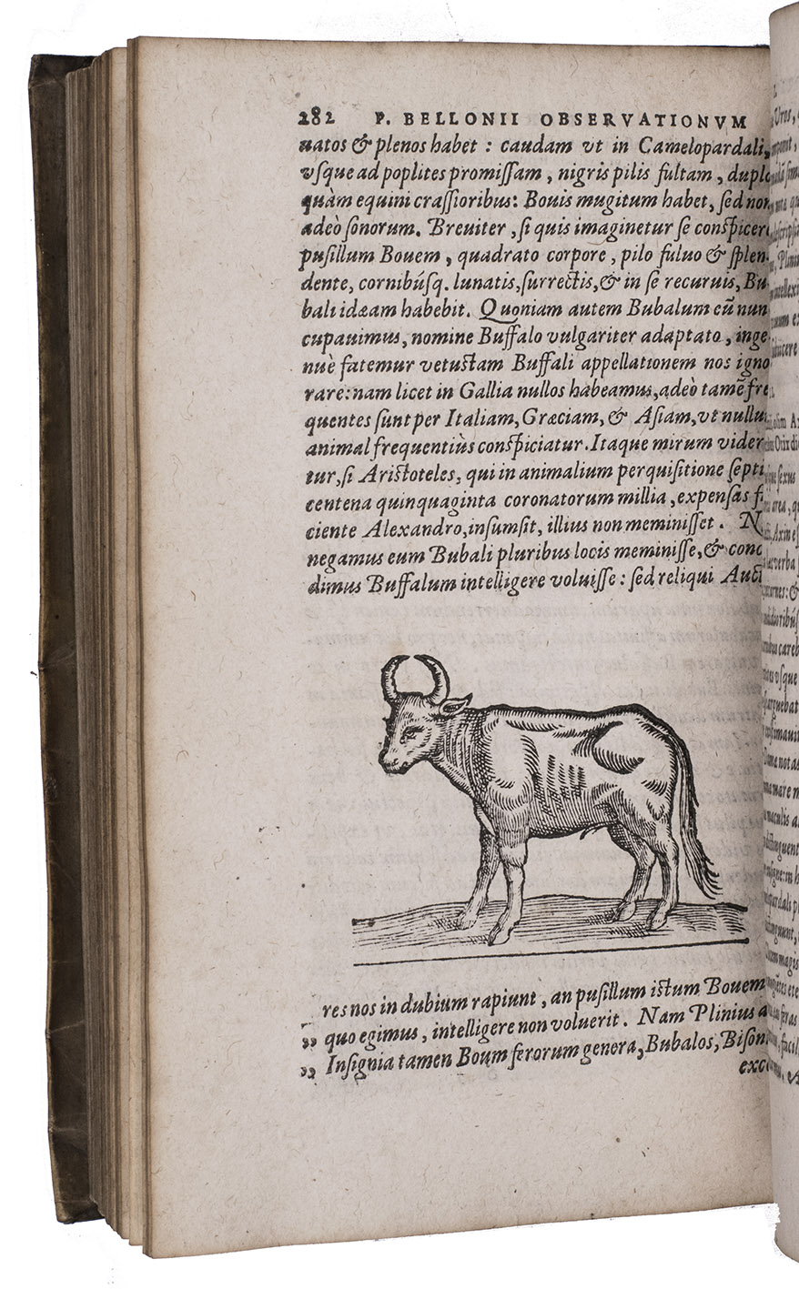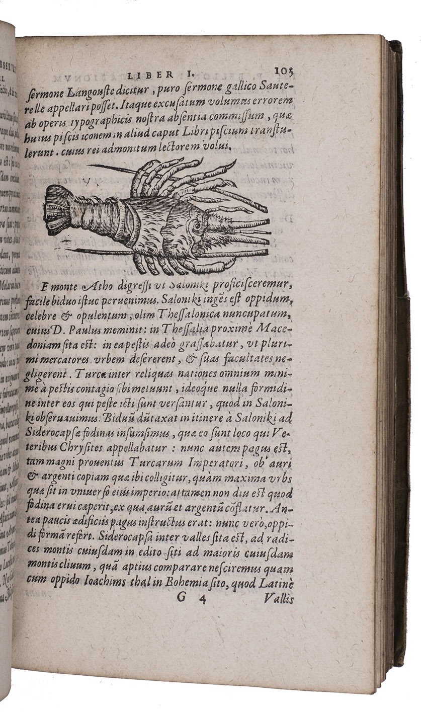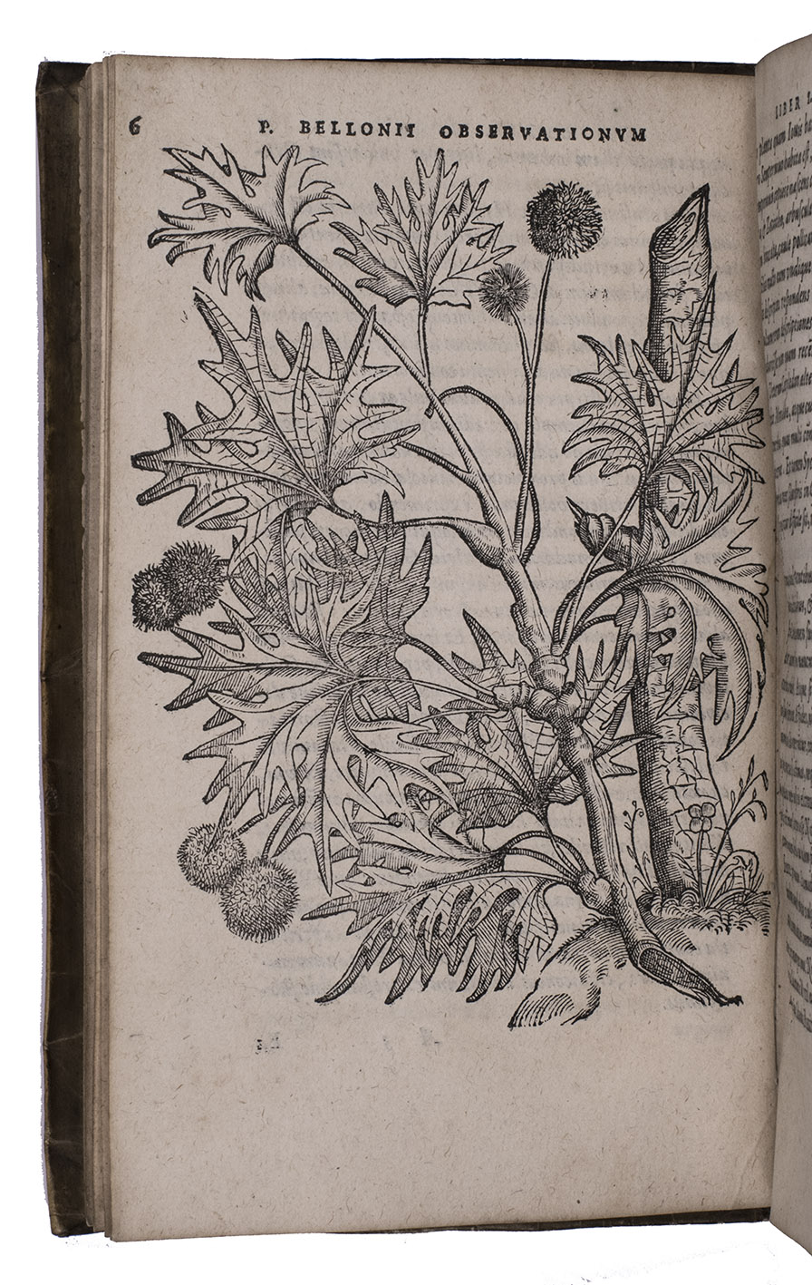 Belon's account of his voyage through the Levant, here in the first Latin edition, by Christoffel Plantin translated (from Plantins 1555 edition in the original French) and with a few additional notes by the great botanist Carolus Clusius, formerly director of the botanical garden of the Holy Roman Emperor Maximilian II at Vienna and later that of Leiden University. From 1546 to 1549 the famous French naturalist Pierre Belon (or Bellon, Belon du Mans; 1517-1564) made a journey through Greece, the Greek Islands, Alexandria, Lower Egypt, Judea, Lebanon, Syria, Turkey and back to Rome. His original intention was to study the indigenous plants, because he had read much about their medicinal value. He also made notes on the religion and customs of the local population and on ancient buildings and other antiquities. He published his findings under the title Les Observations de Plusieurs singularitez & choses memorables, trouvées en Grèce, Asie, Iudée, Egypte, Arabie, & autres pays estranges ... (Paris, 1553). The work received wide attention and Plantin published the first edition outside Paris (Antwerp, 1555): one of the first books he published. Pieter van der Borcht and the woodblock cutter Gerard Janssen van Kampen made the present woodcuts for the present edition after those of Plantin's French edition of 1555 (whose woodcuts had been sold at an auction in 1562). They depict plants and trees, animals, a map of Turkey and a view of Alexandria. Plantins grandson, successor to his Leiden office, published a second Latin edition in 1605. Clusius also translated the second work into Latin, from the first French edition of Belons Les remonstrances sur le default du labour et culture des plantes, et de la connoissance d'icelles, contenant la maniere d'affranchir et apprivoiser les arbres sauvages (Paris 1558). It discusses exotic trees that might be introduced into France.