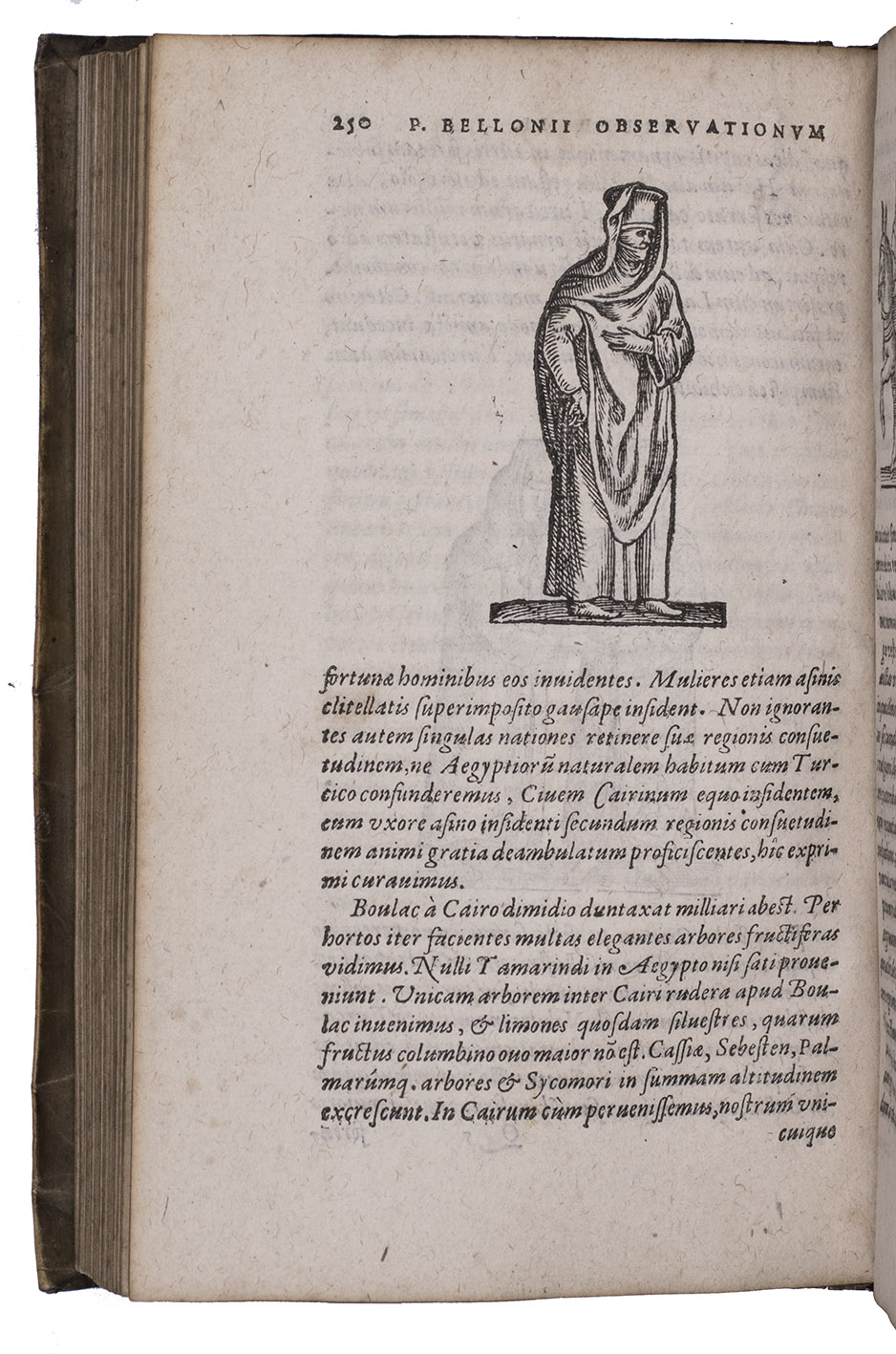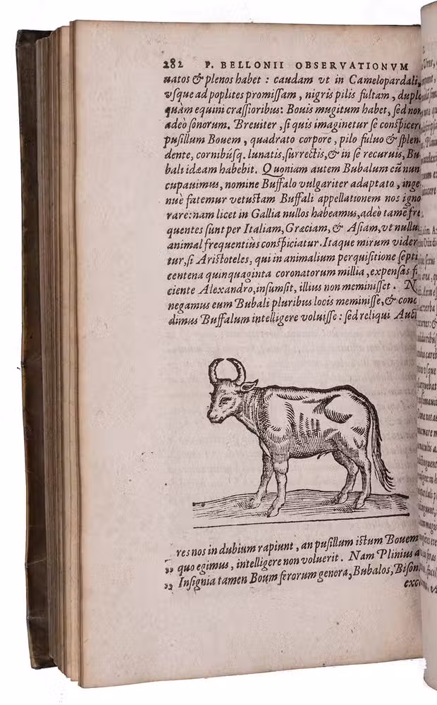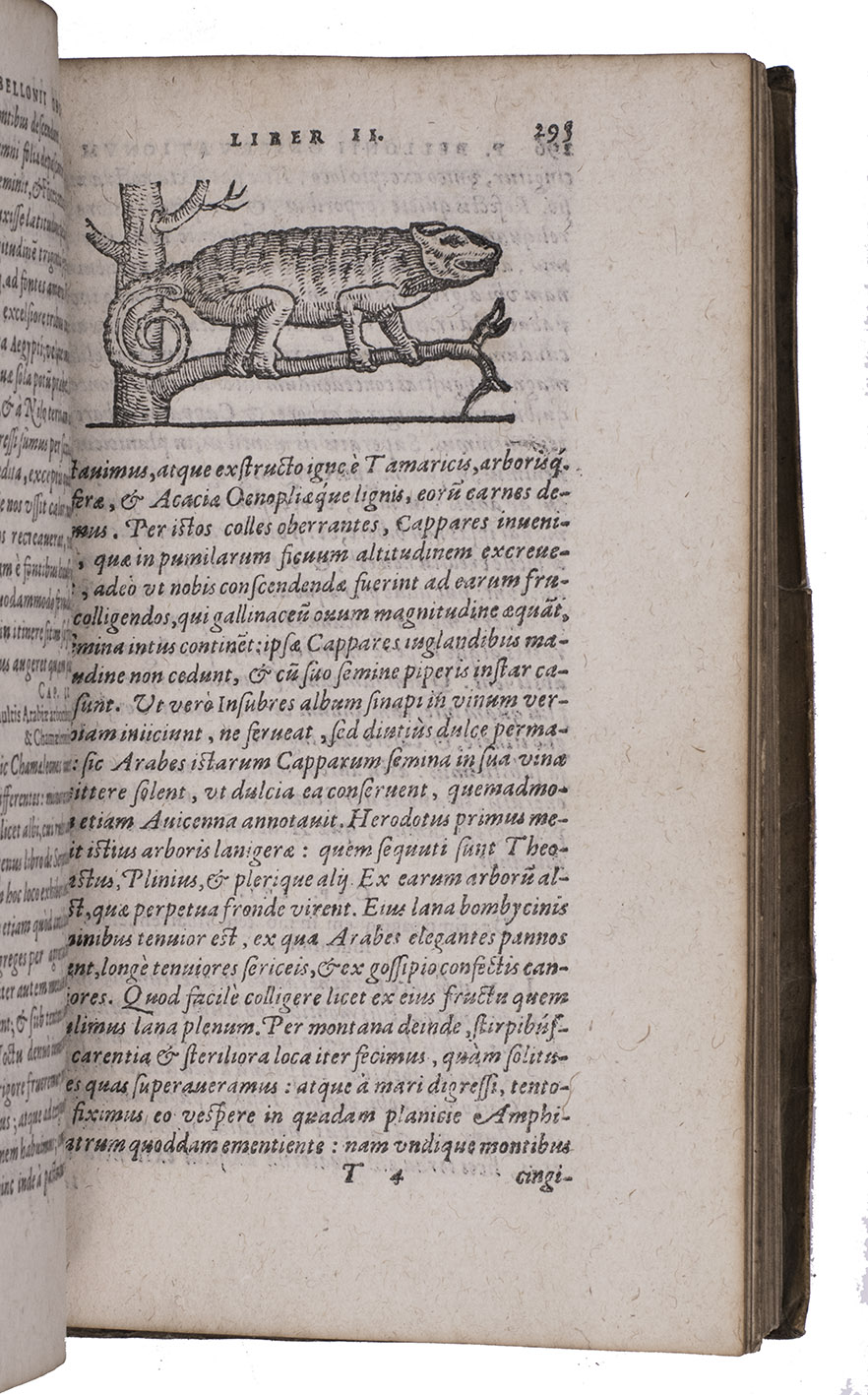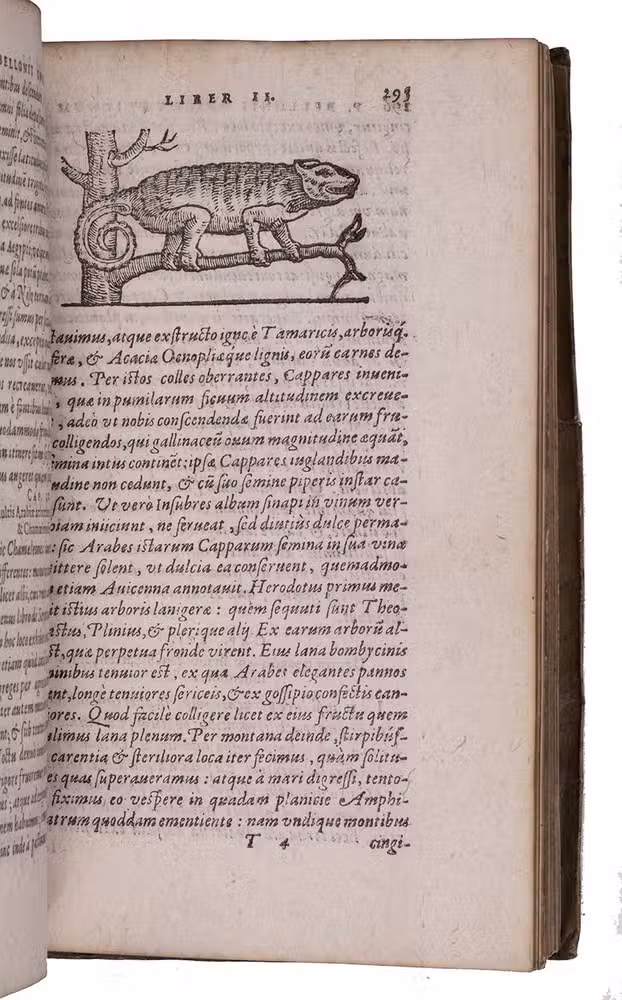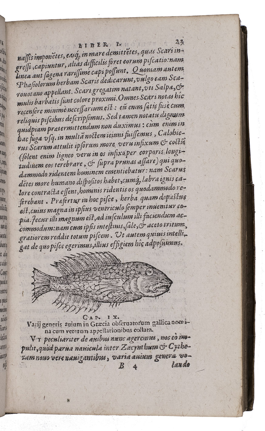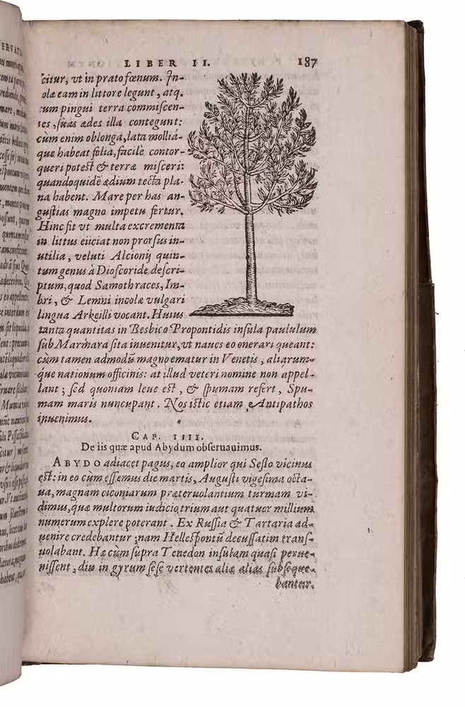Belon's account of his voyage through the Levant, here in the first Latin edition, by Christoffel Plantin translated (from Plantins 1555 edition in the original French) and with a few additional notes by the great botanist Carolus Clusius, formerly director of the botanical garden of the Holy Roman Emperor Maximilian II at Vienna and later that of Leiden University. From 1546 to 1549 the famous French naturalist Pierre Belon (or Bellon, Belon du Mans; 1517-1564) made a journey through Greece, the Greek Islands, Alexandria, Lower Egypt, Judea, Lebanon, Syria, Turkey and back to Rome. His original intention was to study the indigenous plants, because he had read much about their medicinal value. He also made notes on the religion and customs of the local population and on ancient buildings and other antiquities. He published his findings under the title Les Observations de Plusieurs singularitez & choses memorables, trouvées en Grèce, Asie, Iudée, Egypte, Arabie, & autres pays estranges ... (Paris, 1553). The work received wide attention and Plantin published the first edition outside Paris (Antwerp, 1555): one of the first books he published. Pieter van der Borcht and the woodblock cutter Gerard Janssen van Kampen made the present woodcuts for the present edition after those of Plantin's French edition of 1555 (whose woodcuts had been sold at an auction in 1562). They depict plants and trees, animals, a map of Turkey and a view of Alexandria. Plantins grandson, successor to his Leiden office, published a second Latin edition in 1605. Clusius also translated the second work into Latin, from the first French edition of Belons Les remonstrances sur le default du labour et culture des plantes, et de la connoissance d'icelles, contenant la maniere d'affranchir et apprivoiser les arbres sauvages (Paris 1558). It discusses exotic trees that might be introduced into France.
