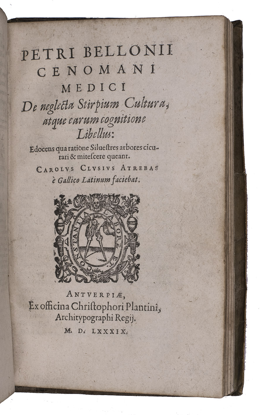 (2) BELON, Pierre. De neglecta stirpium cultura, atque earum cognitione libellus: edocens qua ratione silvestres arbores cicurari & mitescere queant. Antwerp, Christoffel Plantin, 1589. 2 works in 1 volume. 8vo. With Plantins woodcut compasses device on each title-page, 43 woodcuts in text (6 full-page), woodcut decorated initials. With an unrecorded 2-page corrigenda leaf. Contemporary overlapping limp vellum. [16], 495, [1 blank]; "78" [= 87], [1 blank], [2] pp.