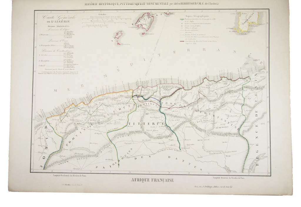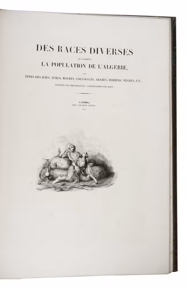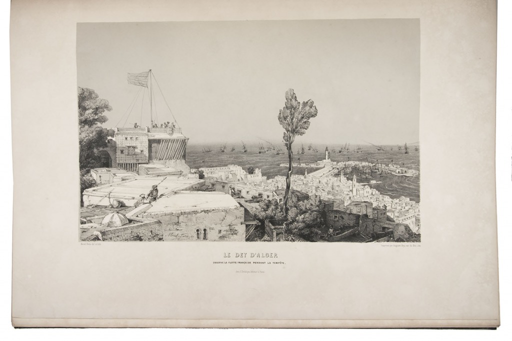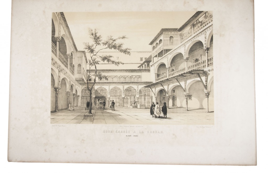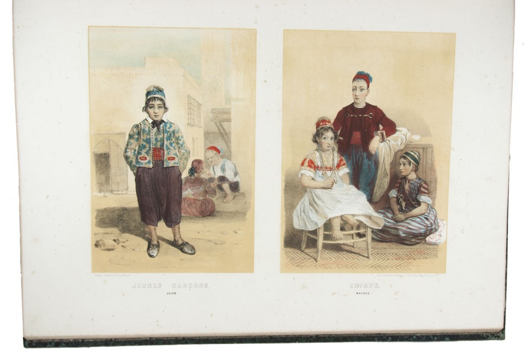 First and only edition of a rare and extensive work on Algeria, with hundreds of stunning and very skilfully executed illustrations, the text by the conservator of the library in the Museum of Algiers, Louis Adrien Berbrugger (1801-1869). Parts 1 to 4 cover the four Algerian provinces: Alger, Oran, Bone and Constantine, while part 5 is subdivided into ethnic groups (Jews, Turks, Moors, Berbers and some of the nomadic peoples), coins and flora, with the plants arranged according to Jussieu's system. The 133 beautifully executed lithographed plates also show city views, landscapes, portraits, costumes, scenes from daily life with people from a wide variety of professions and various layers of society, etc. They give a lively and realistic portrait of a country in which many different peoples and cultures coexist. They also show Algeria part way through its gradual conquest by France in the years 1830 to 1848, capturing and preserving images of both the survivals from hundreds of years as an Ottoman state and the early interactions with European society.