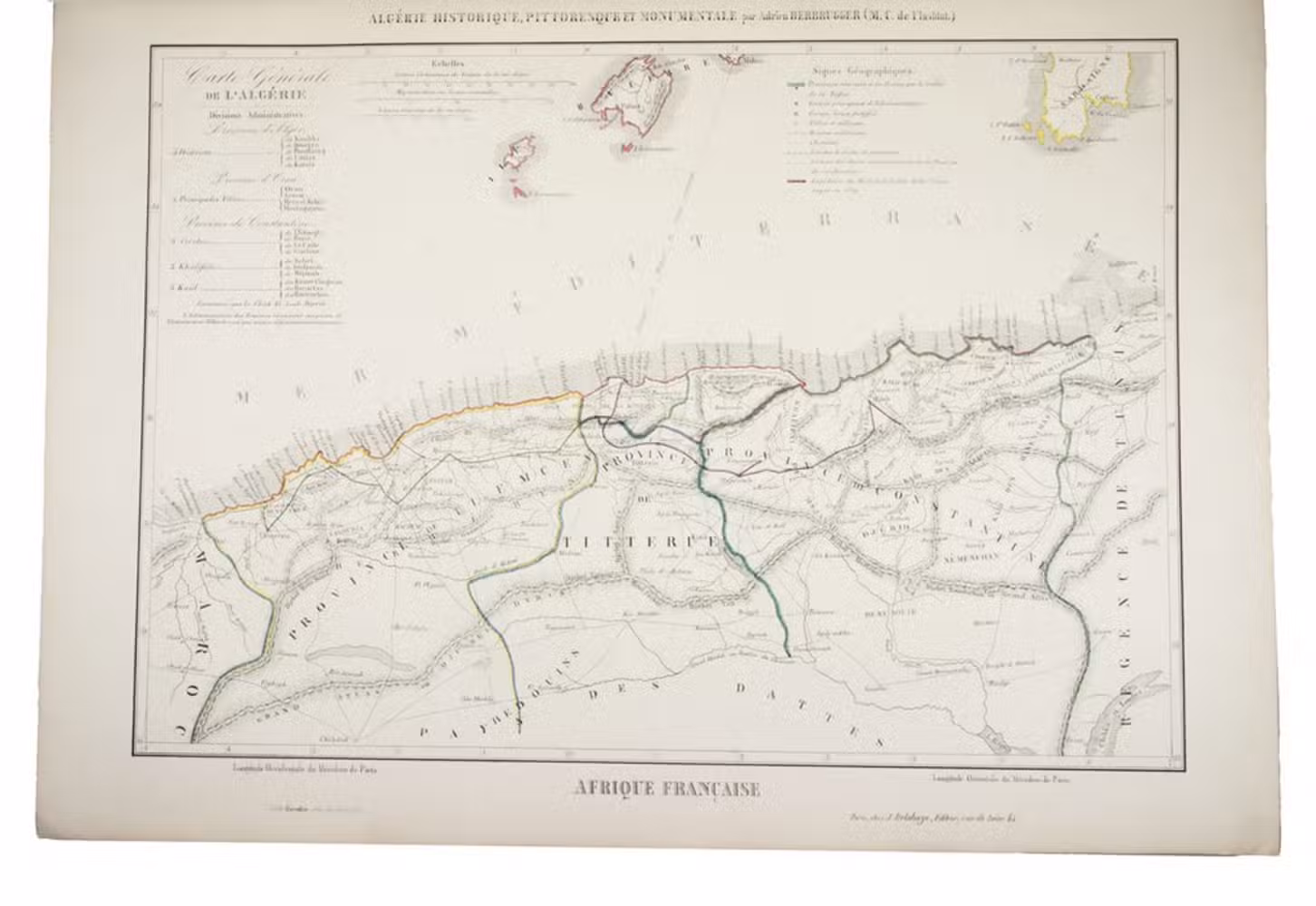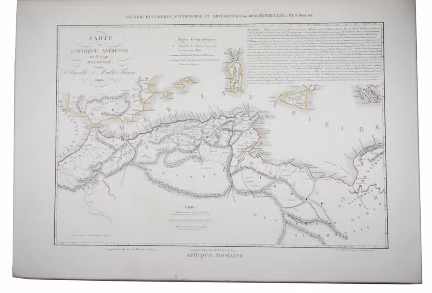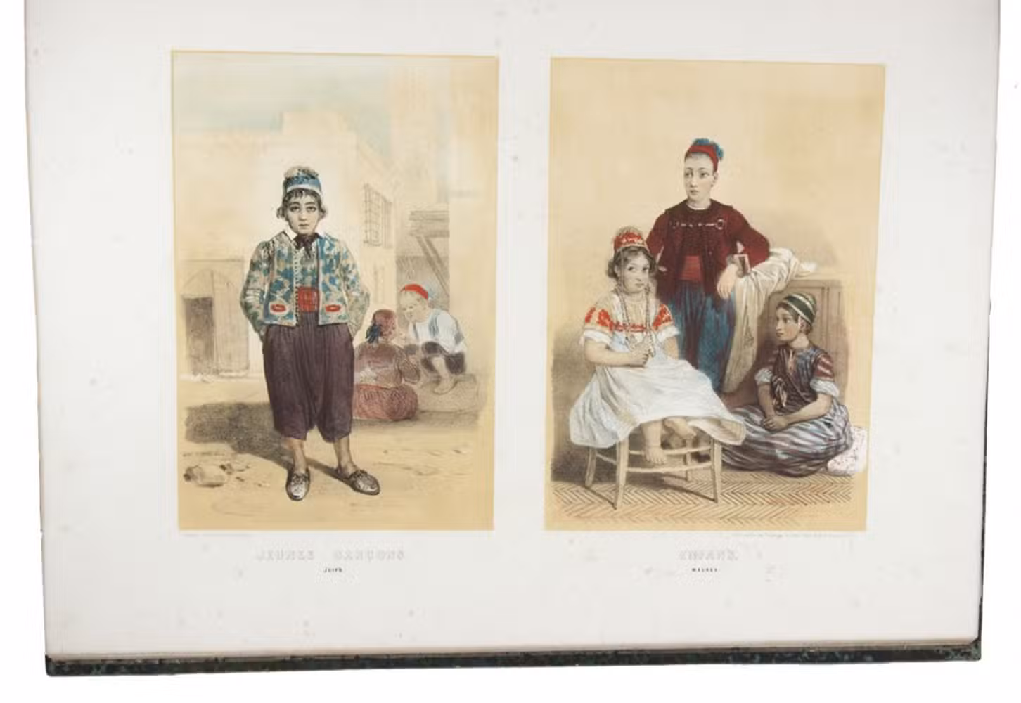 First and only edition of a rare and extensive work on Algeria, with hundreds of stunning and very skilfully executed illustrations, the text by the conservator of the library in the Museum of Algiers, Louis Adrien Berbrugger (1801-1869). Parts 1 to 4 cover the four Algerian provinces: Alger, Oran, Bone and Constantine, while part 5 is subdivided into ethnic groups (Jews, Turks, Moors, Berbers and some of the nomadic peoples), coins and flora, with the plants arranged according to Jussieu's system. The 133 beautifully executed lithographed plates also show city views, landscapes, portraits, costumes, scenes from daily life with people from a wide variety of professions and various layers of society, etc. They give a lively and realistic portrait of a country in which many different peoples and cultures coexist. They also show Algeria part way through its gradual conquest by France in the years 1830 to 1848, capturing and preserving images of both the survivals from hundreds of years as an Ottoman state and the early interactions with European society.